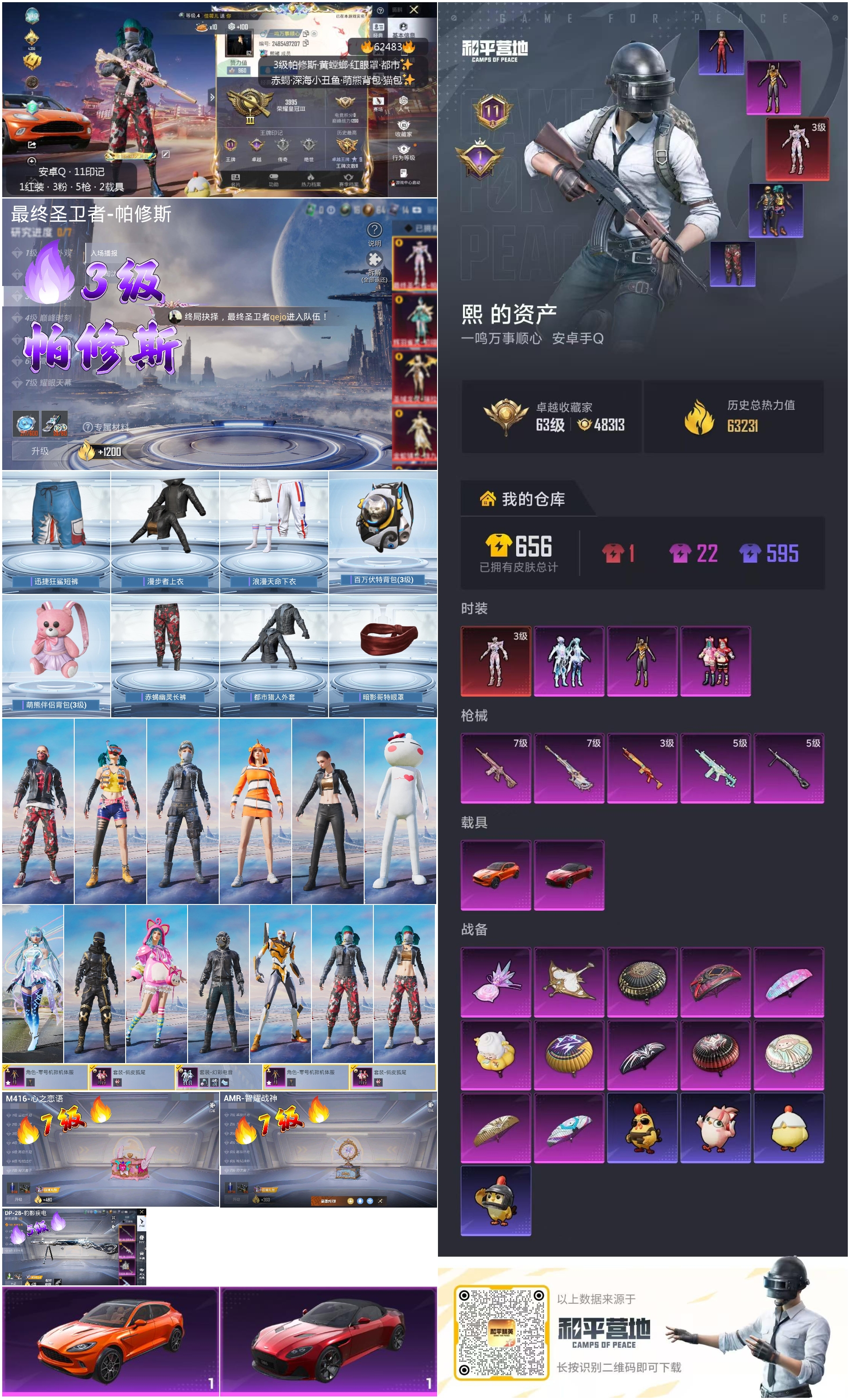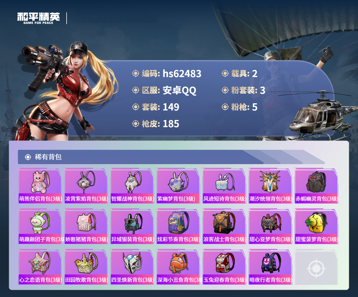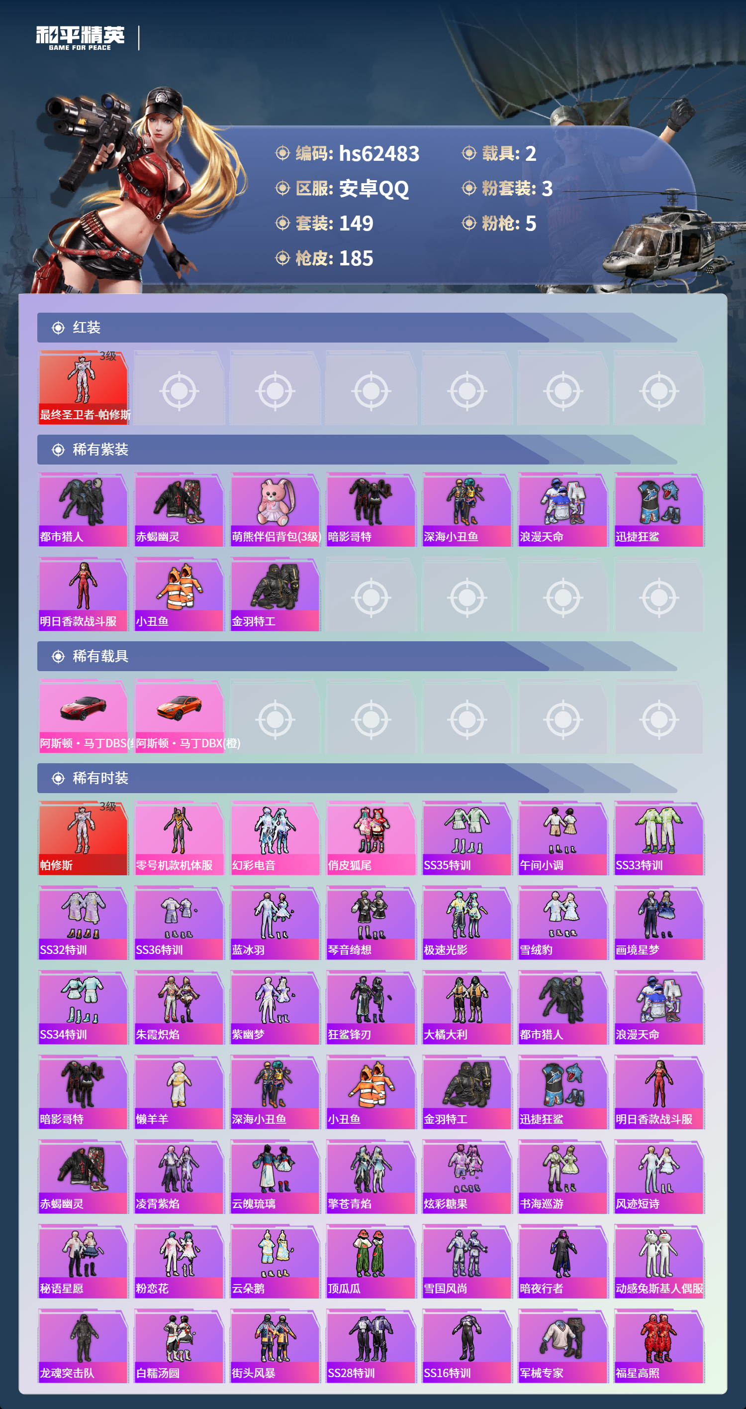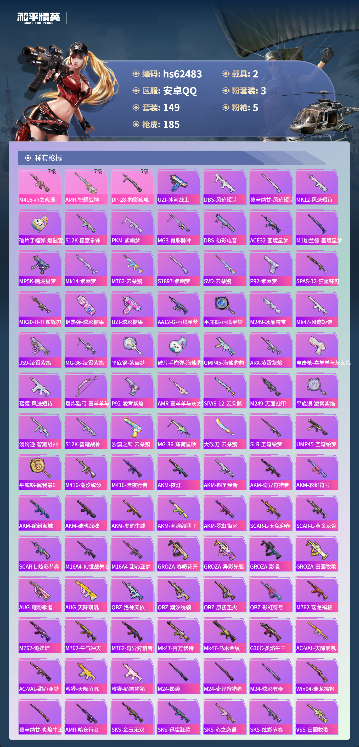 hs62483 安卓手Q-11王牌印记-1红装-3粉装-5特效枪-2载具-63231热力值-149套装-185枪皮-1卓越印记