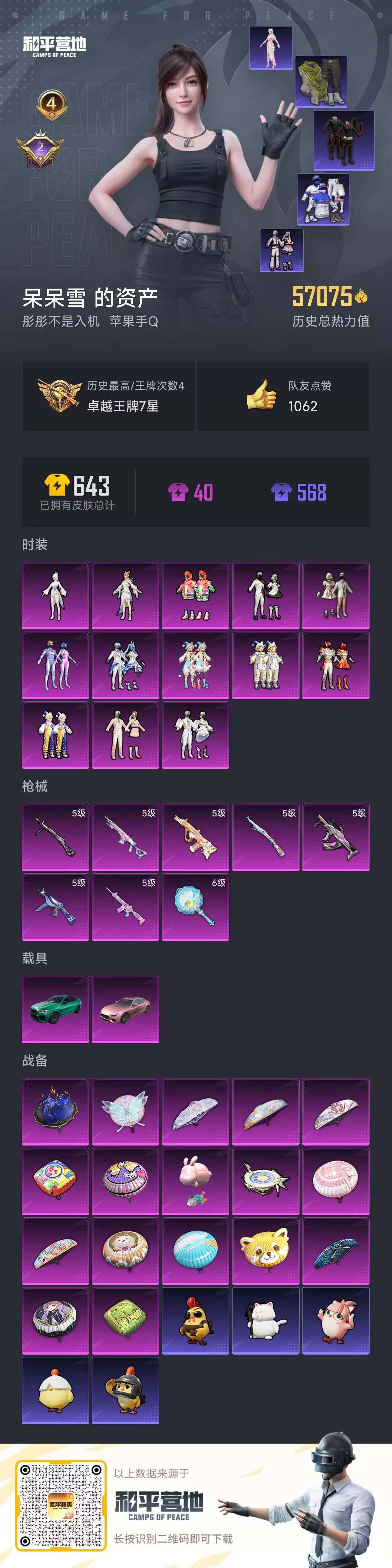苹果 手Q-13粉装-8特效枪-2载具-1粉色飞行器-57075热力值-4王牌印记-123套装-179枪皮