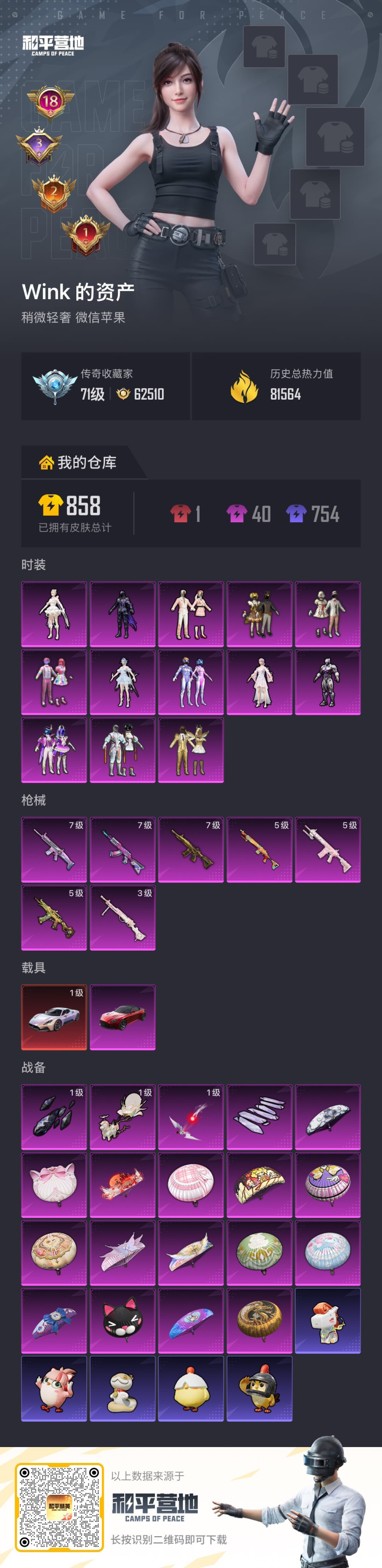 18王牌印记-13粉装-7特效枪-2载具-81564热力值-188套装-217枪皮-3卓越印记-2传奇印记