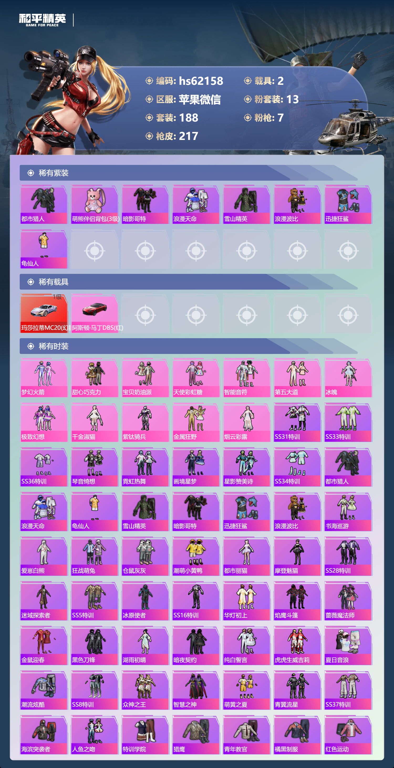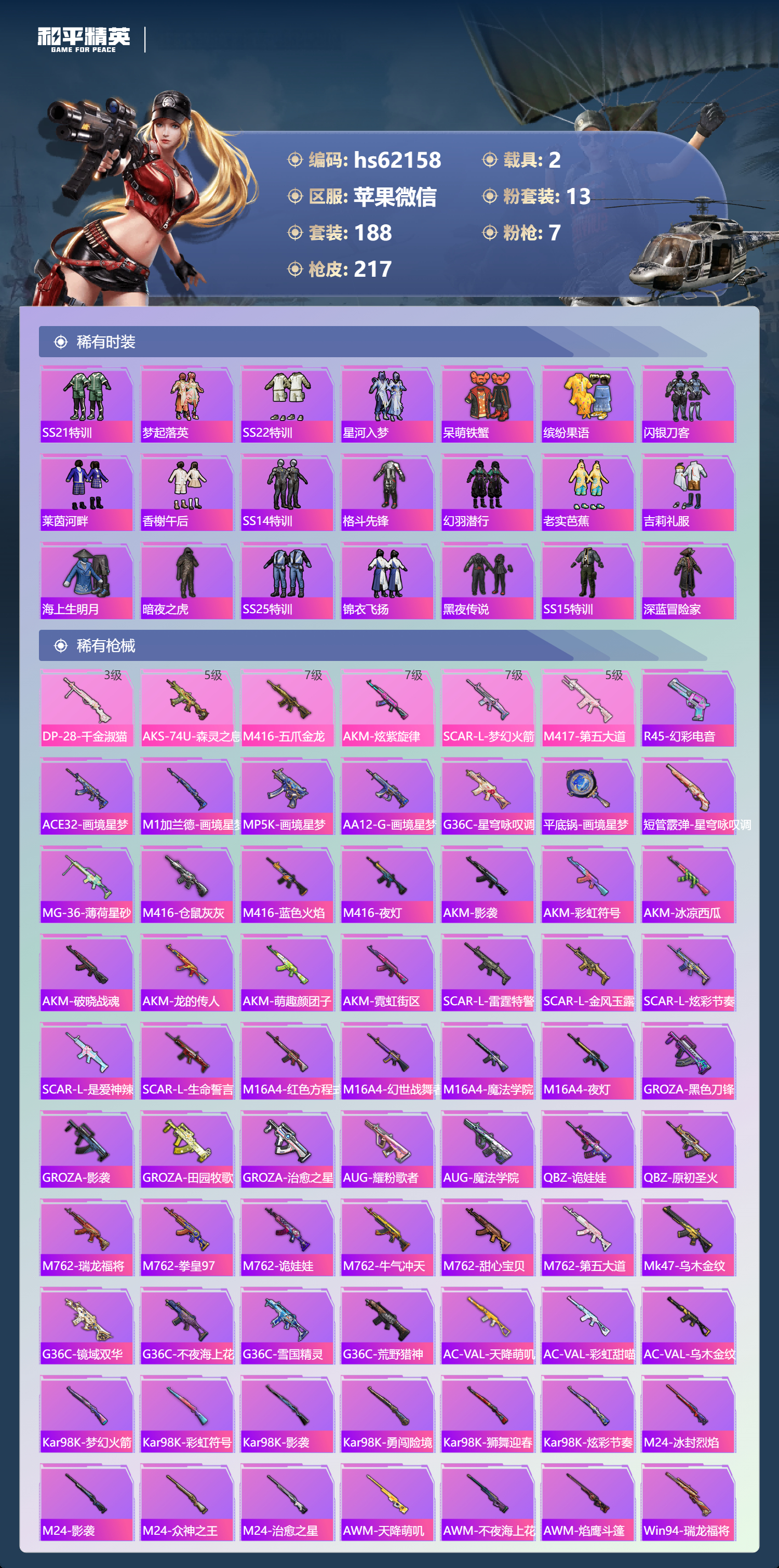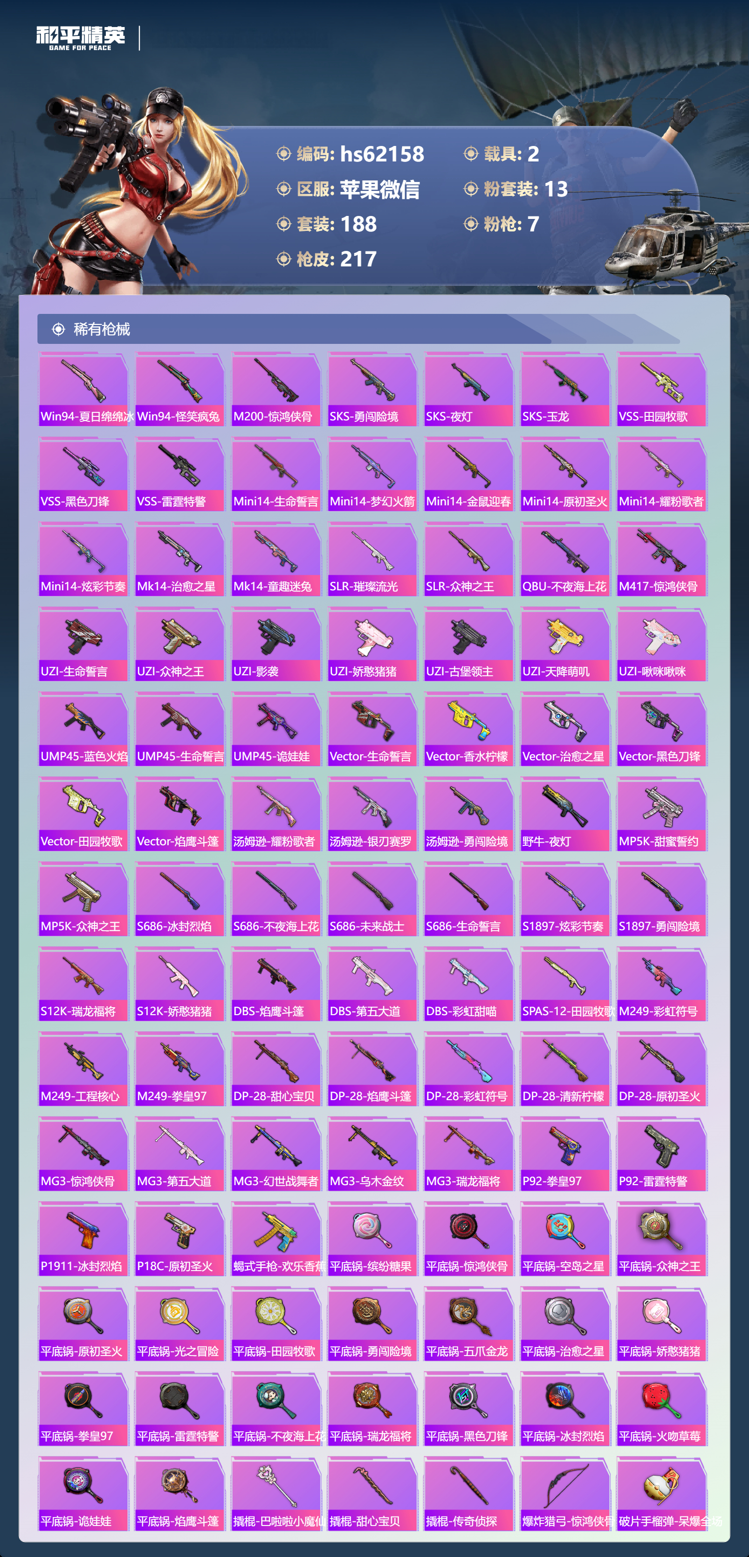 hs62158 苹果微信-18王牌印记-13粉装-7特效枪-2载具-81564热力值-188套装-217枪皮-3卓越印记-2传奇印记