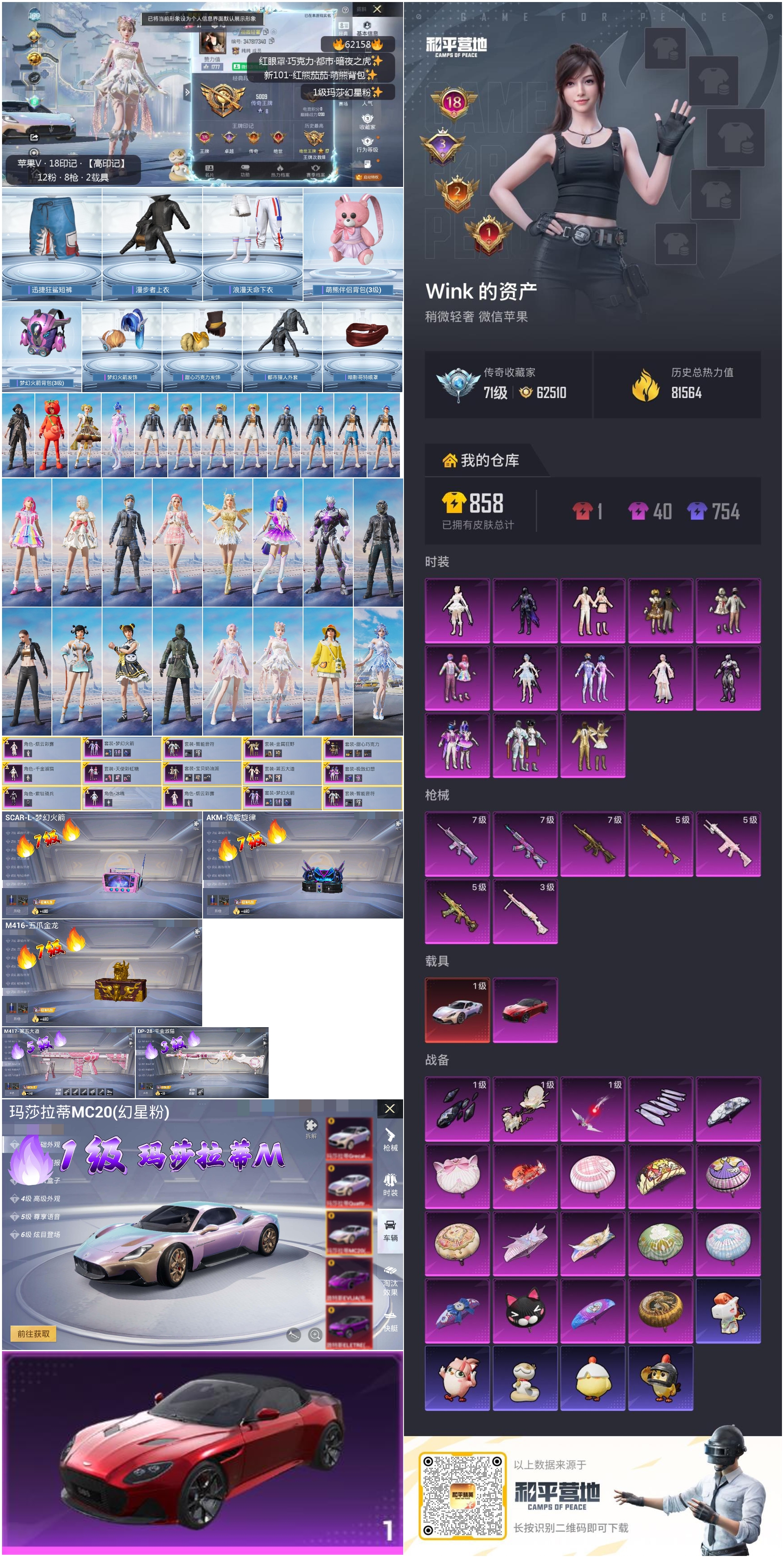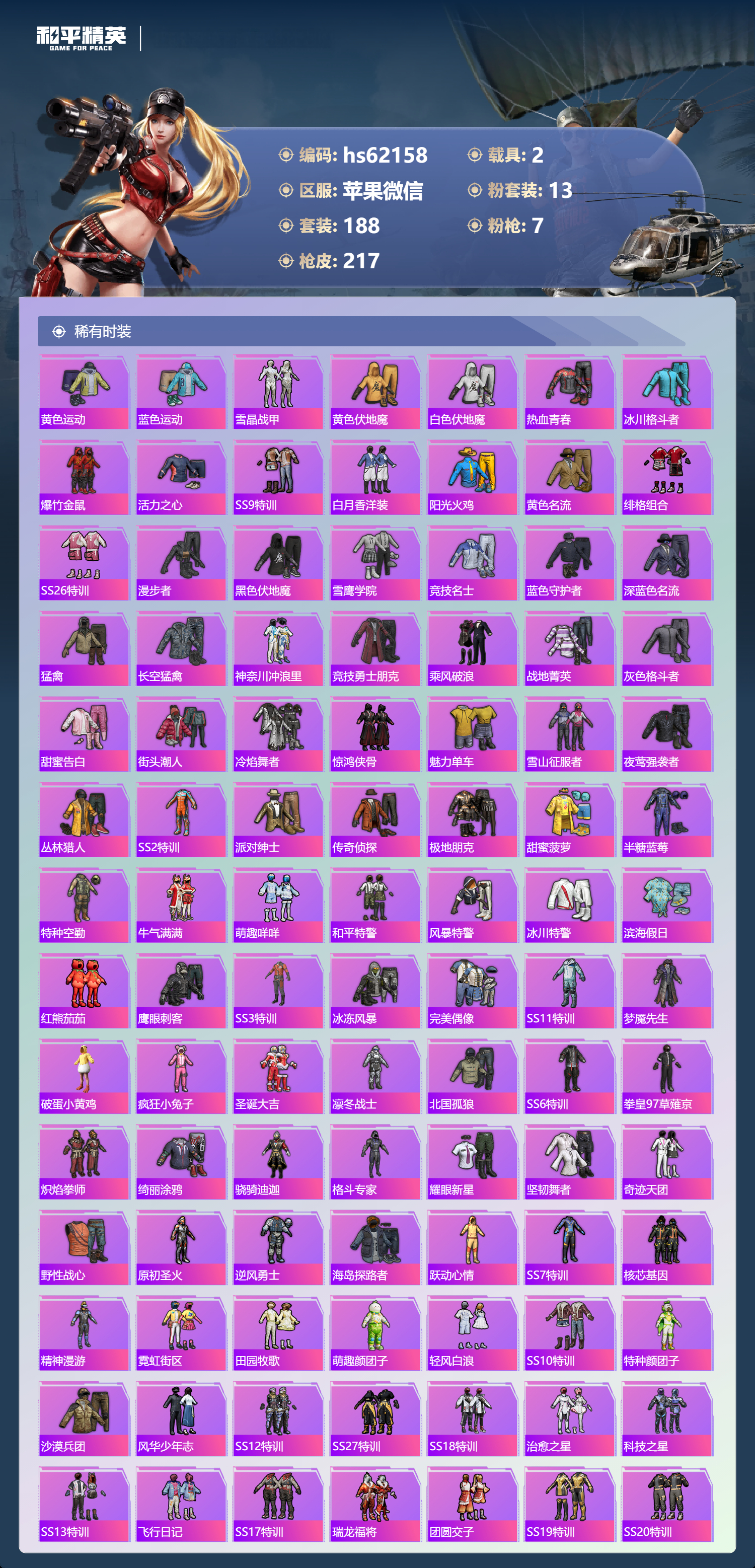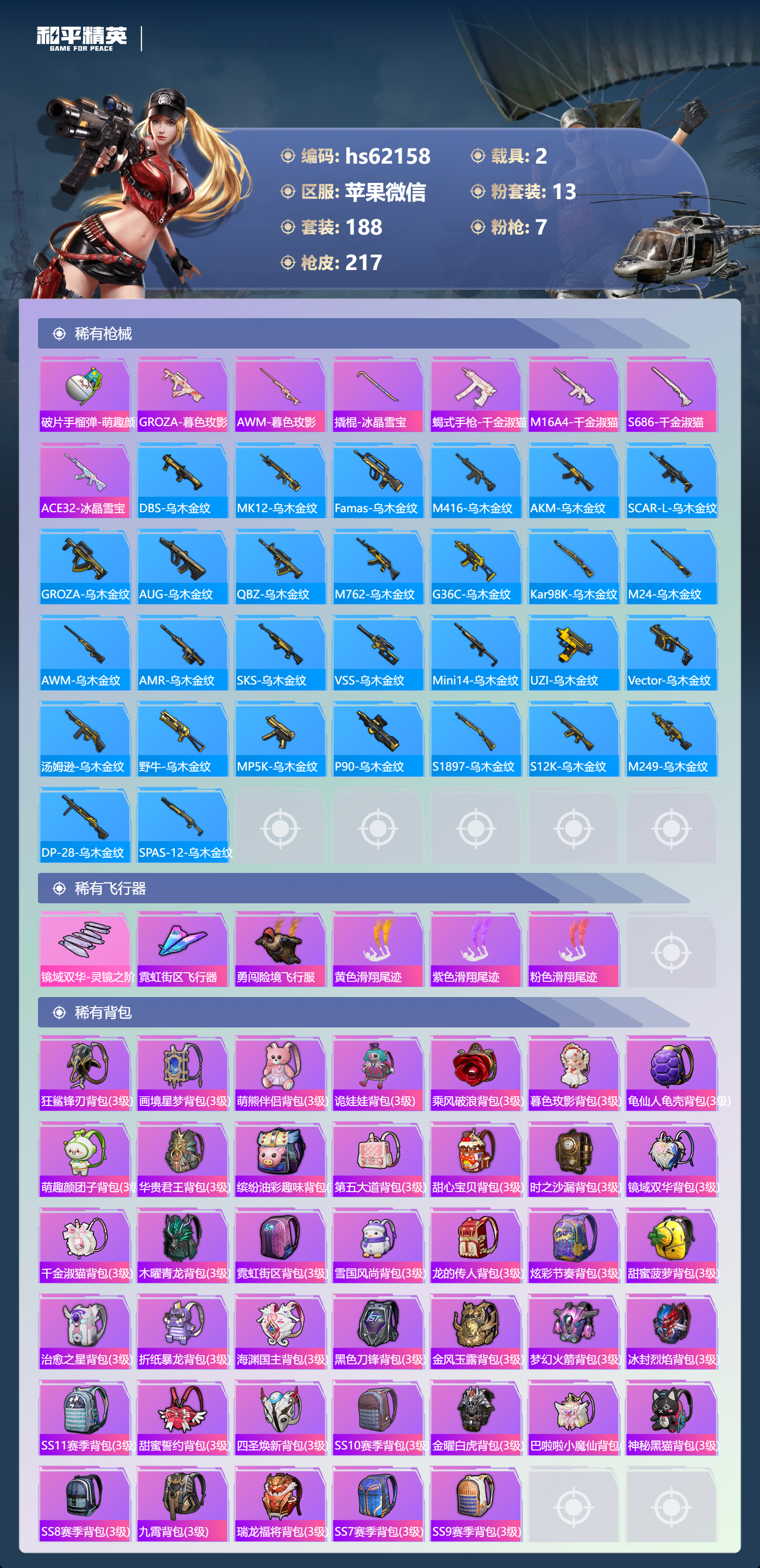 hs62158 苹果微信-18王牌印记-13粉装-7特效枪-2载具-81564热力值-188套装-217枪皮-3卓越印记-2传奇印记