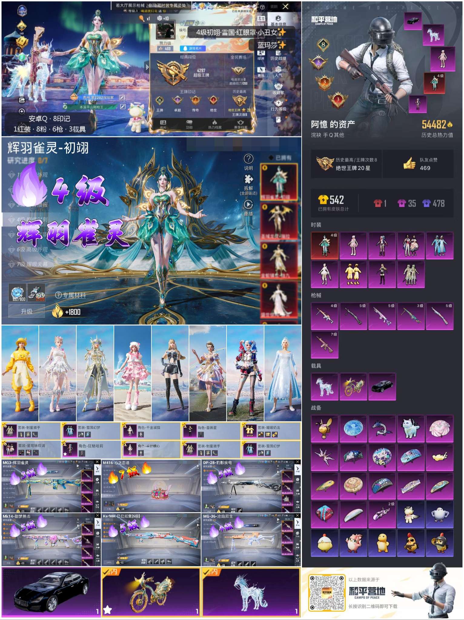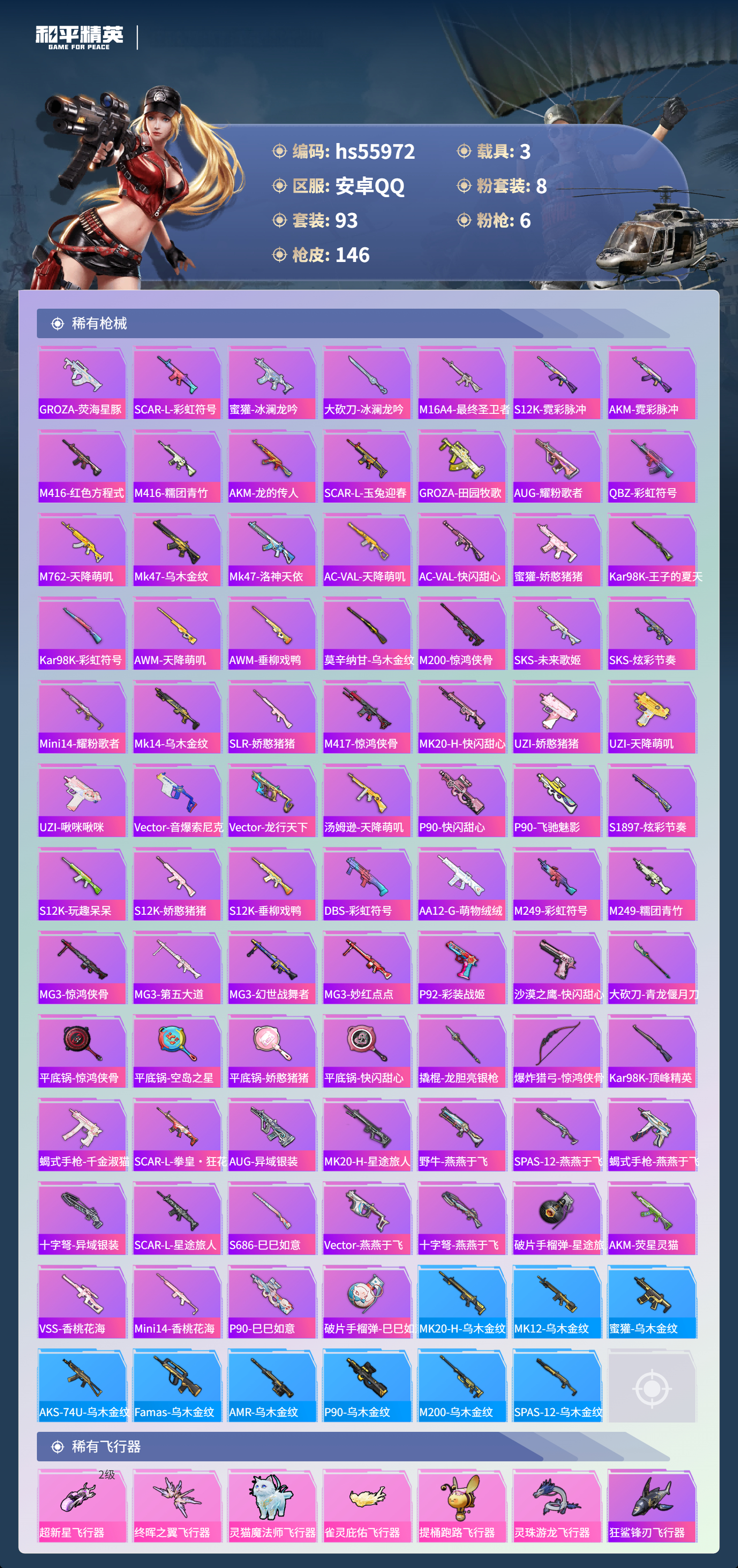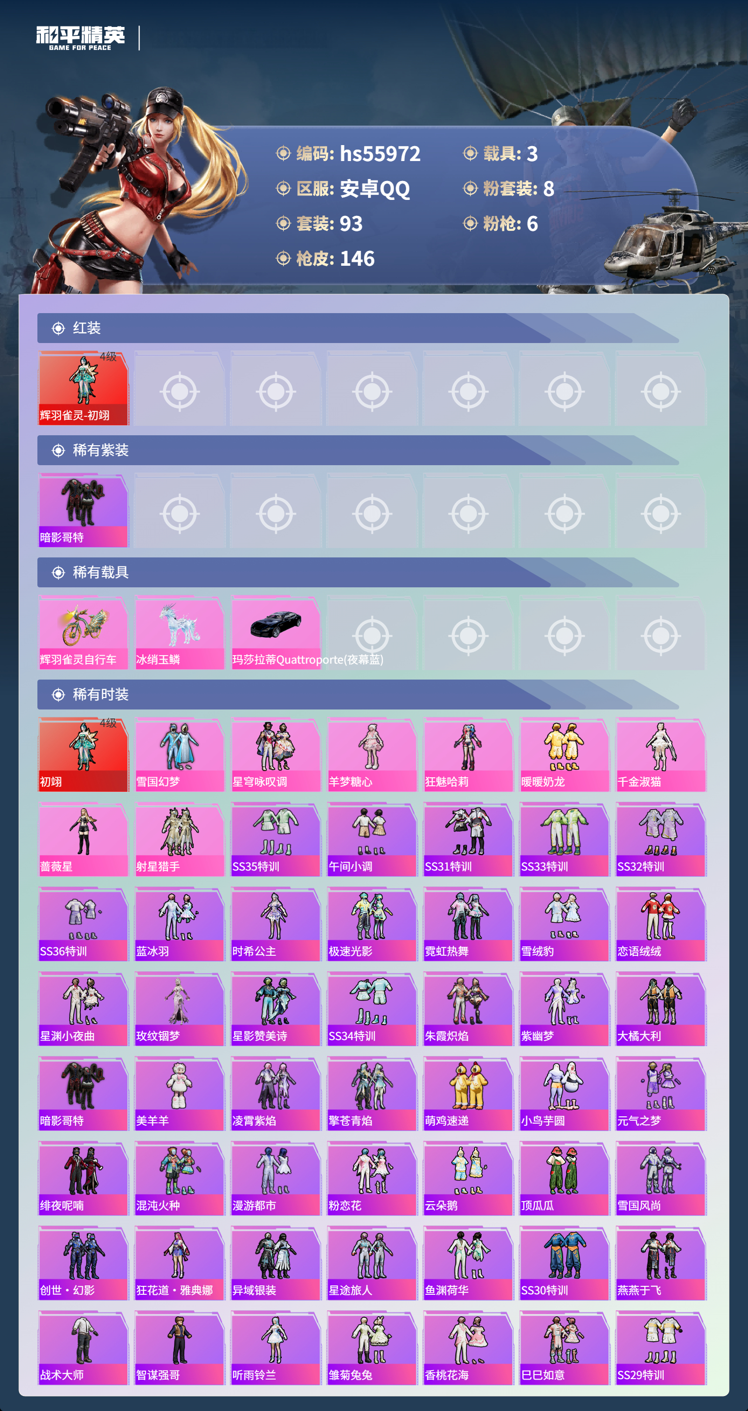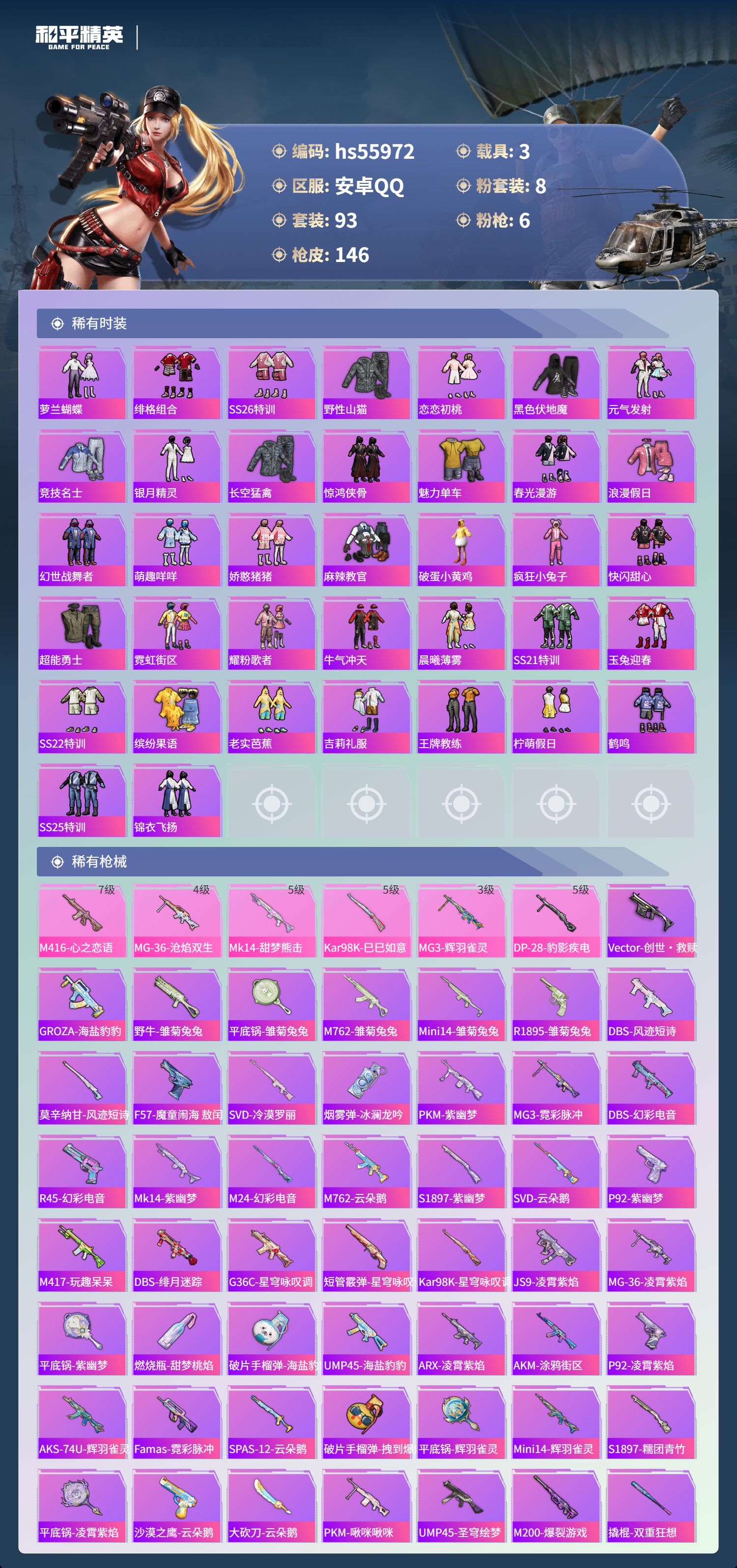 hs55972 安卓手Q-8王牌印记-1红装-8粉装-6特效枪-3载具-54482热力值-93套装-146枪皮-3卓越印记-3传奇印记