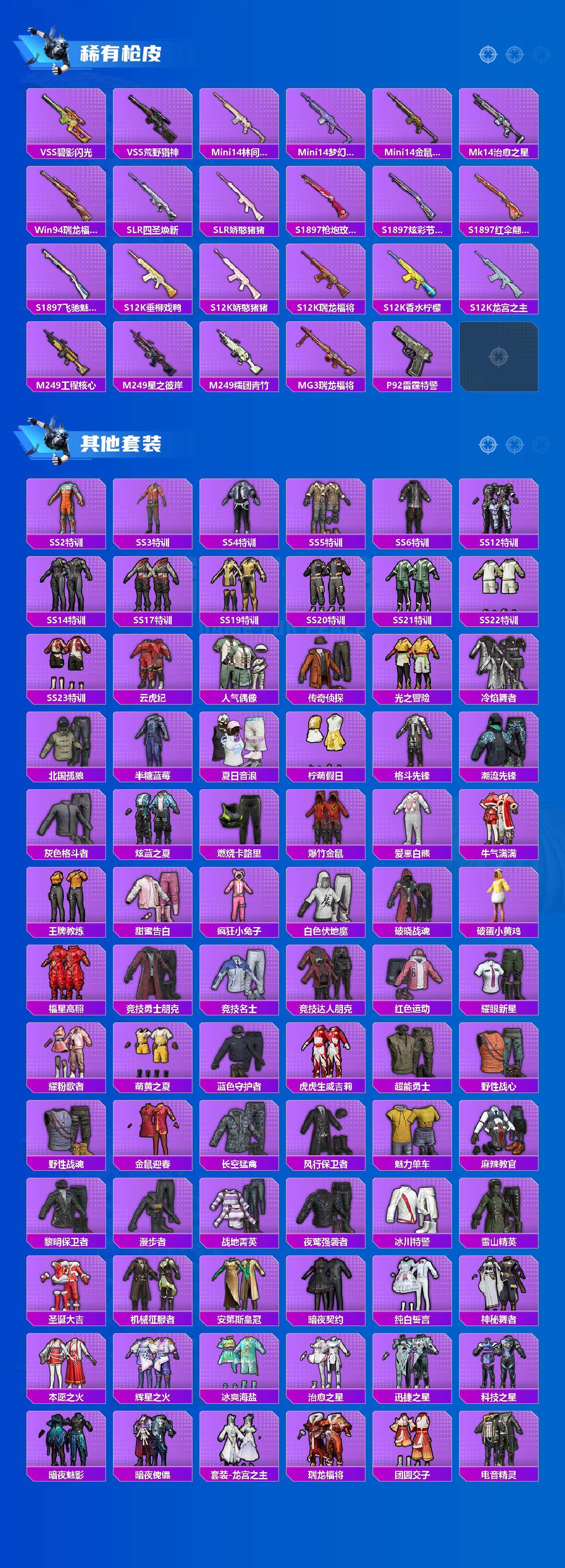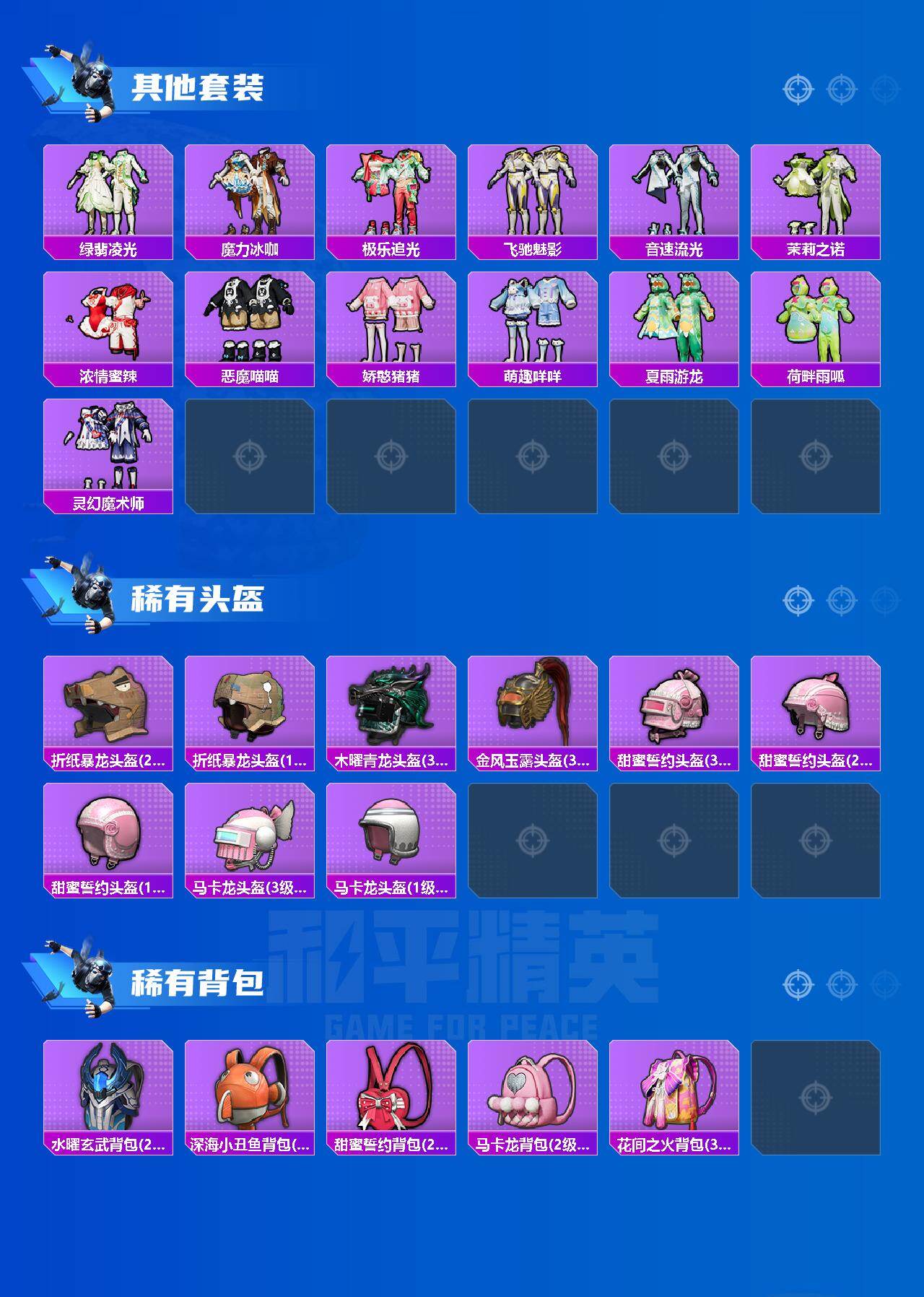 【粉色套装】:粉装-苍蓝魅影,粉装-炙焰红王,粉装-蜜桃特工,粉装-彩虹鹿灵,粉装-山涧鹿灵,角色-洛天依,粉装-花影阑珊,粉装-俏雪含霜,粉装-吟月归客,粉装-黄伞悠悠,粉装-薄荷物语,角色-复仇流浪者,粉装-垂柳戏鸭