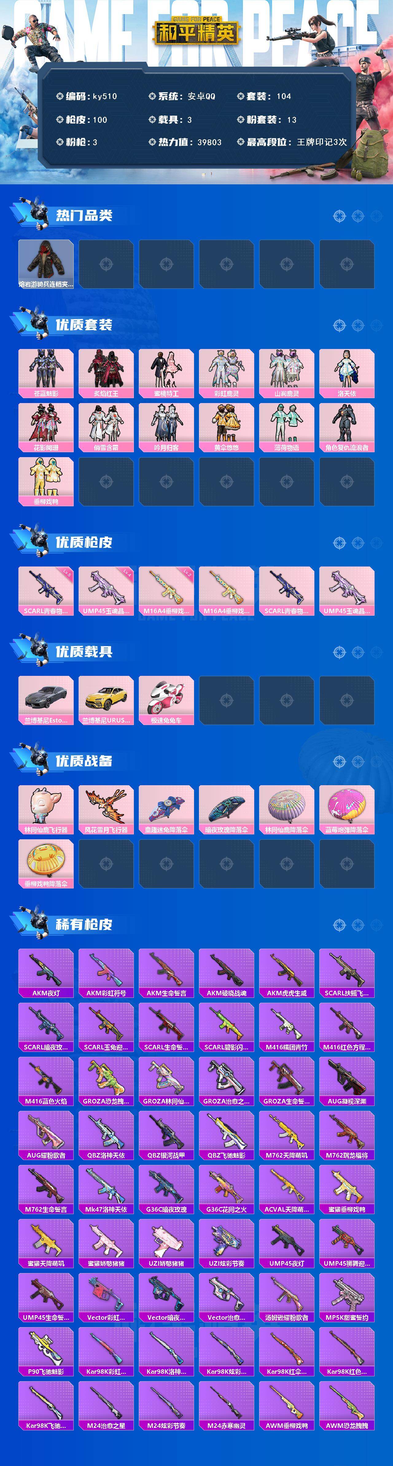 安卓 手Q-13粉装-3特效枪-3载具-2粉色飞行器-39803热力值-3王牌印记-104套装-100枪皮