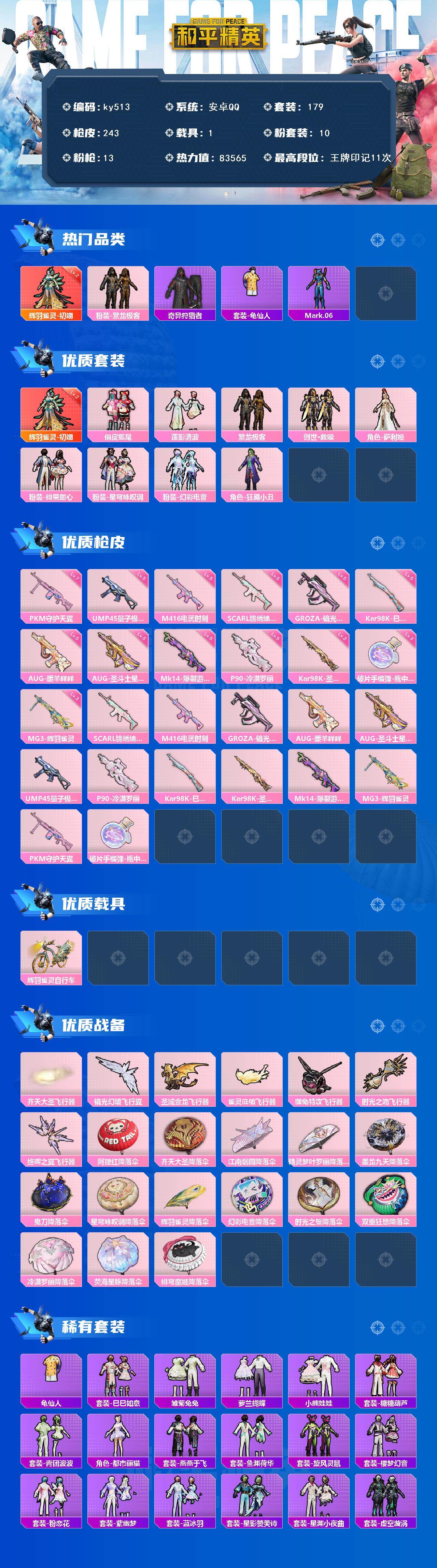 安卓 手Q-1神装-10粉装-13特效枪-1载具-8粉色飞行器-83565热力值-11王牌印记-179套装-243枪皮
