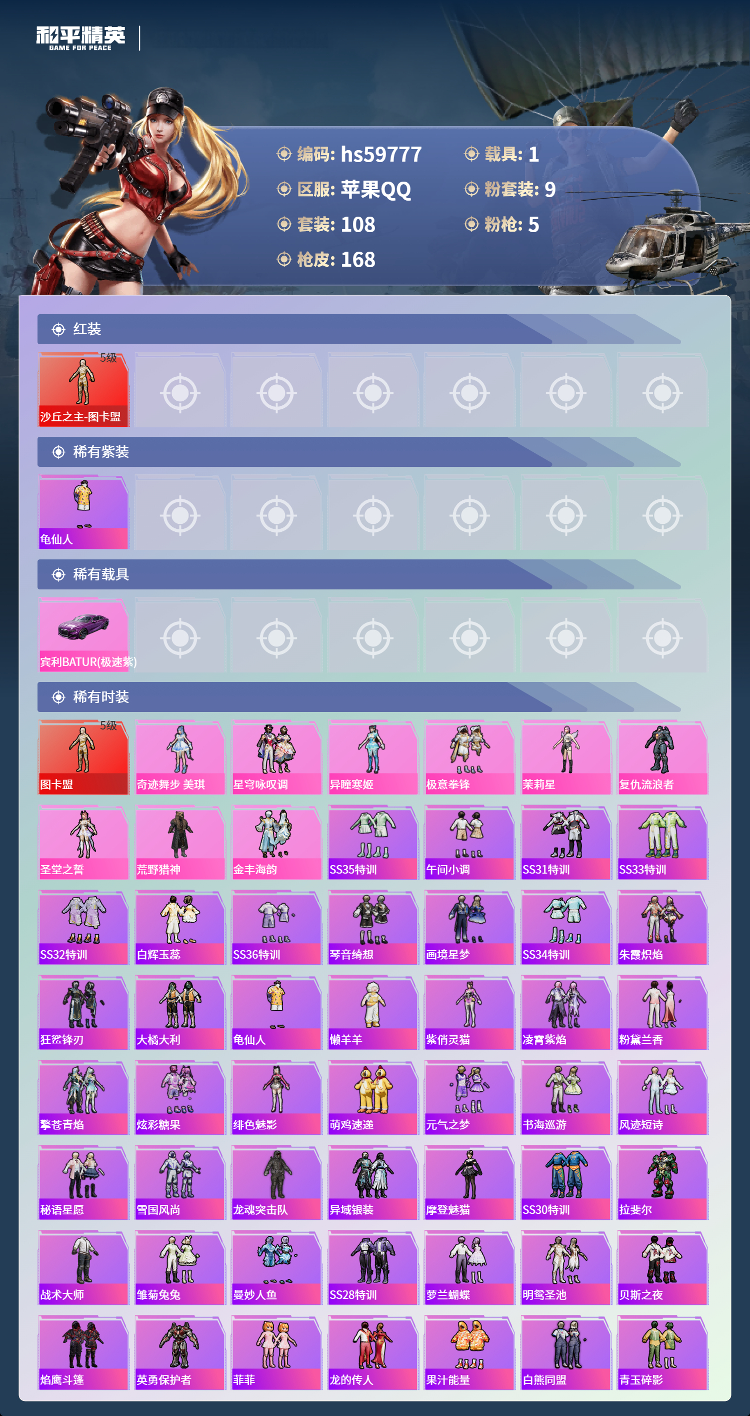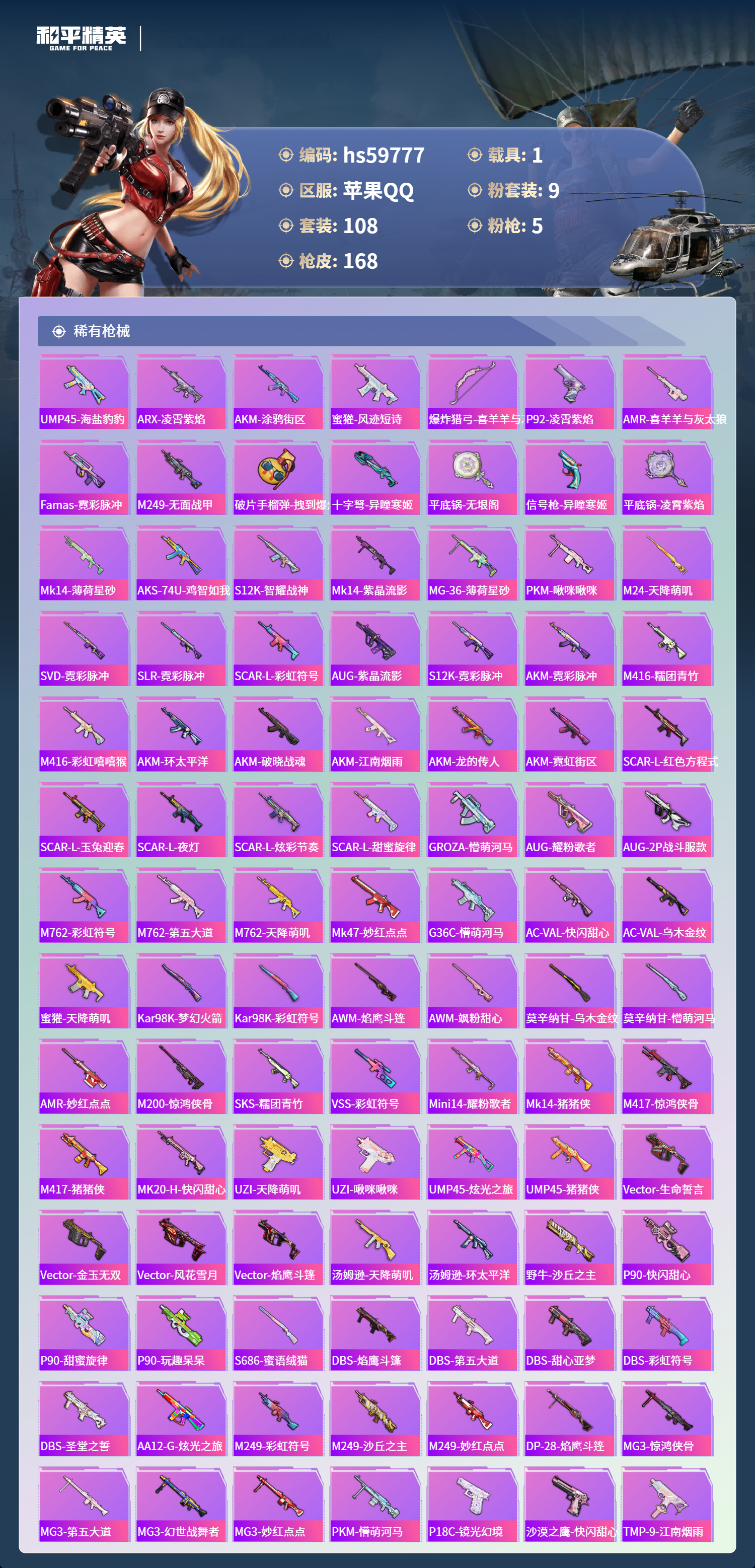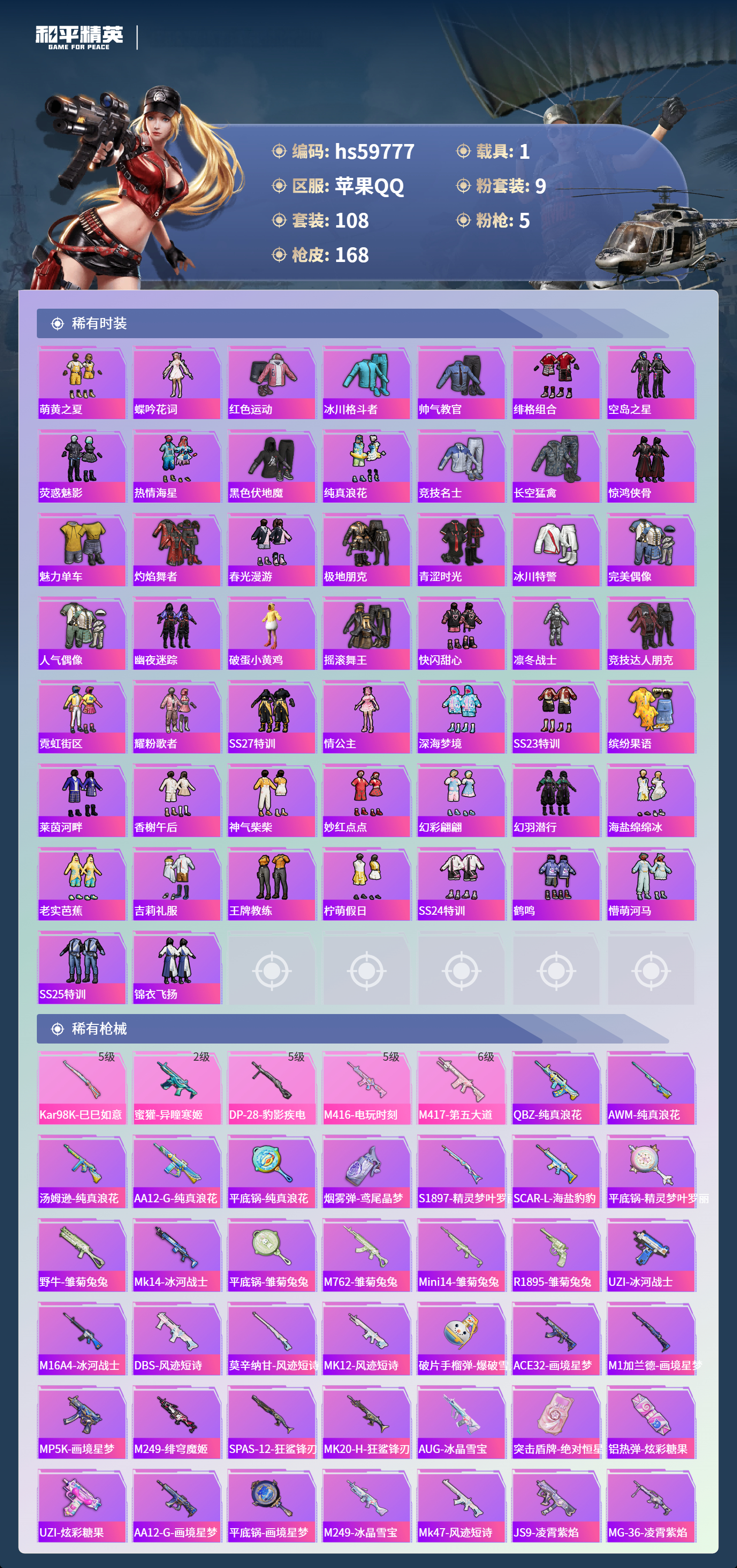 hs59777 苹果手Q-10王牌印记-1红装-9粉装-5特效枪-1载具-60999热力值-108套装-168枪皮-6卓越印记-4传奇印记
