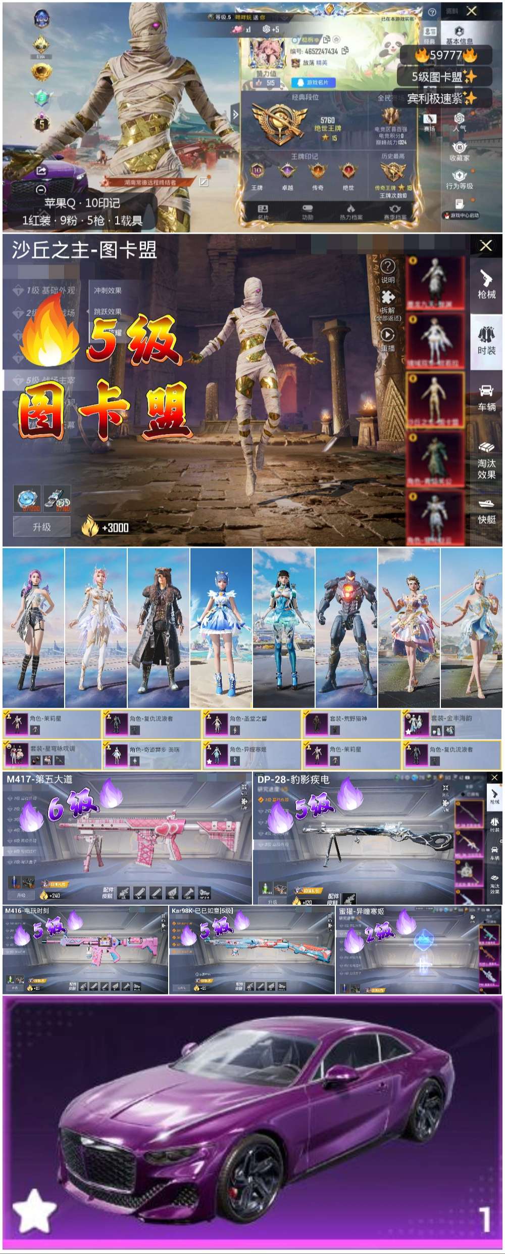 【5特效枪】M417-第五大道/6级,DP-28-豹影疾电/5级,蜜獾-异瞳寒姬/2级,Kar98K-巳巳如意/5级,M416-电玩时刻/5级