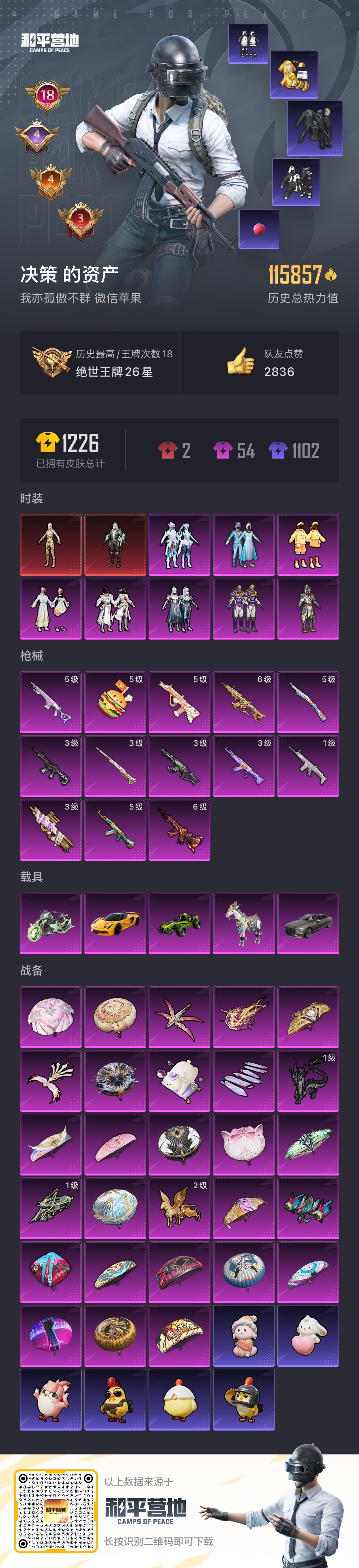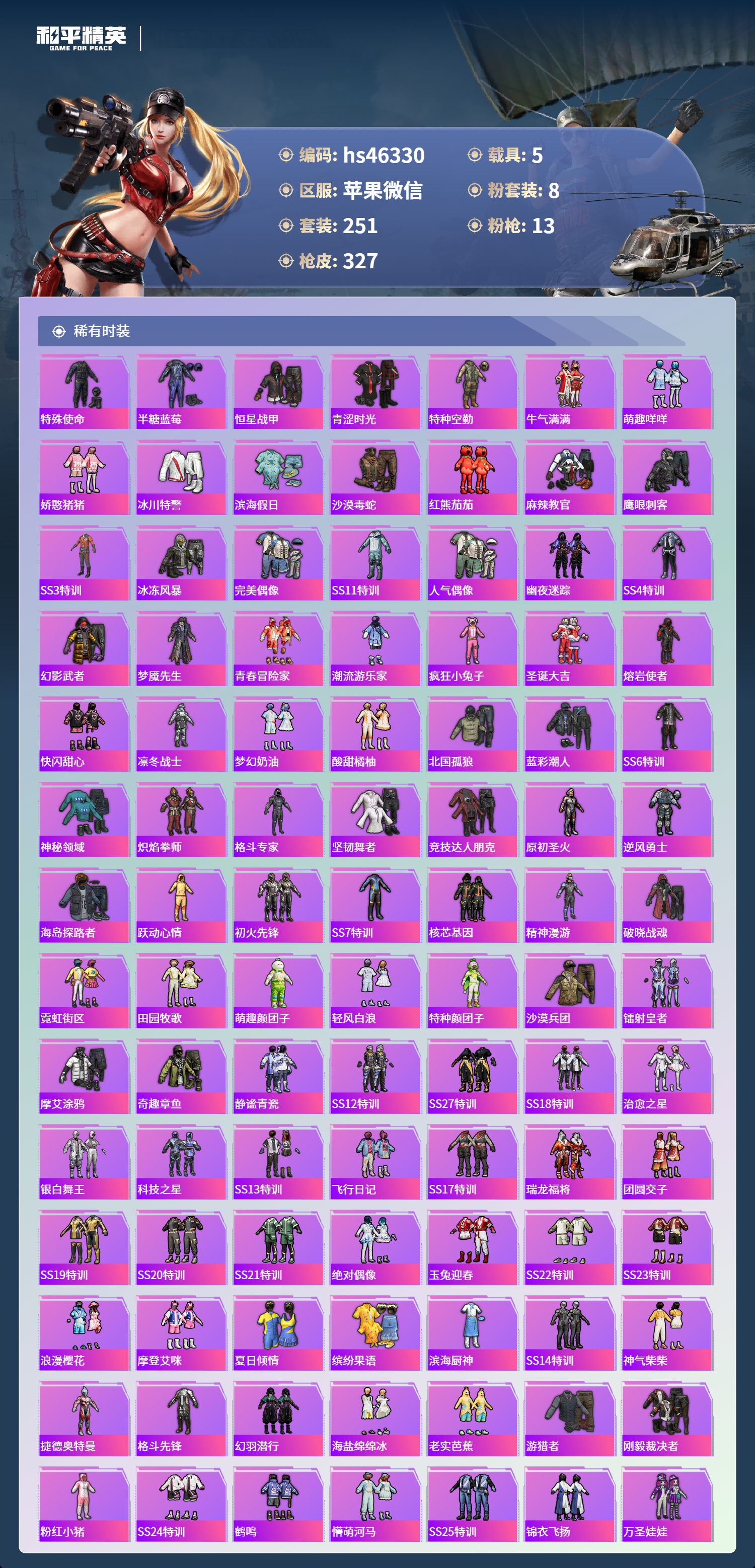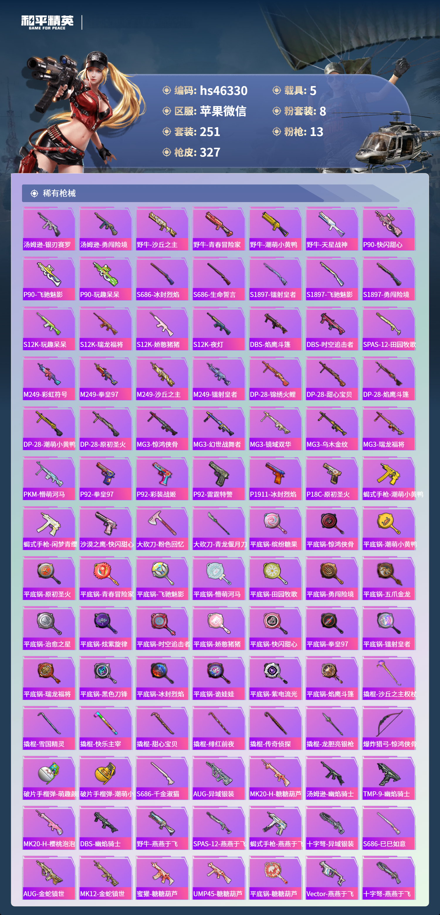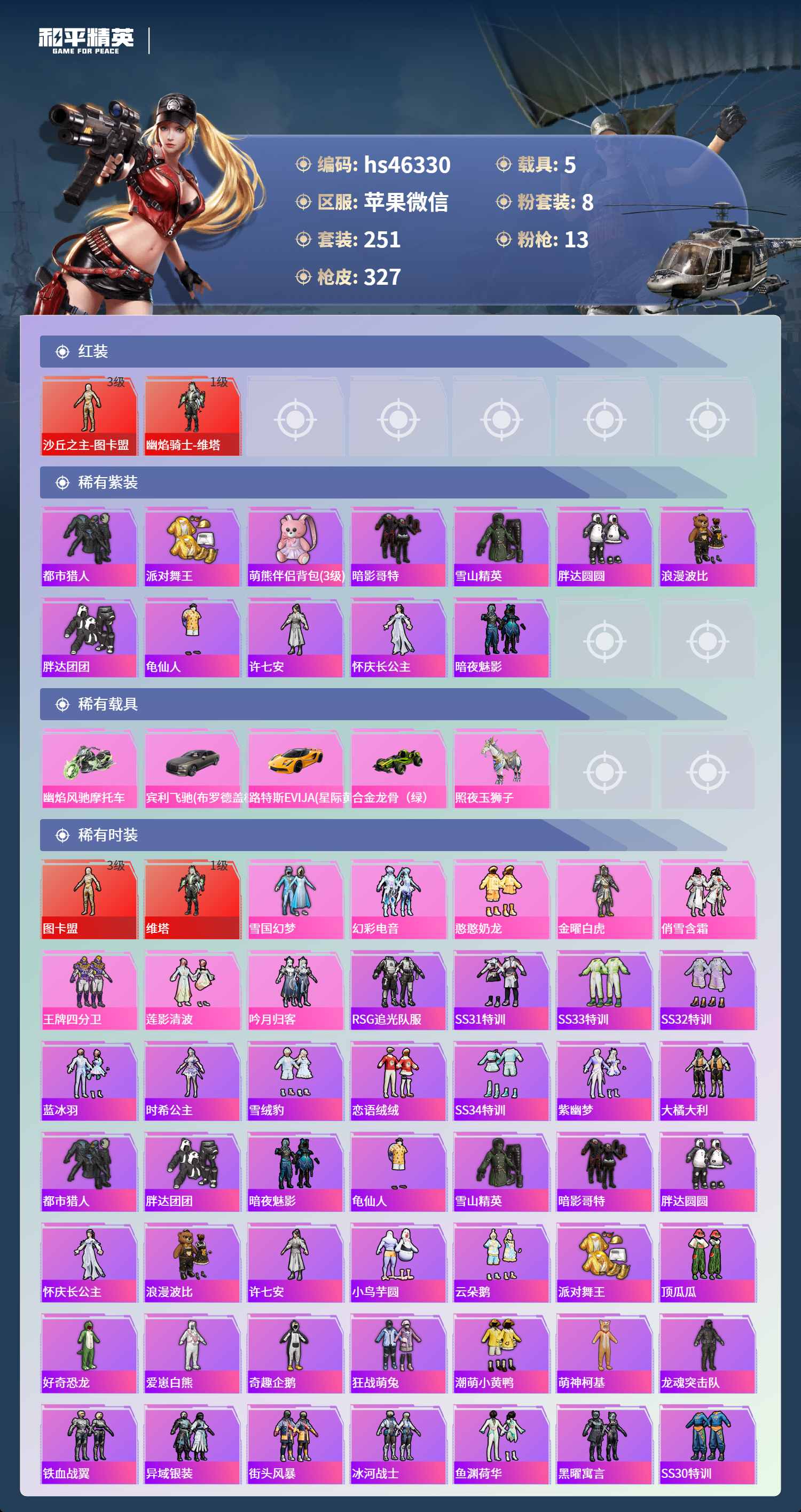 hs46330 苹果微信-18王牌印记-2红装-8粉装-13特效枪-5载具-热力值-251套装-327枪皮-4卓越印记-4传奇印记