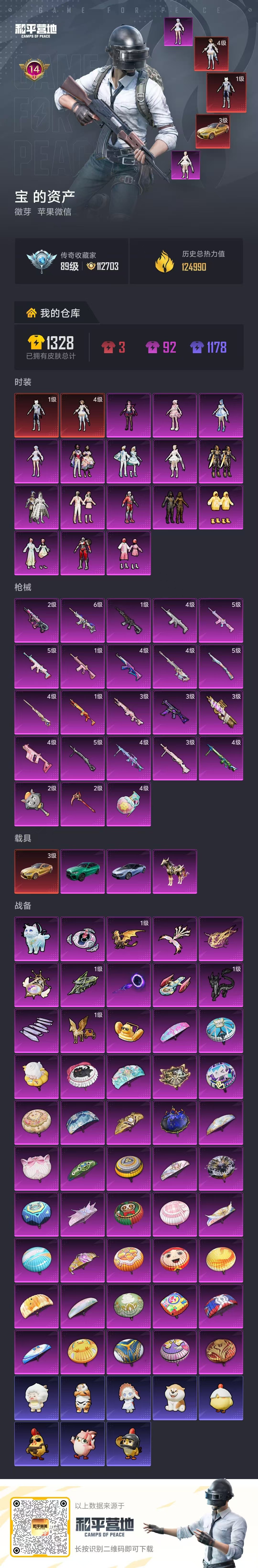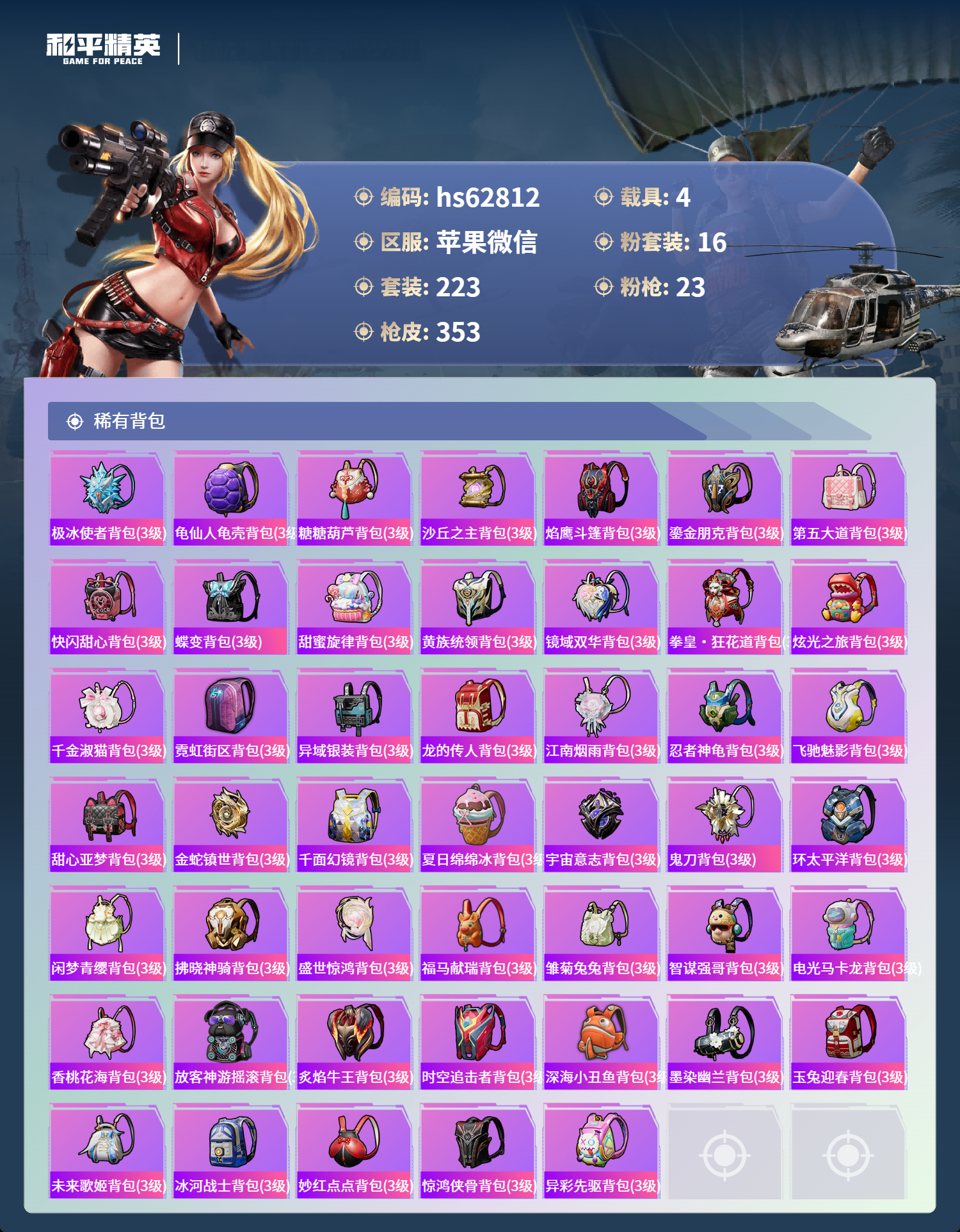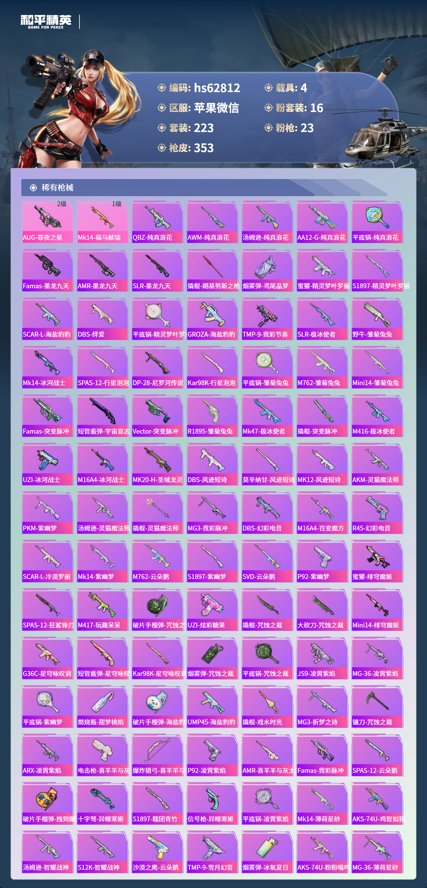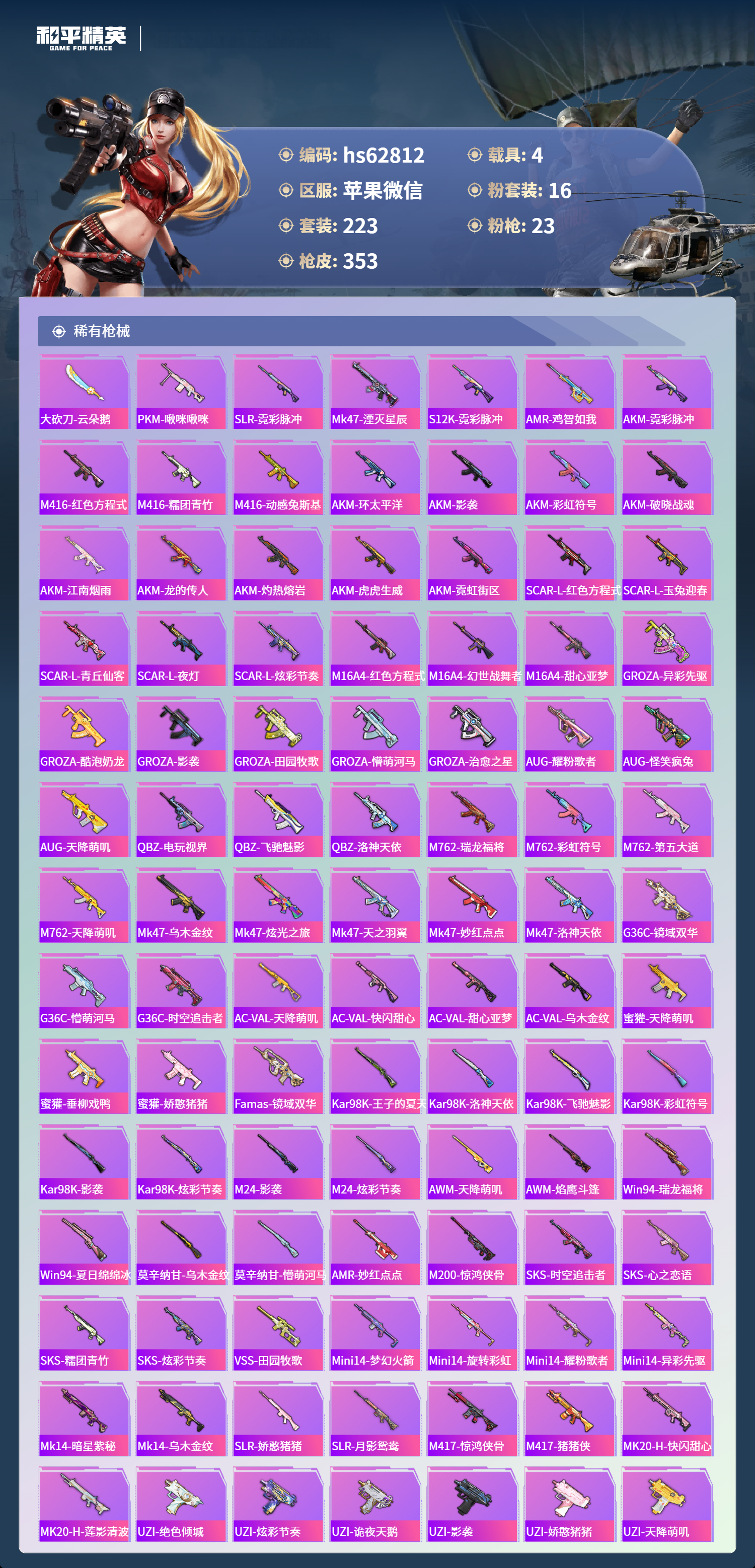 hs62812 苹果微信-14王牌印记-2红装-16粉装-23特效枪-4载具-热力值-223套装-353枪皮