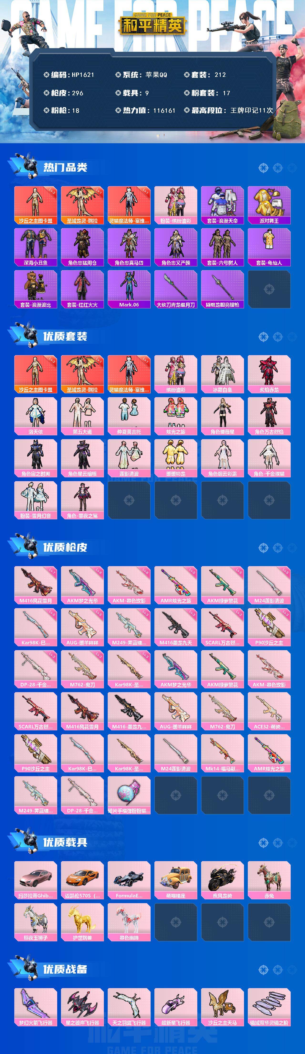 【HP1621】212套装/枪械18/装备402/载具9/战备222/王牌印记11/热力值116161/六级AKM-梦之光华/五级AKM-绿萝繁花/六级AKM-暮色玫影/三级SCAR-L-万古烈焰/七级M416-风花雪月/三级M416-墨龙九天/五级AUG-暖羊咩咩/三级M762-鬼刀/三级P90-沙丘之主/五级Kar98K-巳巳如意/三级Kar98K-圣域龙灵/五级M24-莲影清波/五级AMR-炫光之旅/三级M249-霁蓝缠春/三级DP-28-千金淑猫/一级灵猫魔法师-塞维尔/一级圣域龙灵-瑞