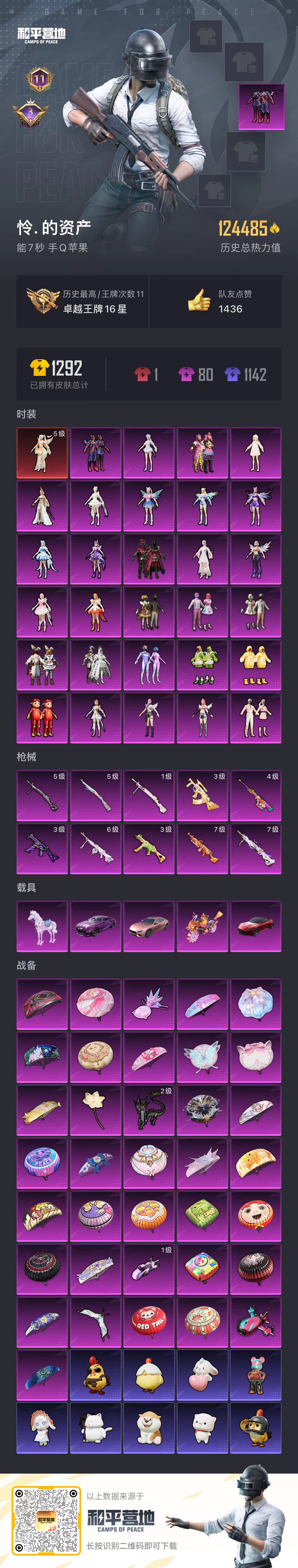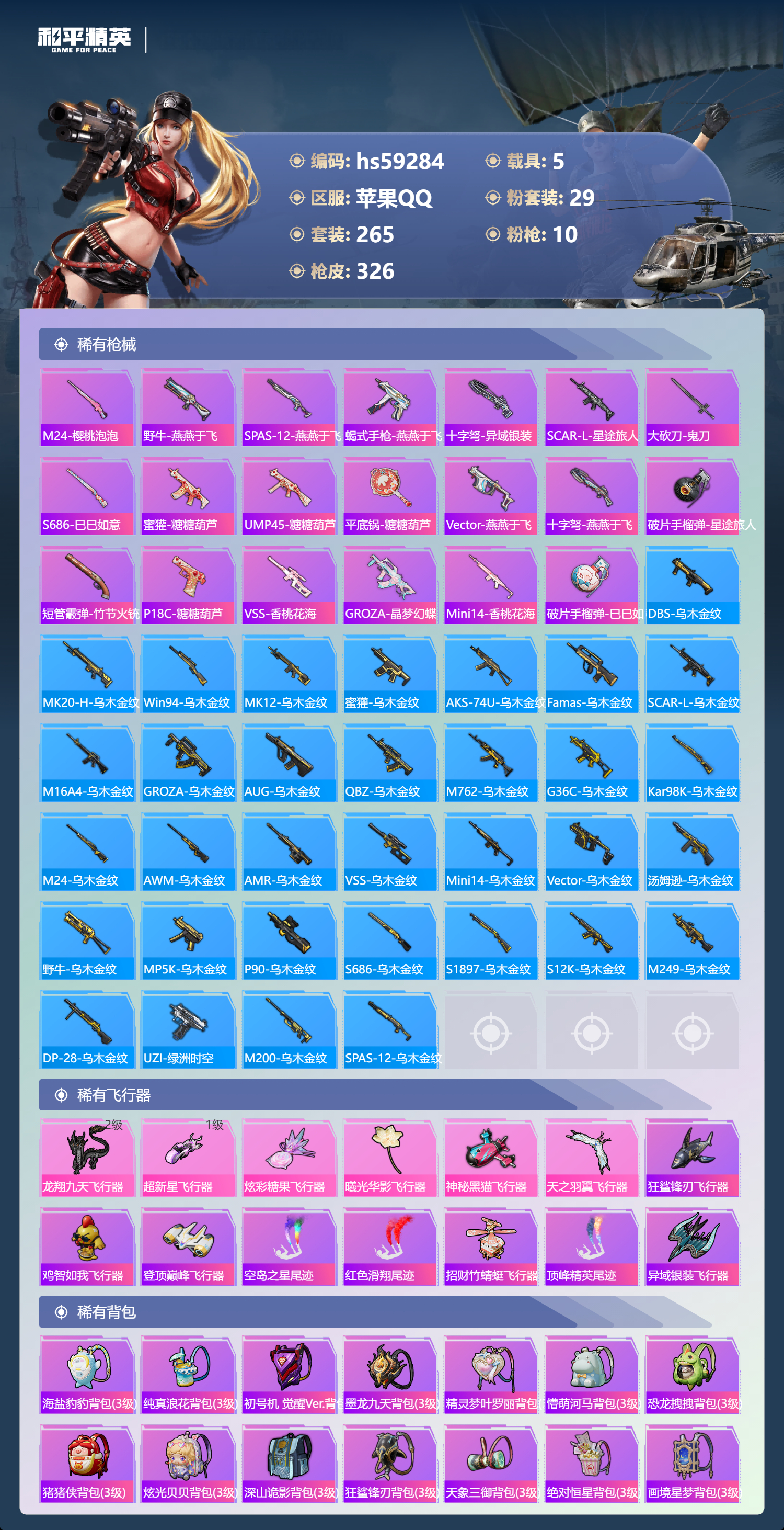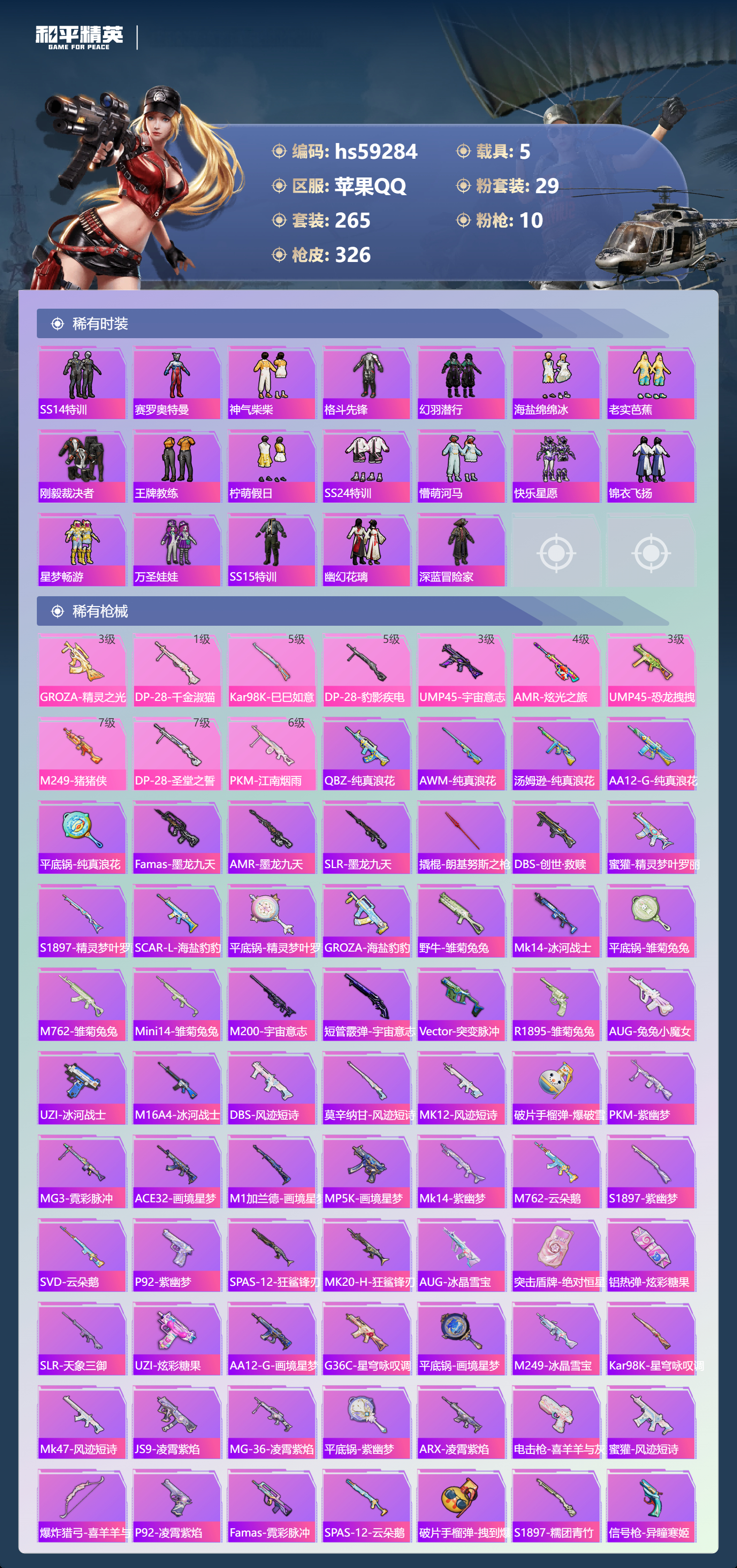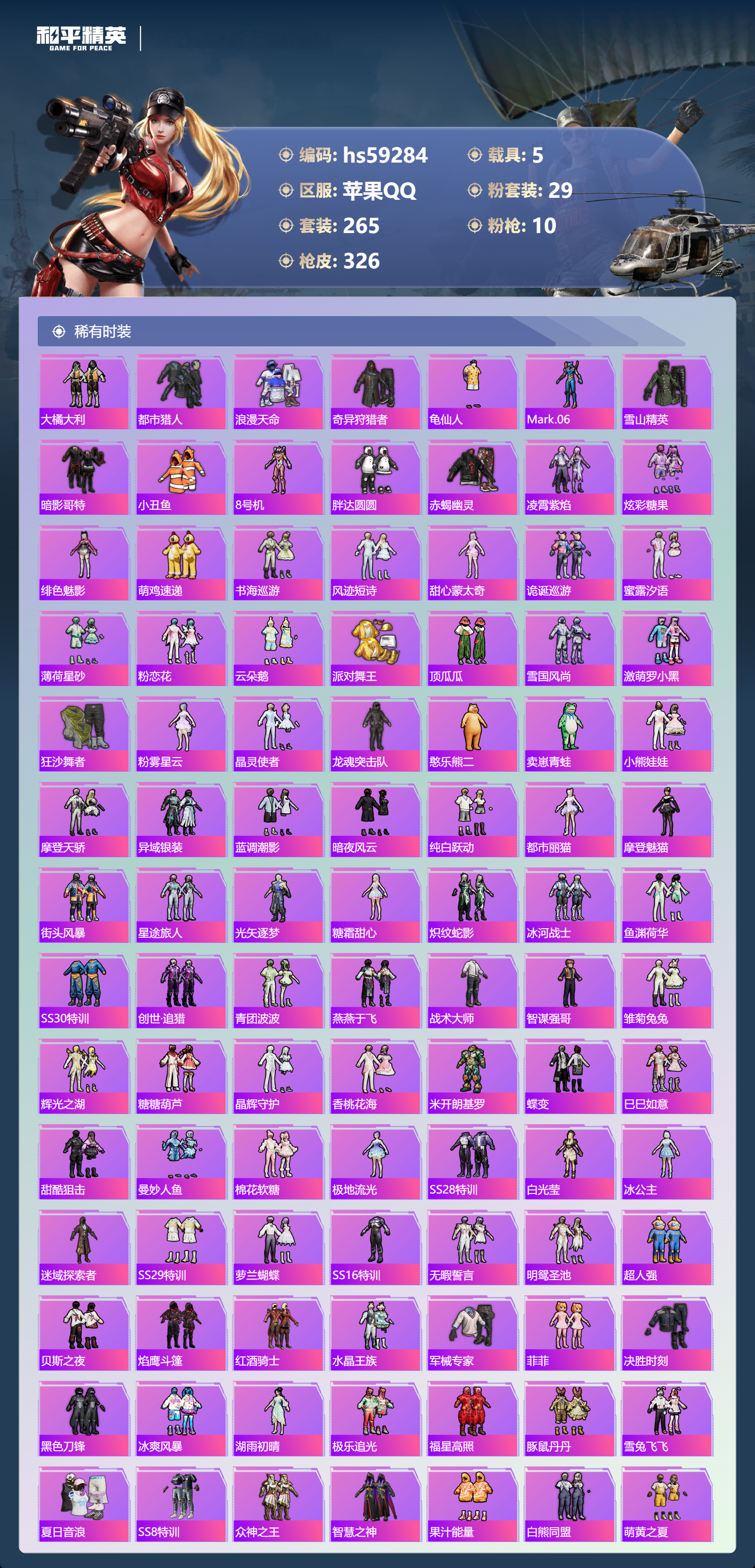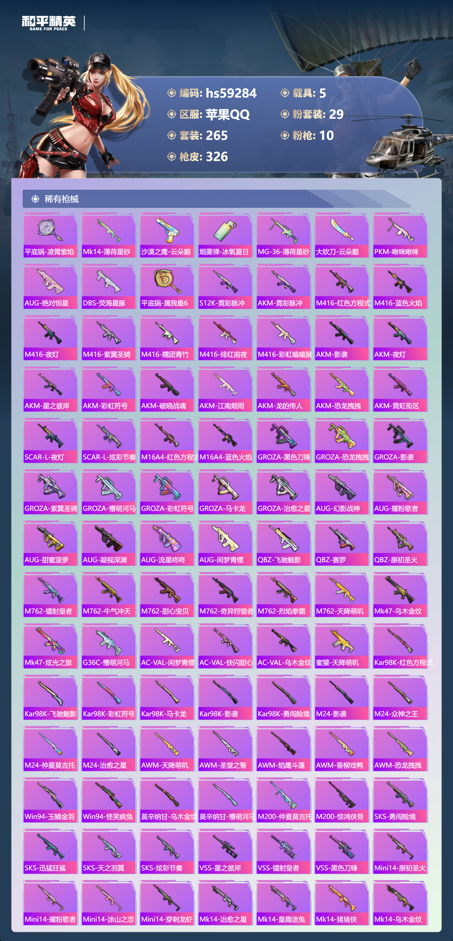 hs59284 苹果手Q-11王牌印记-1红装-29粉装-10特效枪-5载具-热力值-265套装-326枪皮-3卓越印记