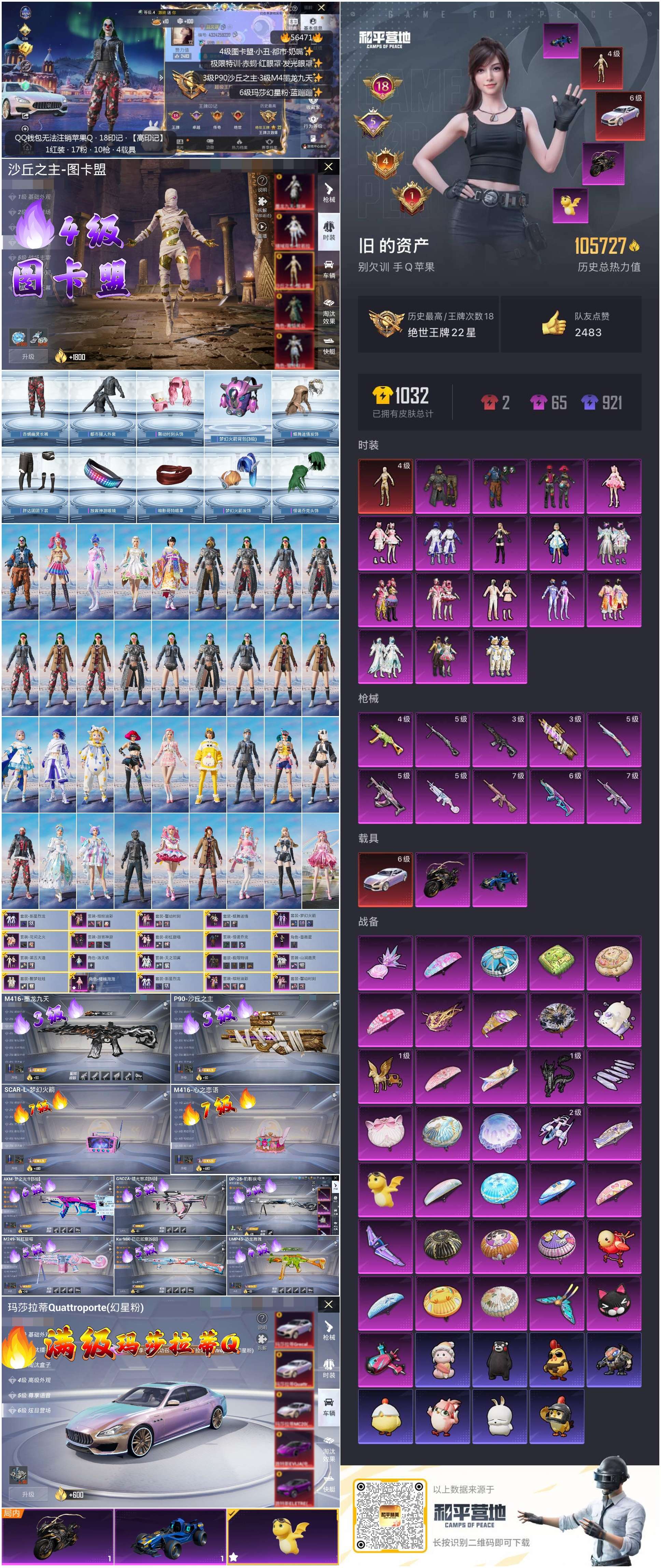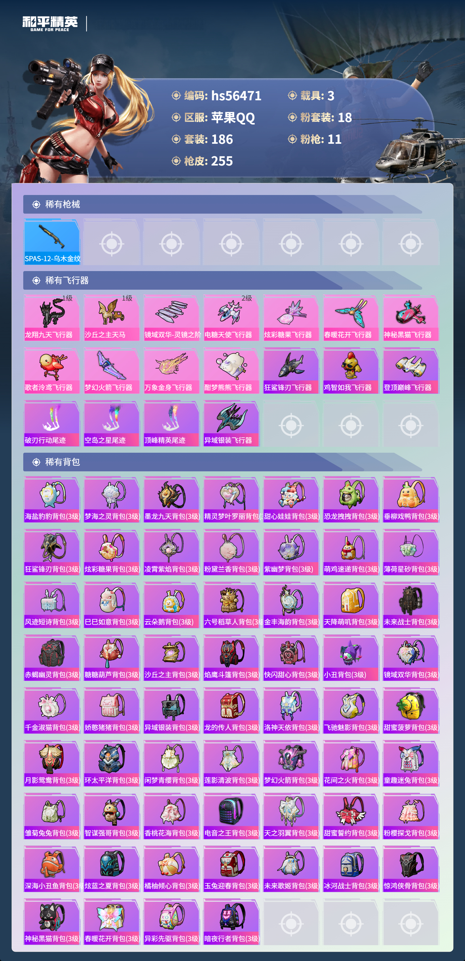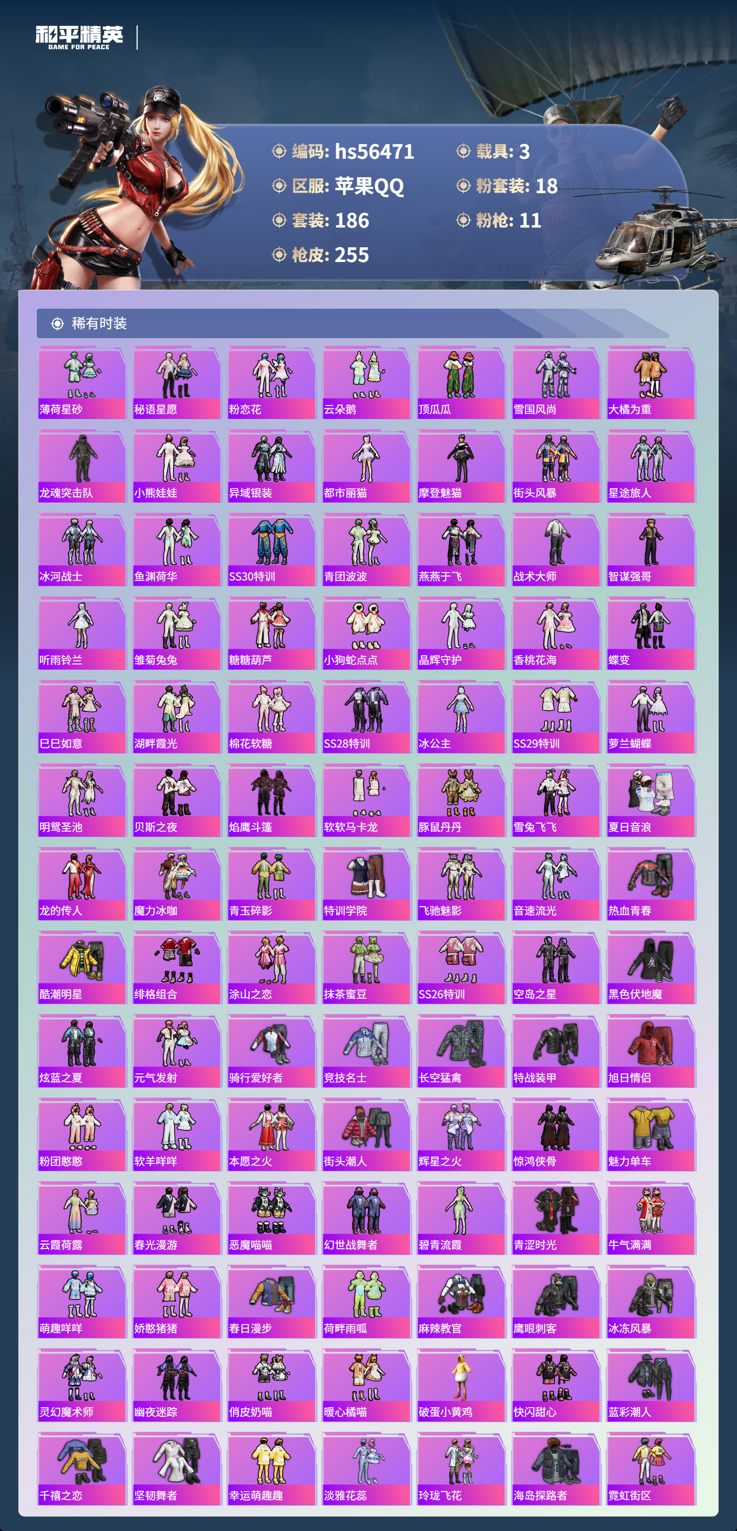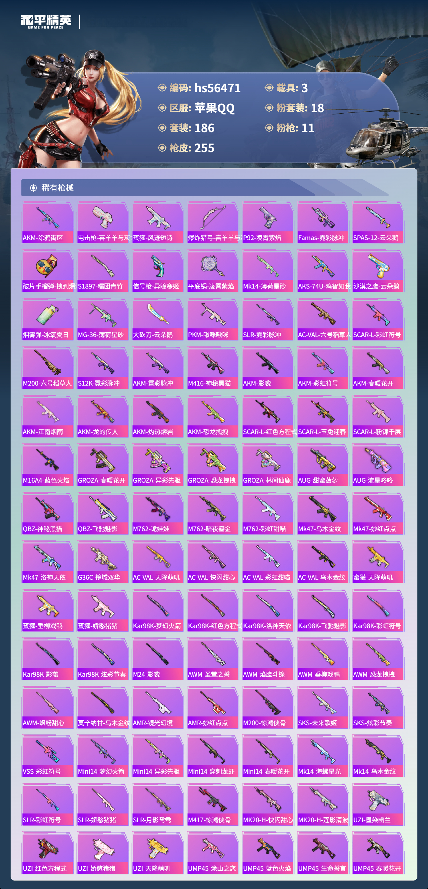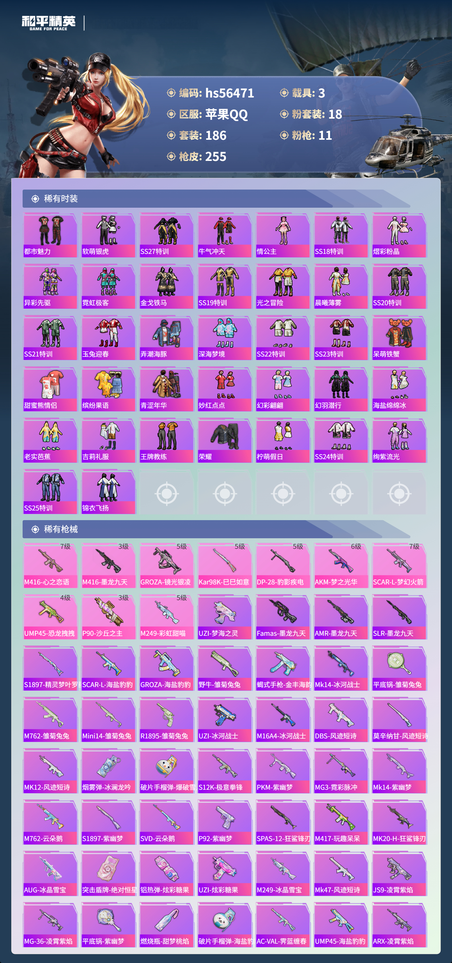 hs56471 苹果手Q-18王牌印记-1红装-18粉装-11特效枪-3载具-热力值-186套装-255枪皮-5卓越印记-4传奇印记
