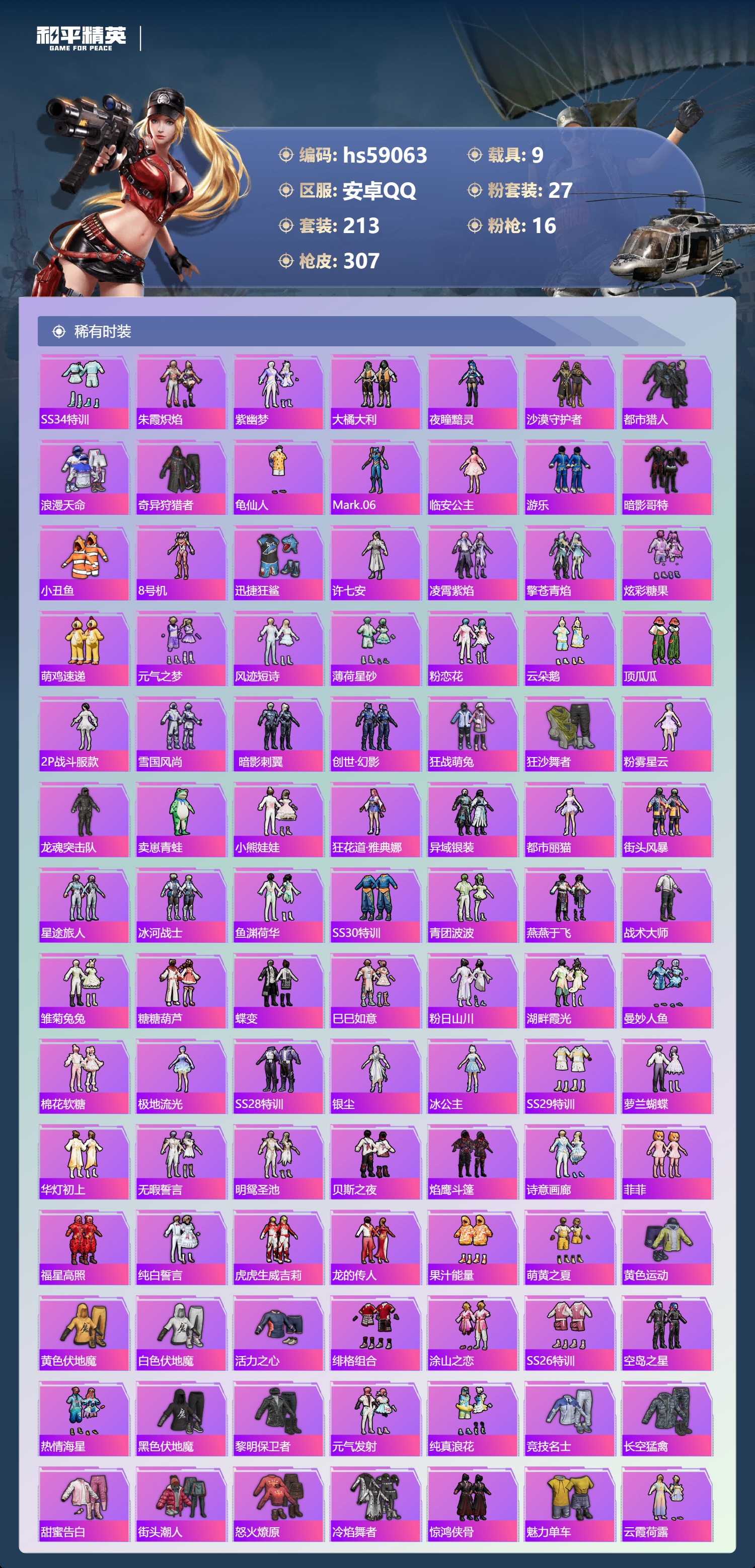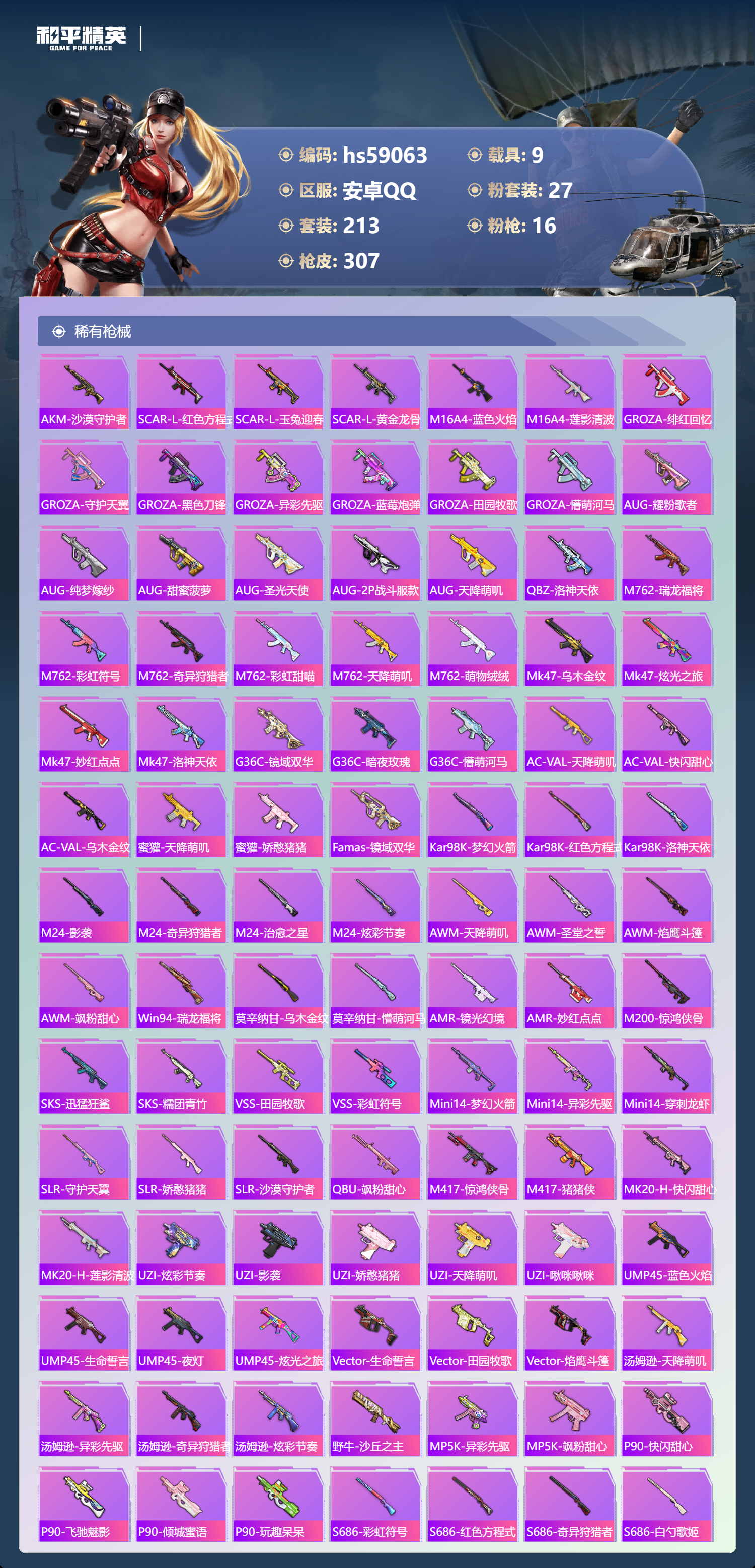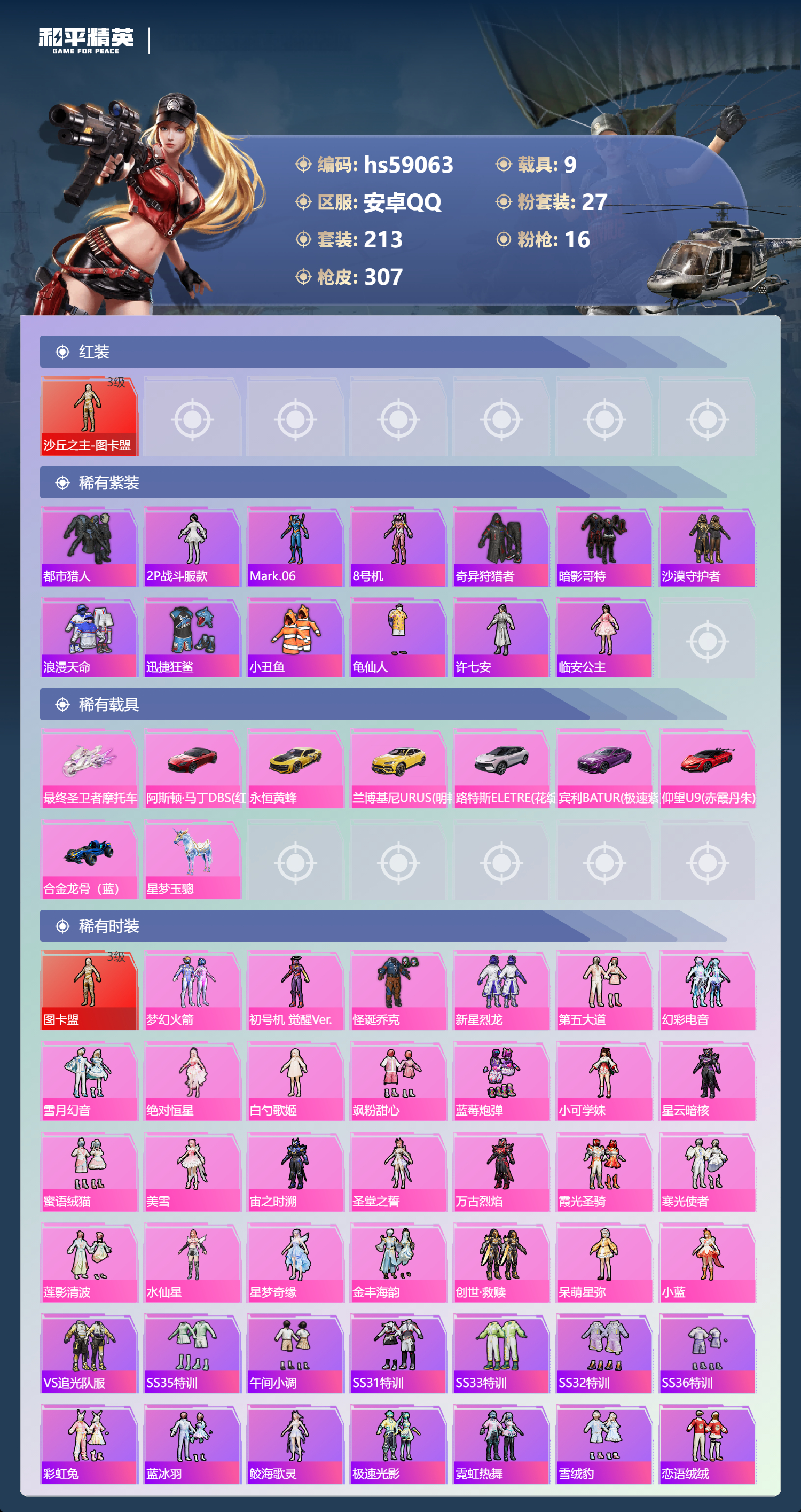 hs59063 安卓手Q-15王牌印记-1红装-27粉装-16特效枪-9载具-热力值-213套装-307枪皮-5卓越印记-2传奇印记