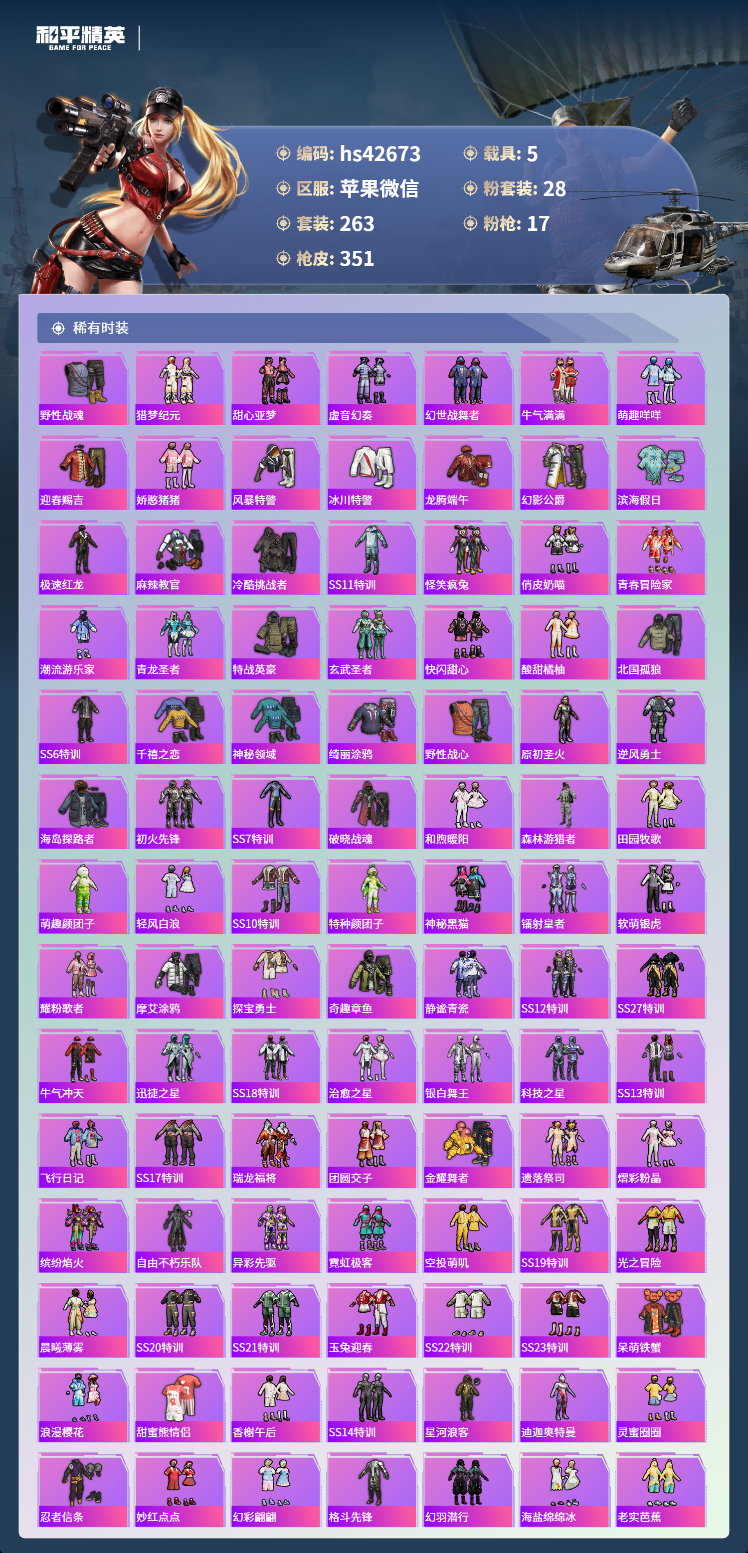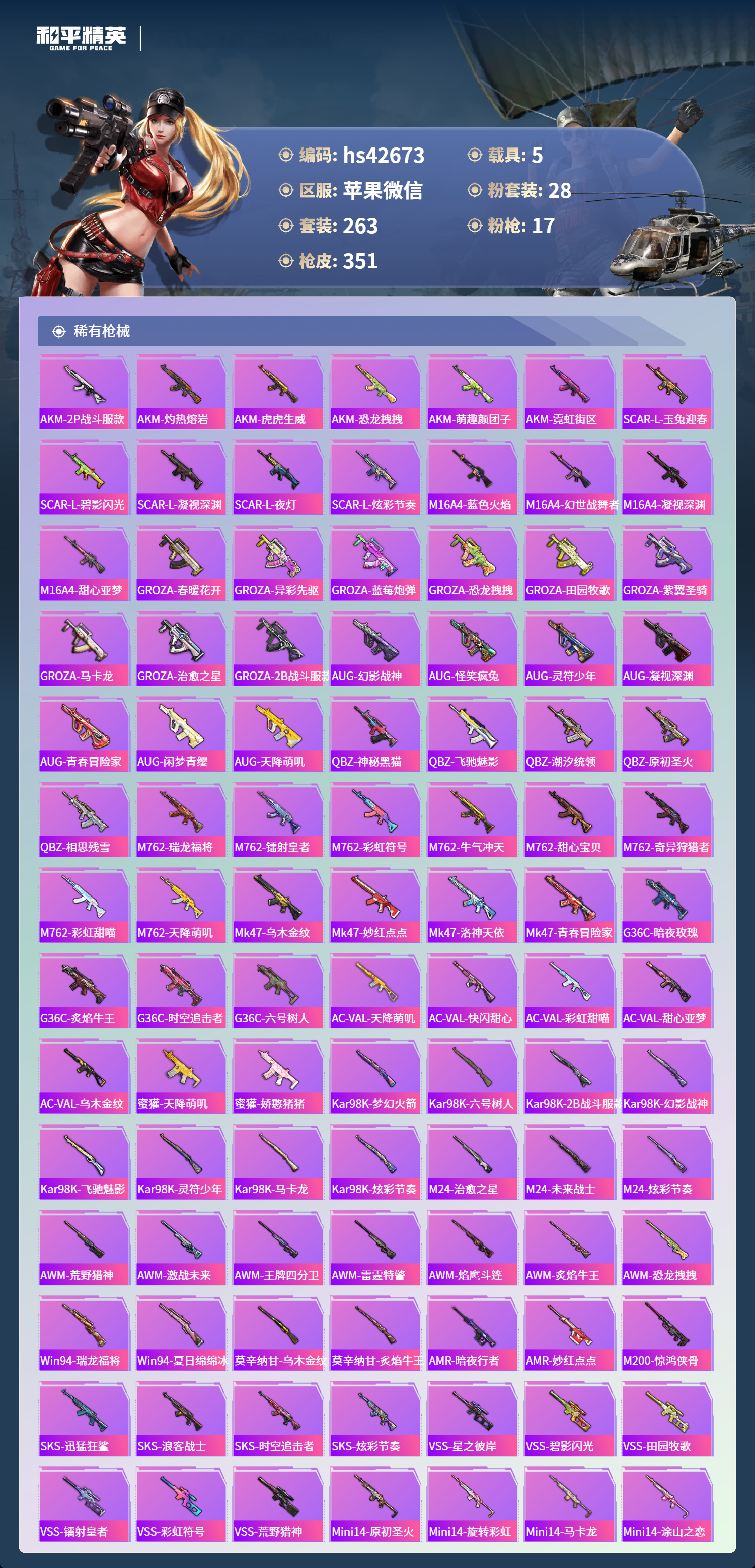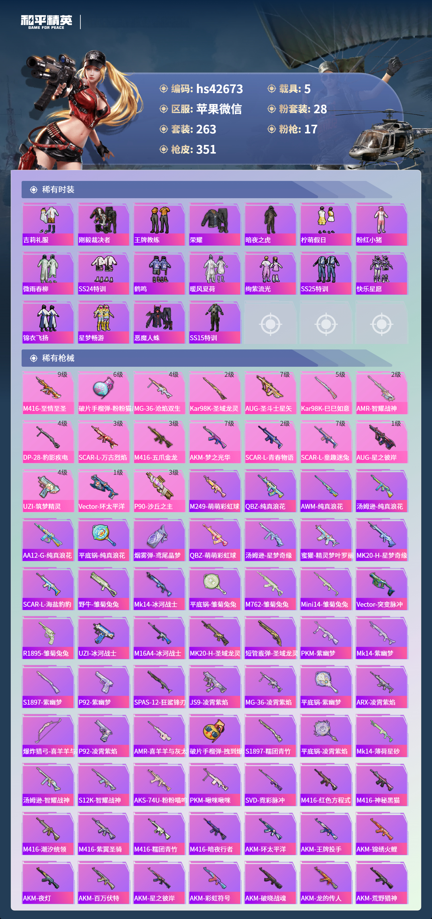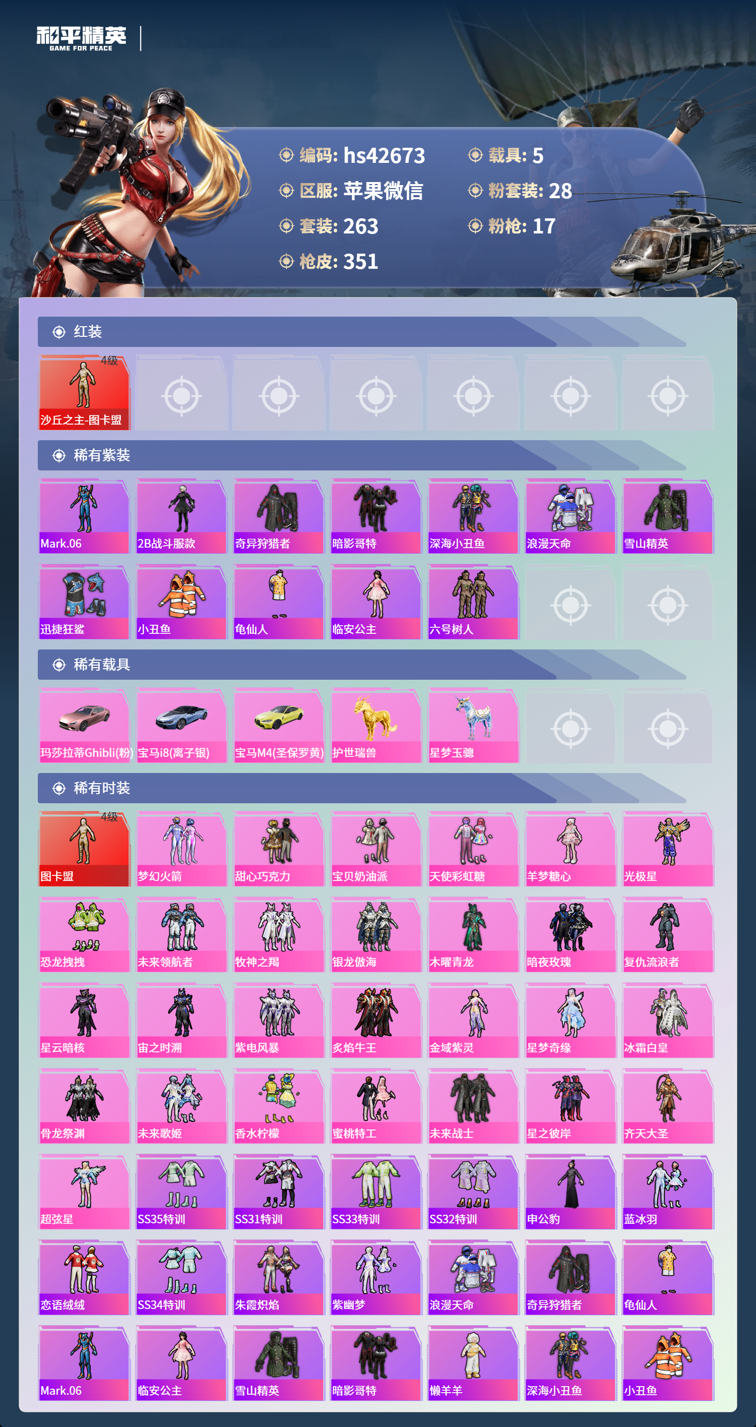 hs42673 苹果微信-23王牌印记-有战神框-1红装-28粉装-17特效枪-5载具-热力值-263套装-351枪皮-7卓越印记-7传奇印记