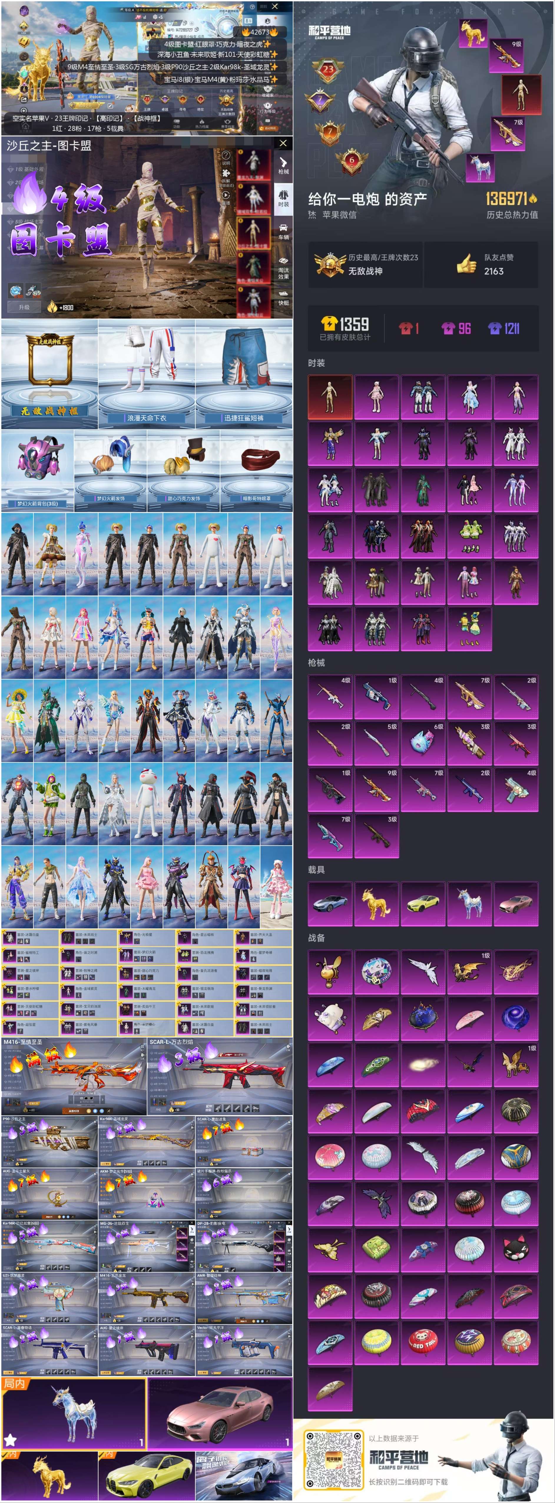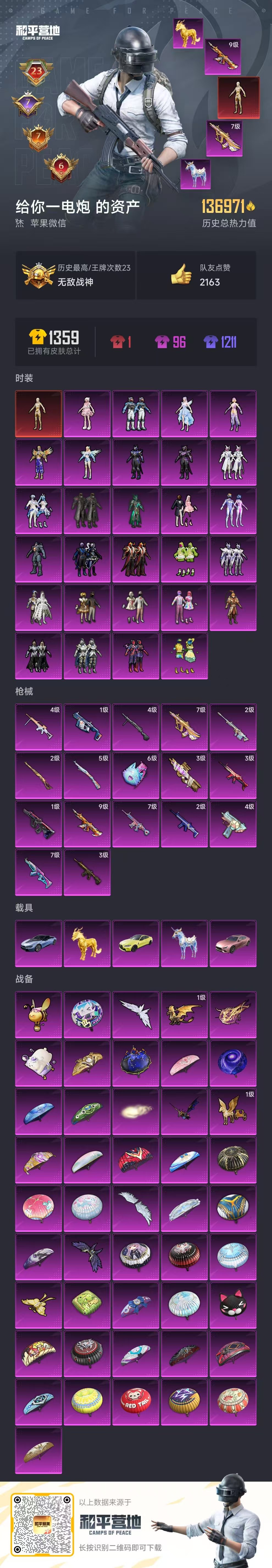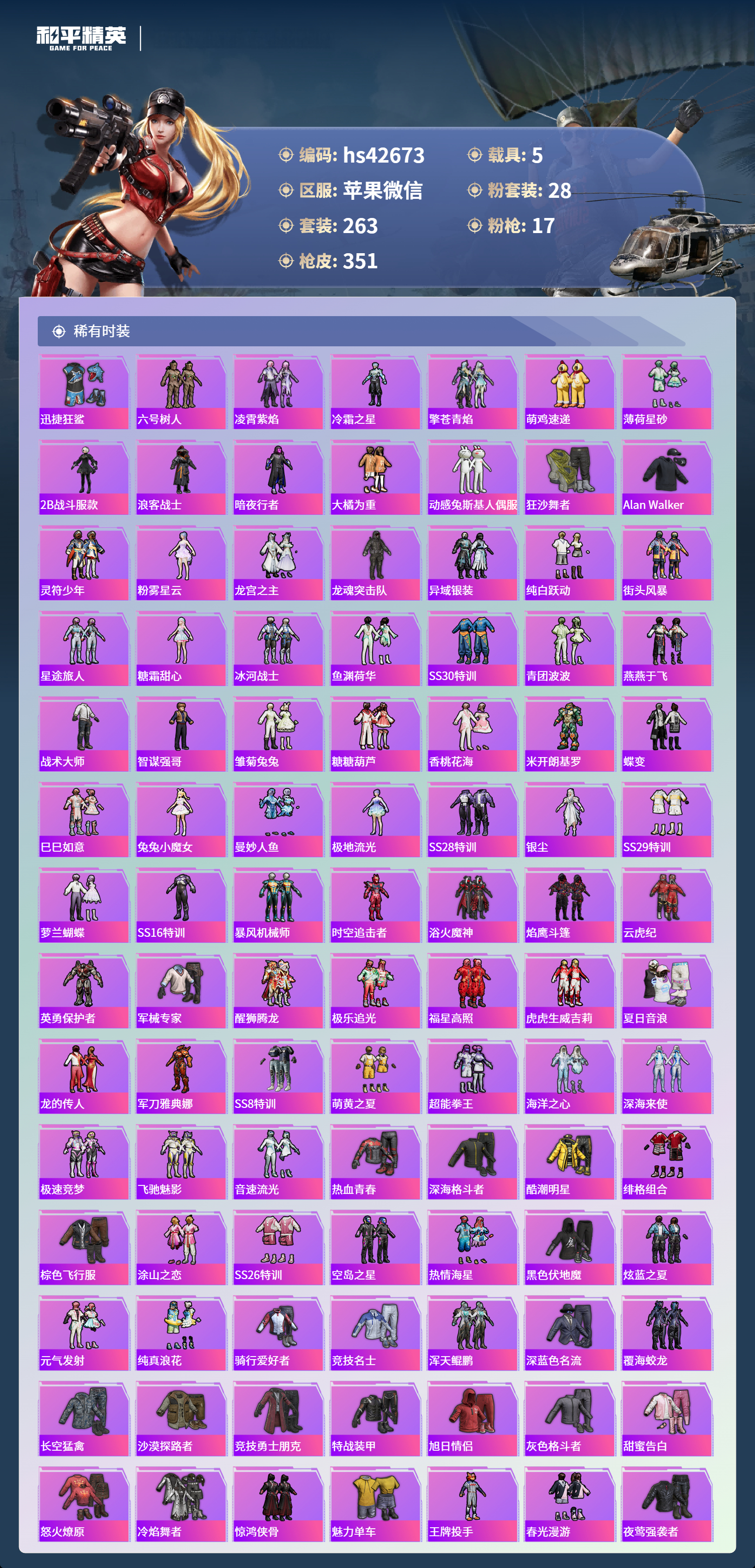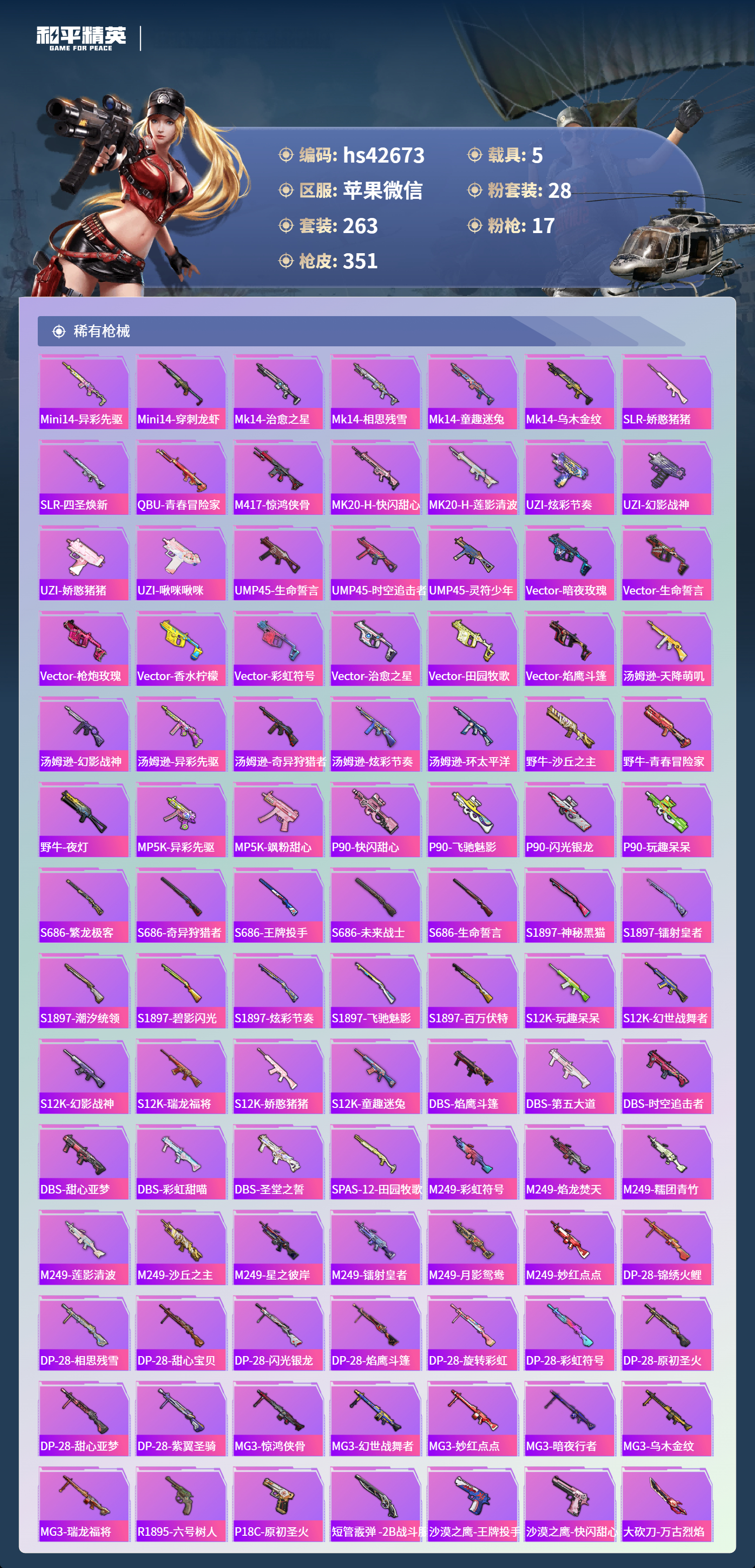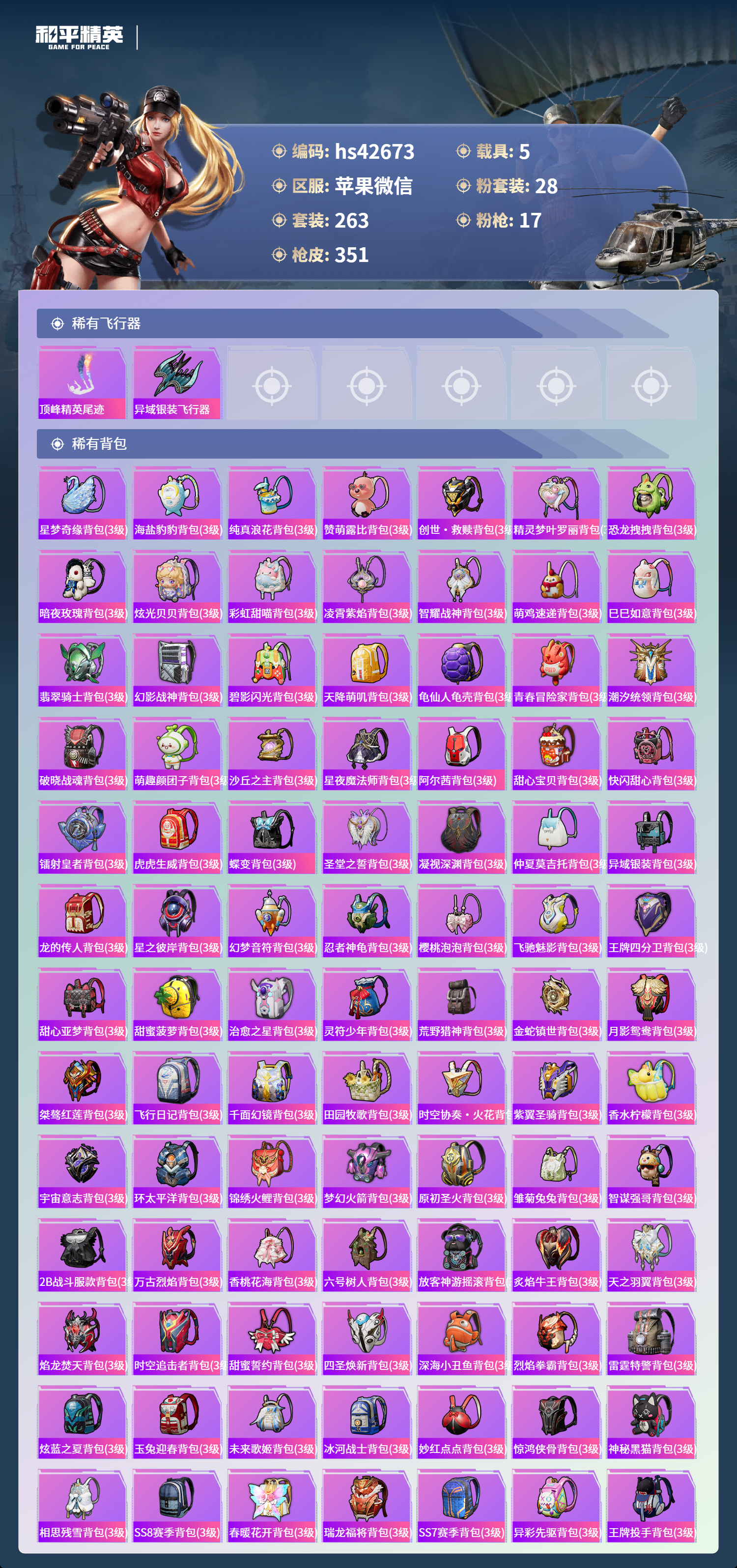 hs42673 苹果微信-23王牌印记-有战神框-1红装-28粉装-17特效枪-5载具-热力值-263套装-351枪皮-7卓越印记-7传奇印记