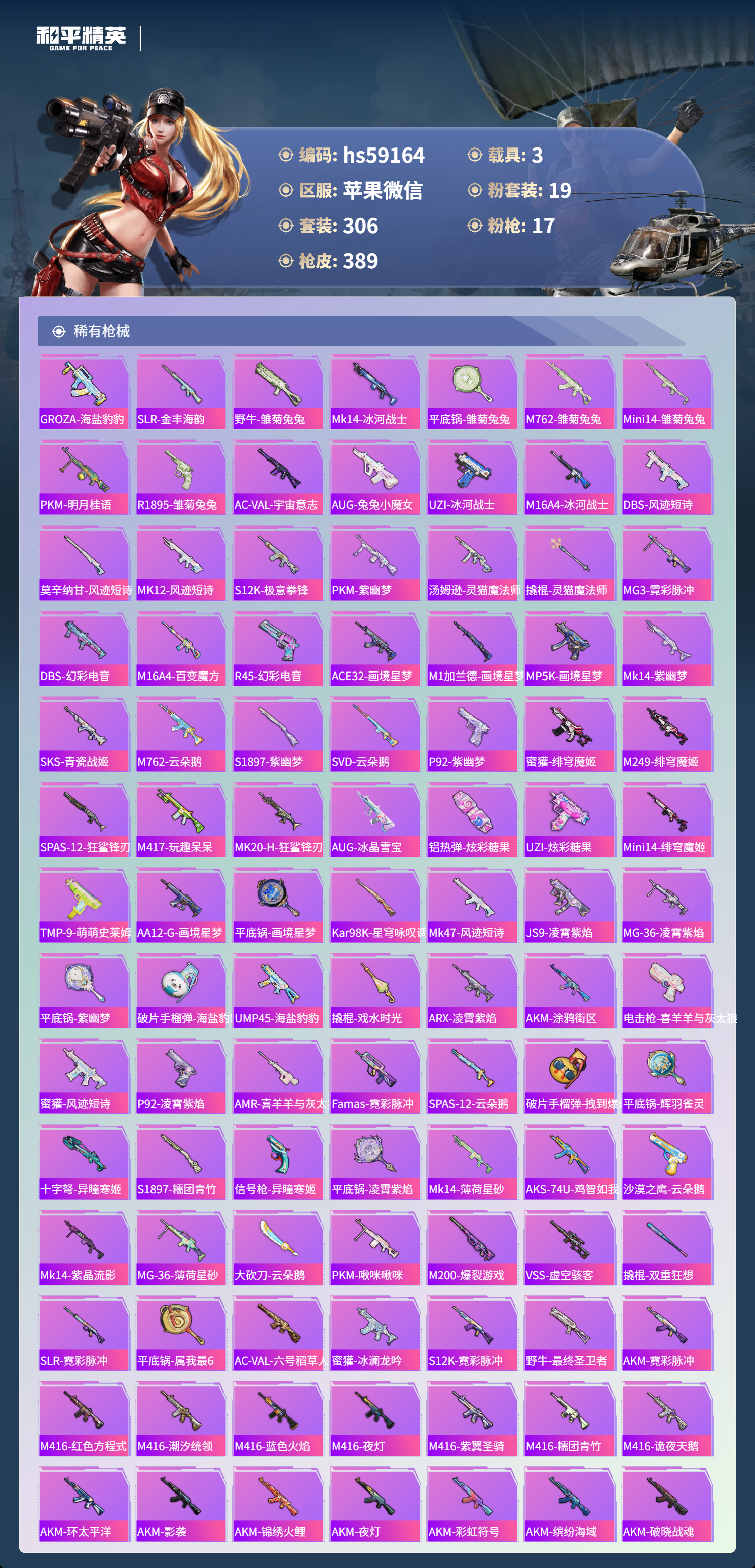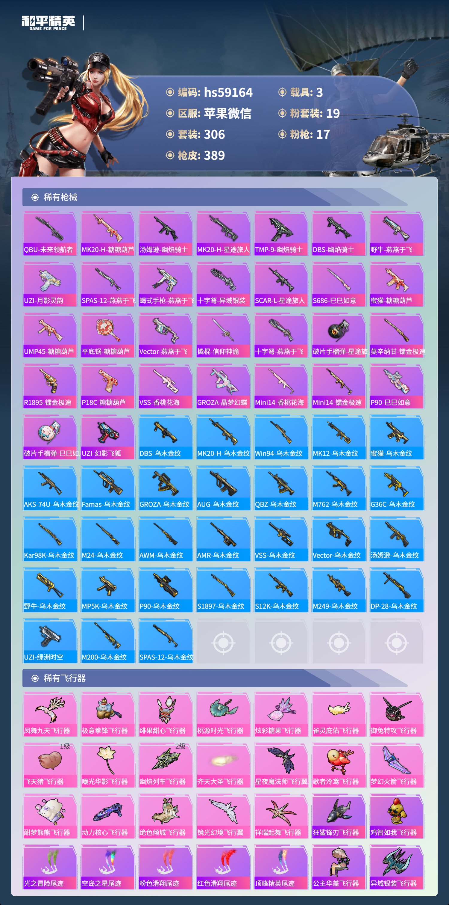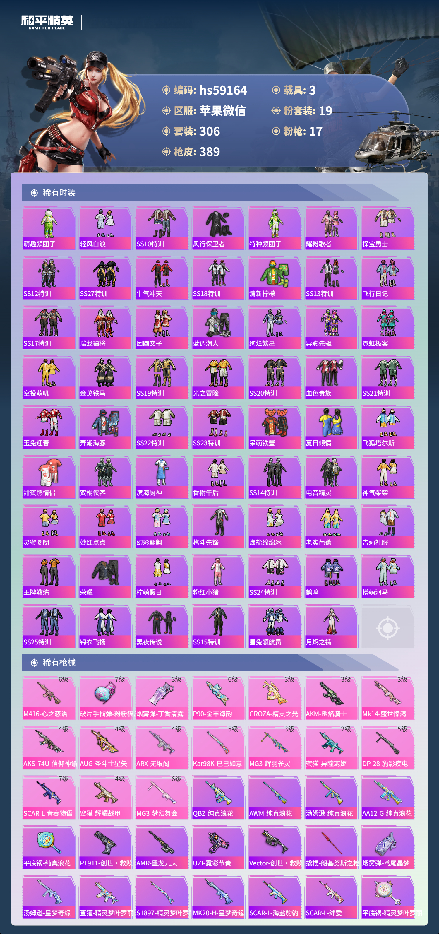 hs59164 苹果微信-23王牌印记-有战神框-1红装-19粉装-17特效枪-3载具-热力值-306套装-389枪皮-1卓越印记