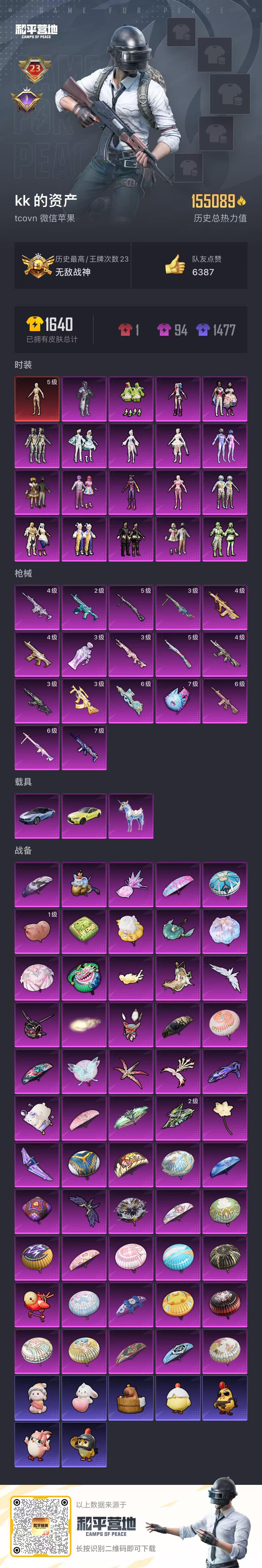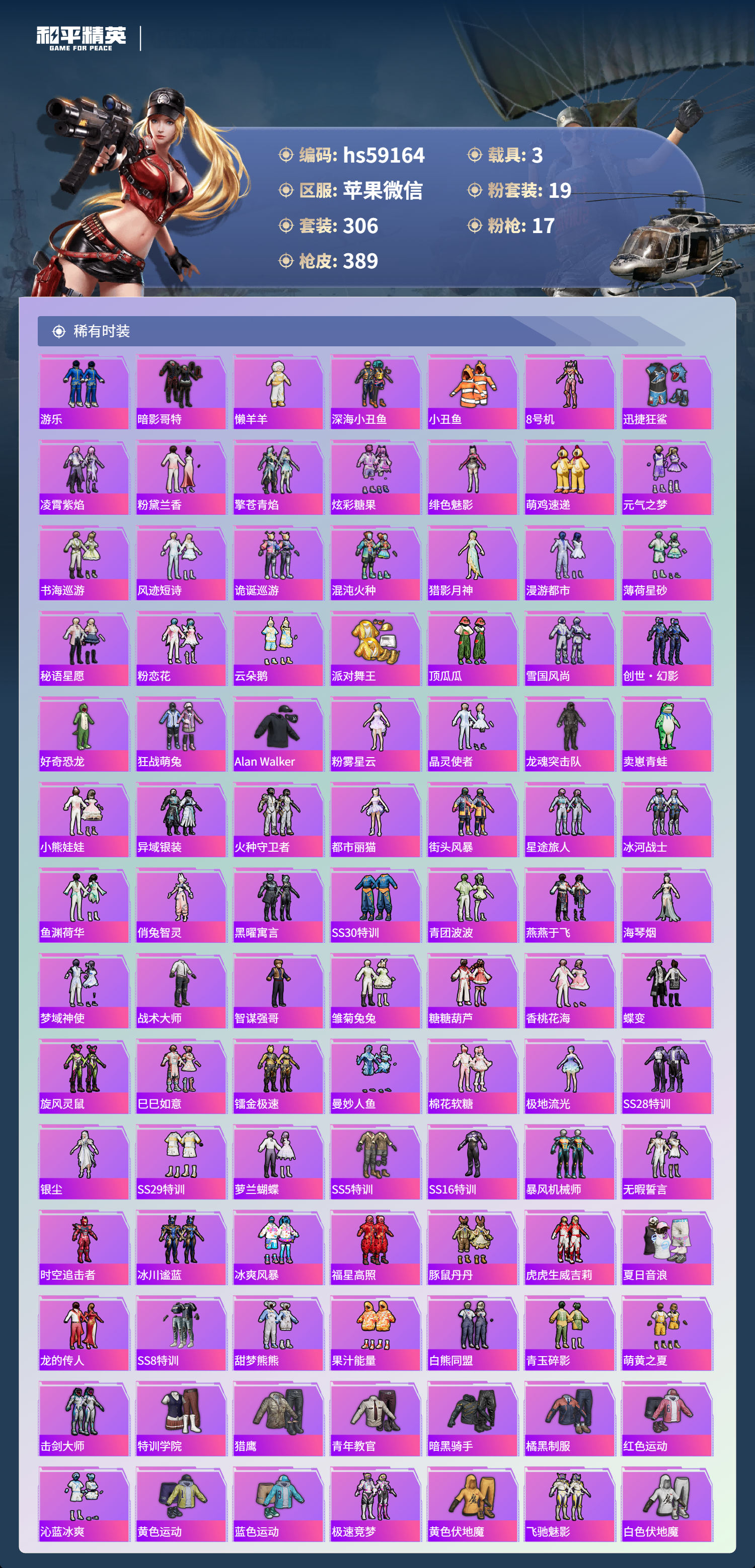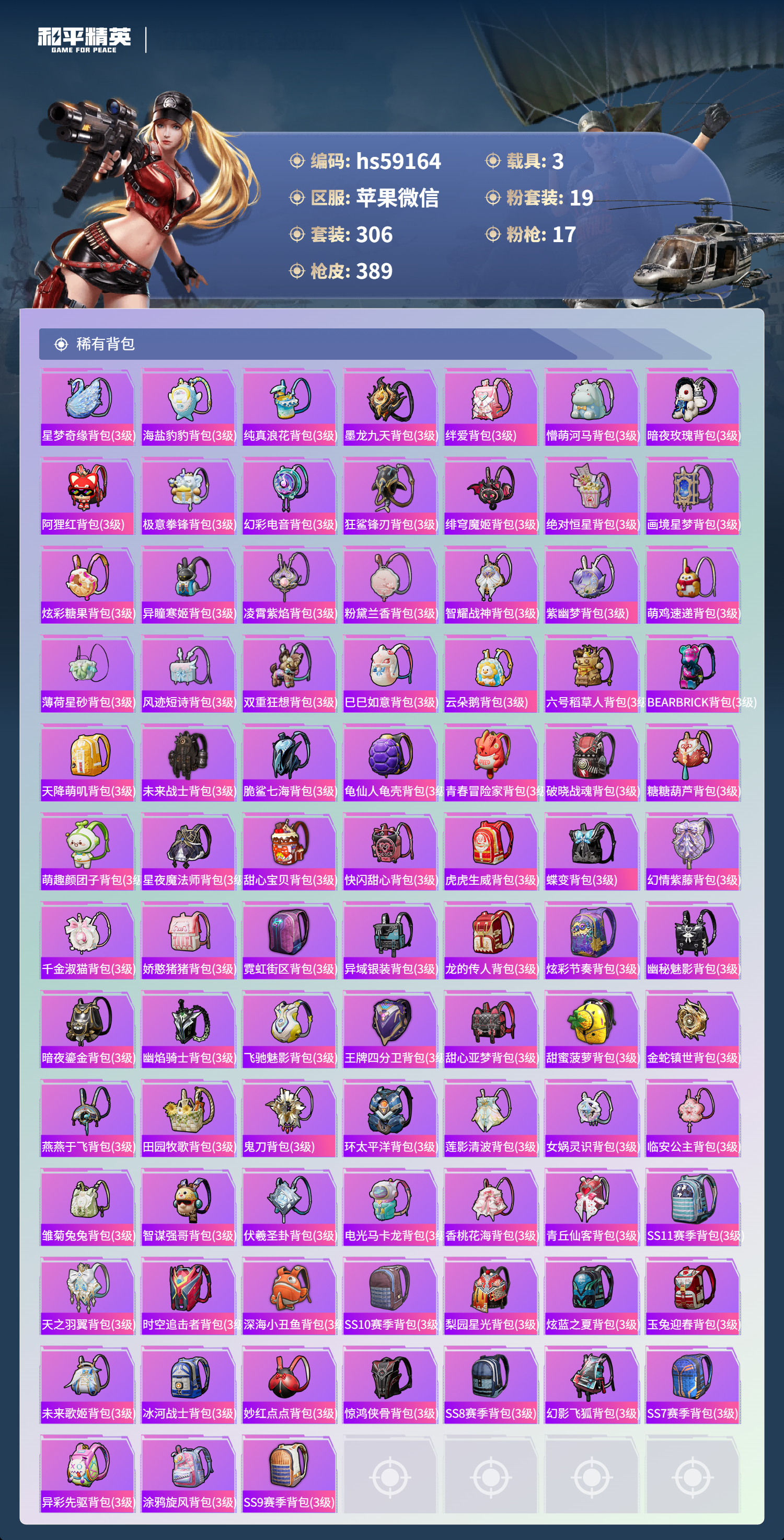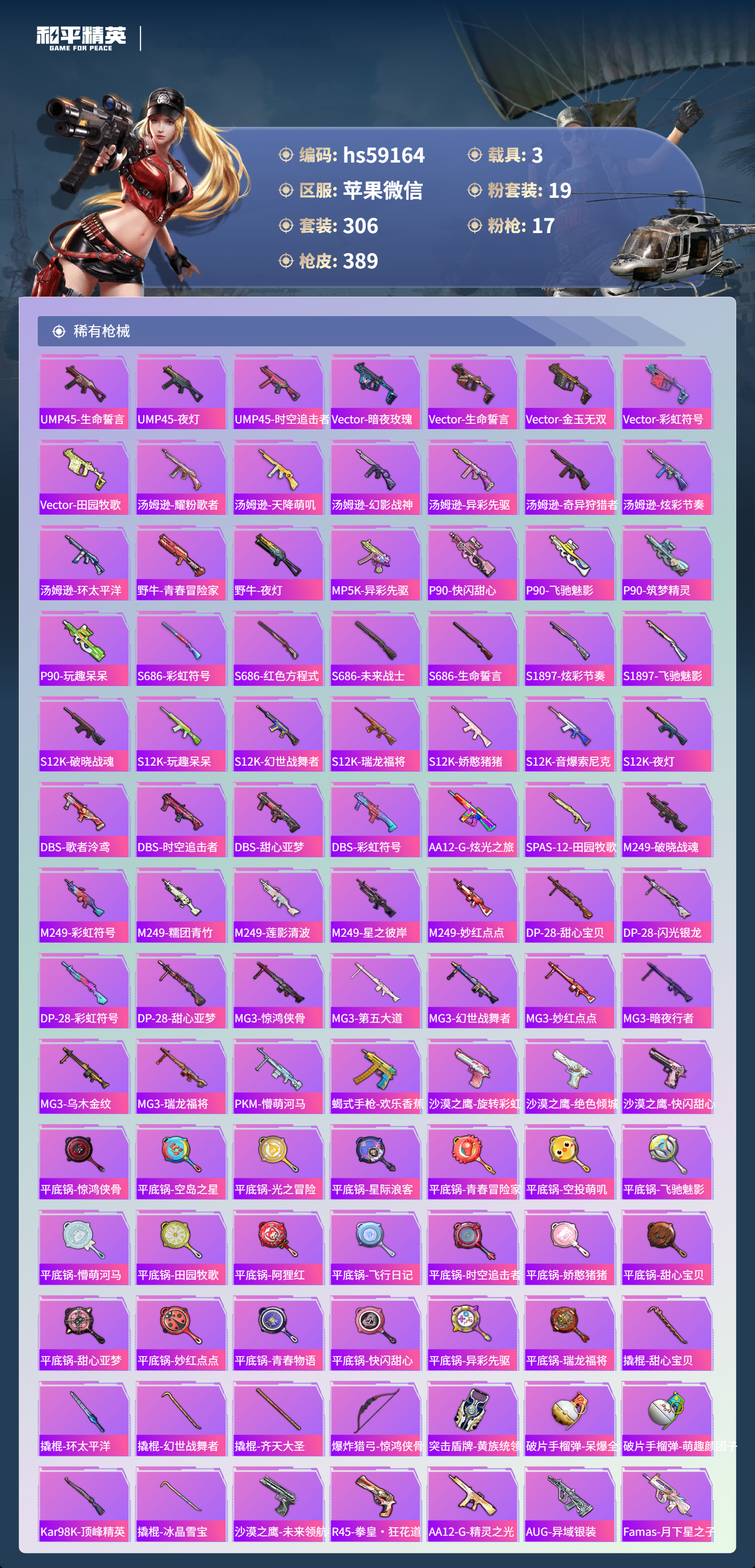 hs59164 苹果微信-23王牌印记-有战神框-1红装-19粉装-17特效枪-3载具-热力值-306套装-389枪皮-1卓越印记
