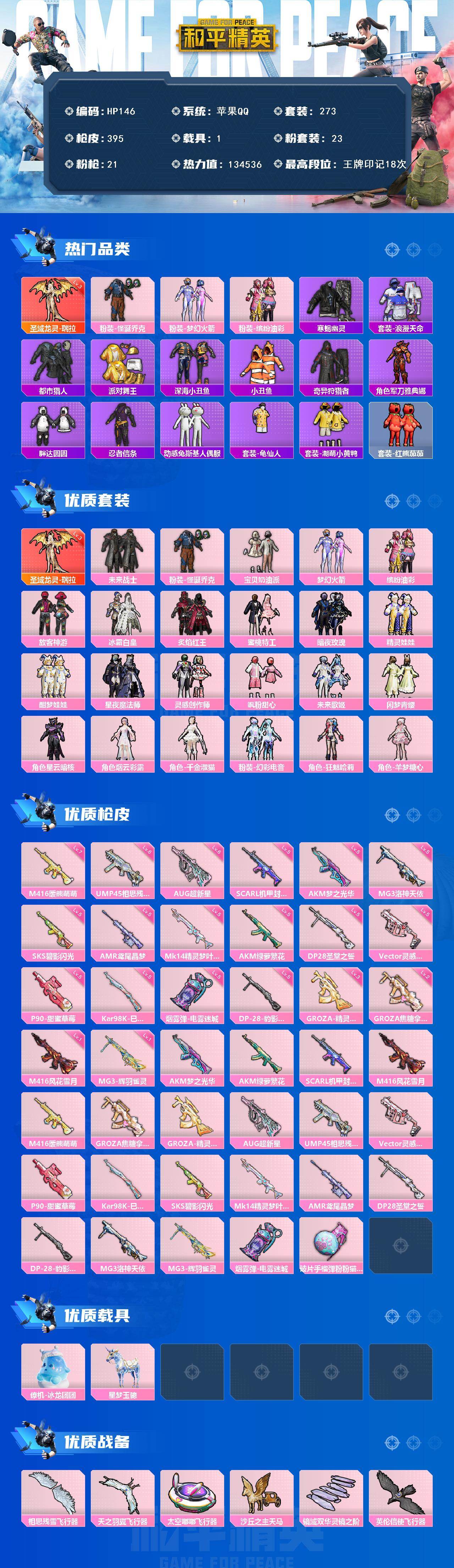 苹果 手Q-1神装-23粉装-21特效枪-1载具-9粉色飞行器-134536热力值-18王牌印记-273套装-395枪皮