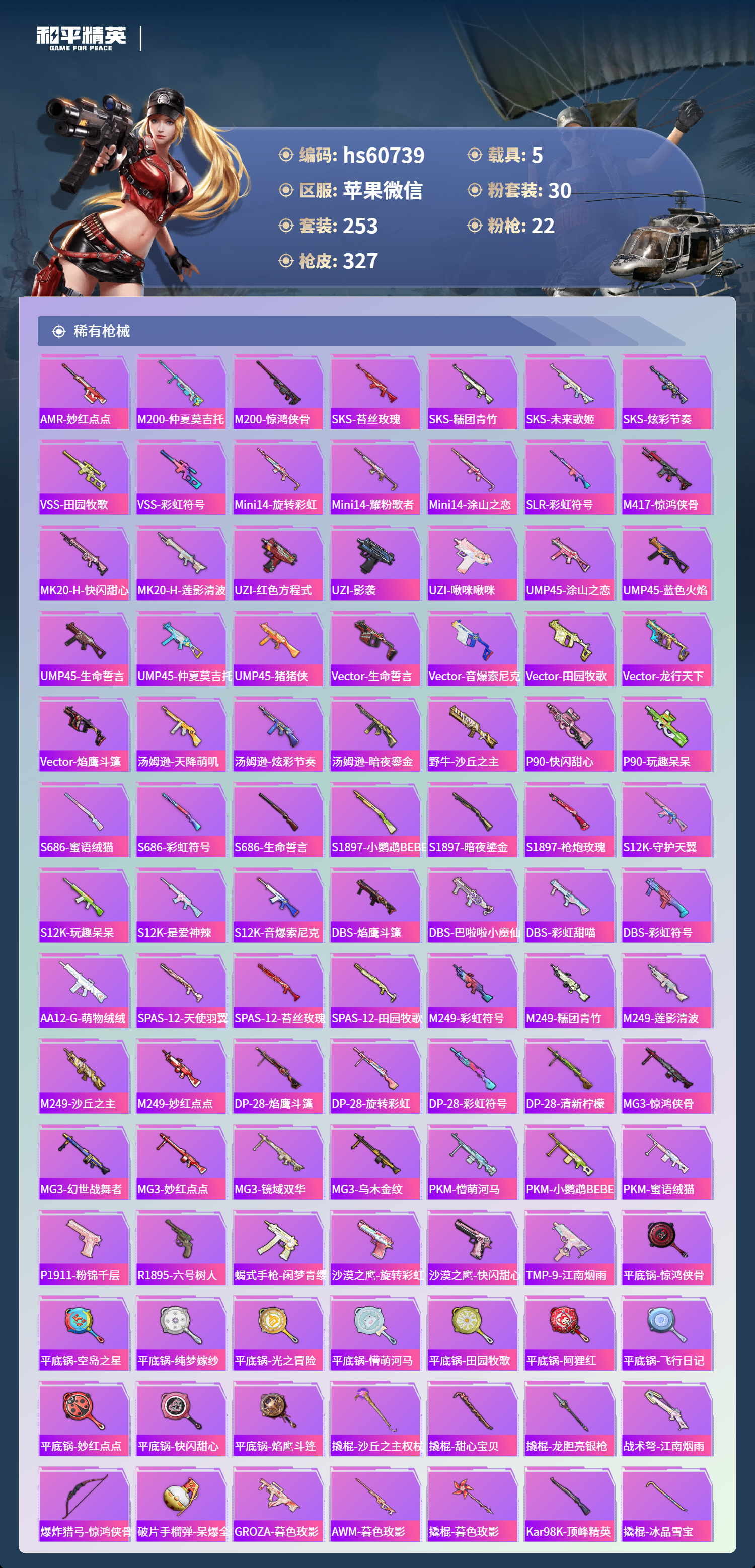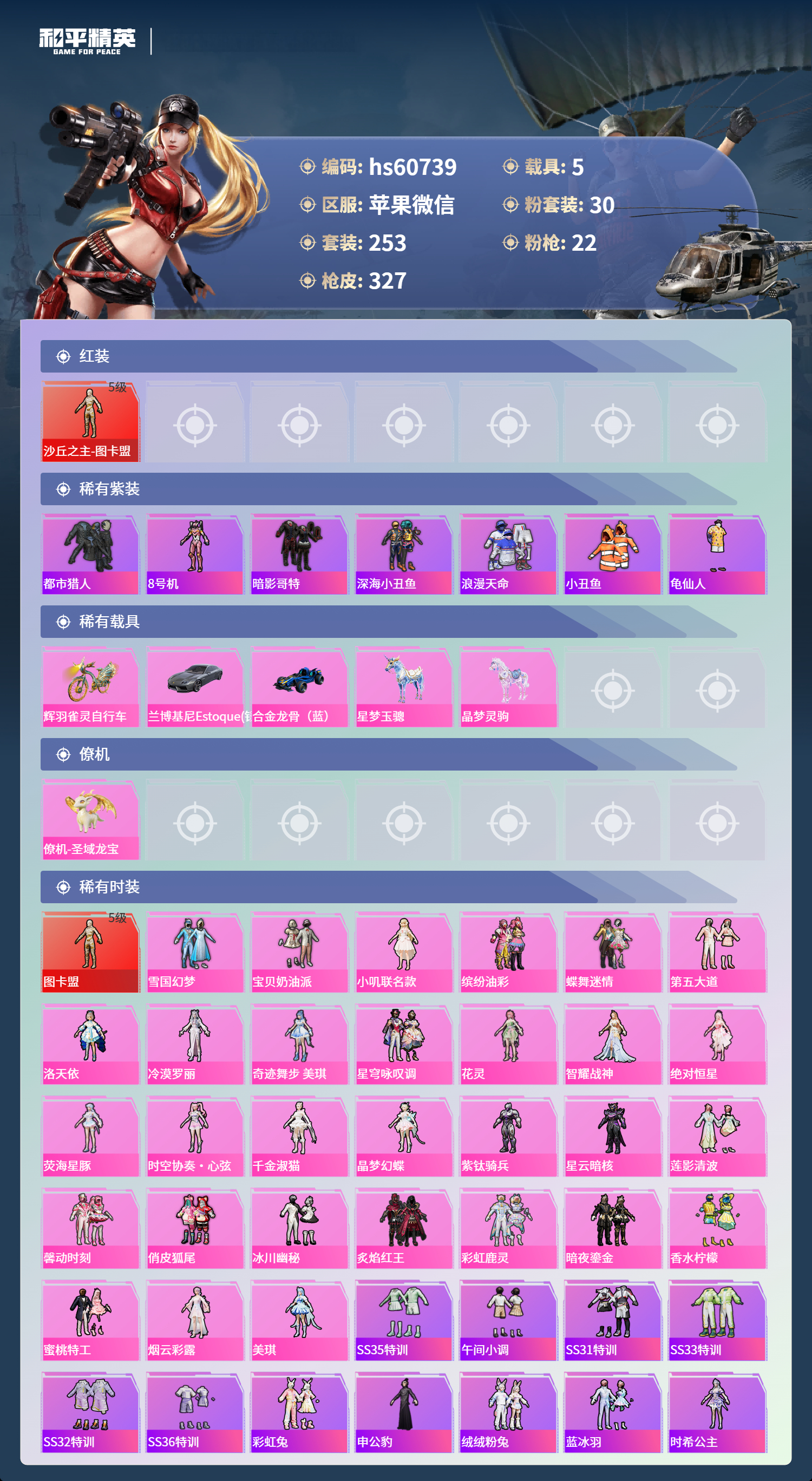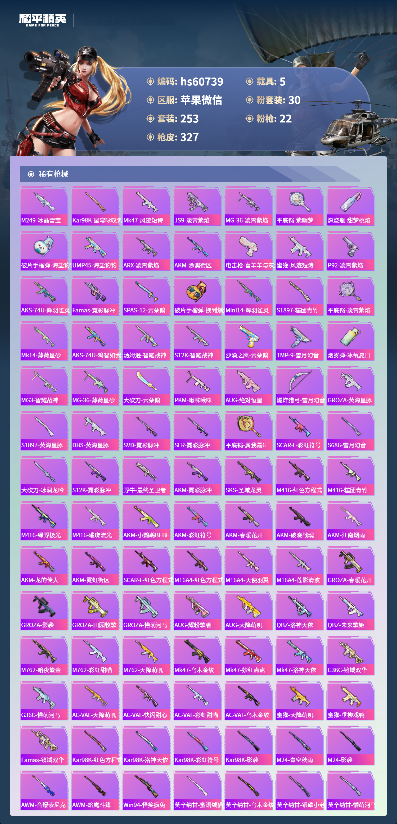 hs60739 苹果微信-16王牌印记-1红装-30粉装-22特效枪-5载具-热力值-253套装-327枪皮-5卓越印记-2传奇印记