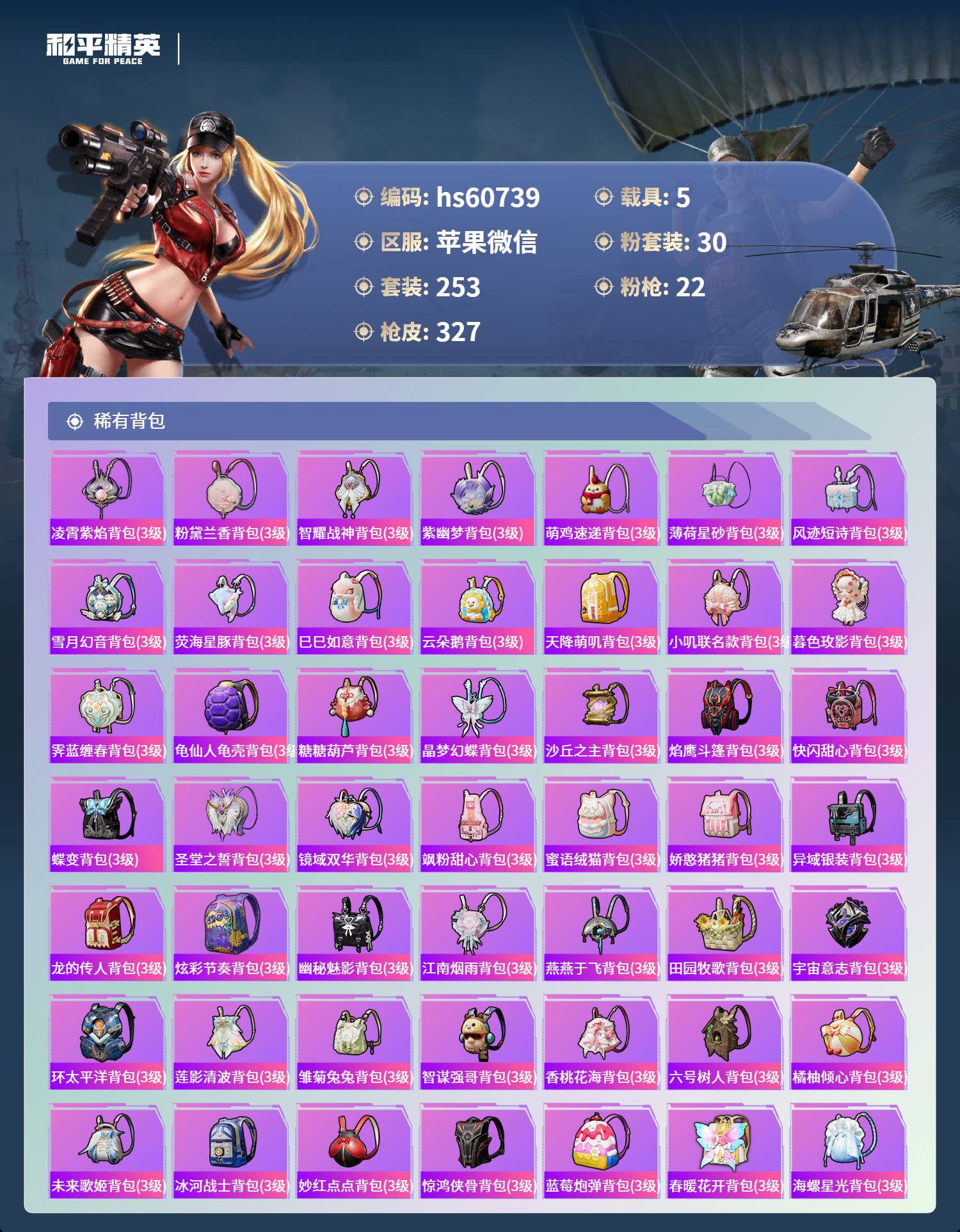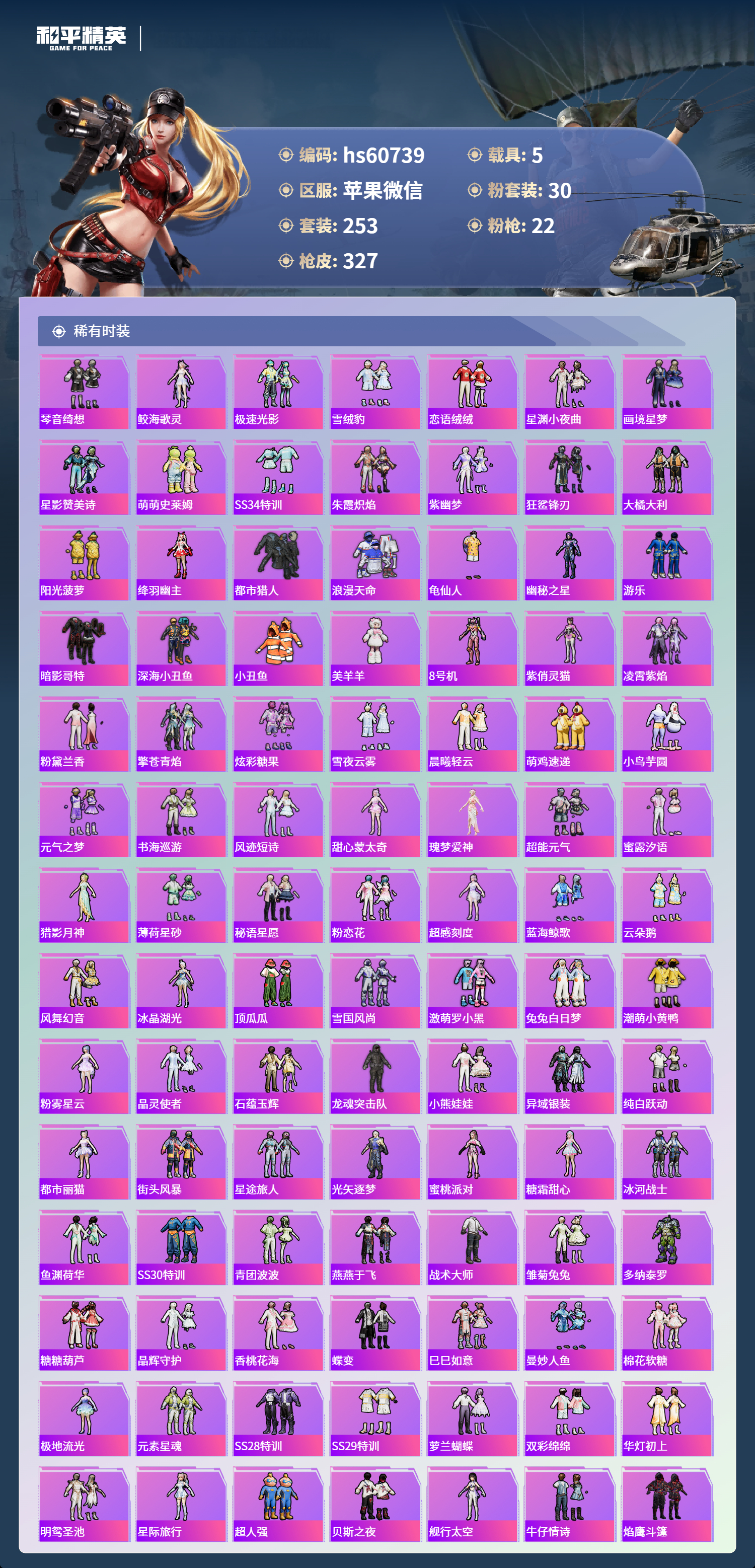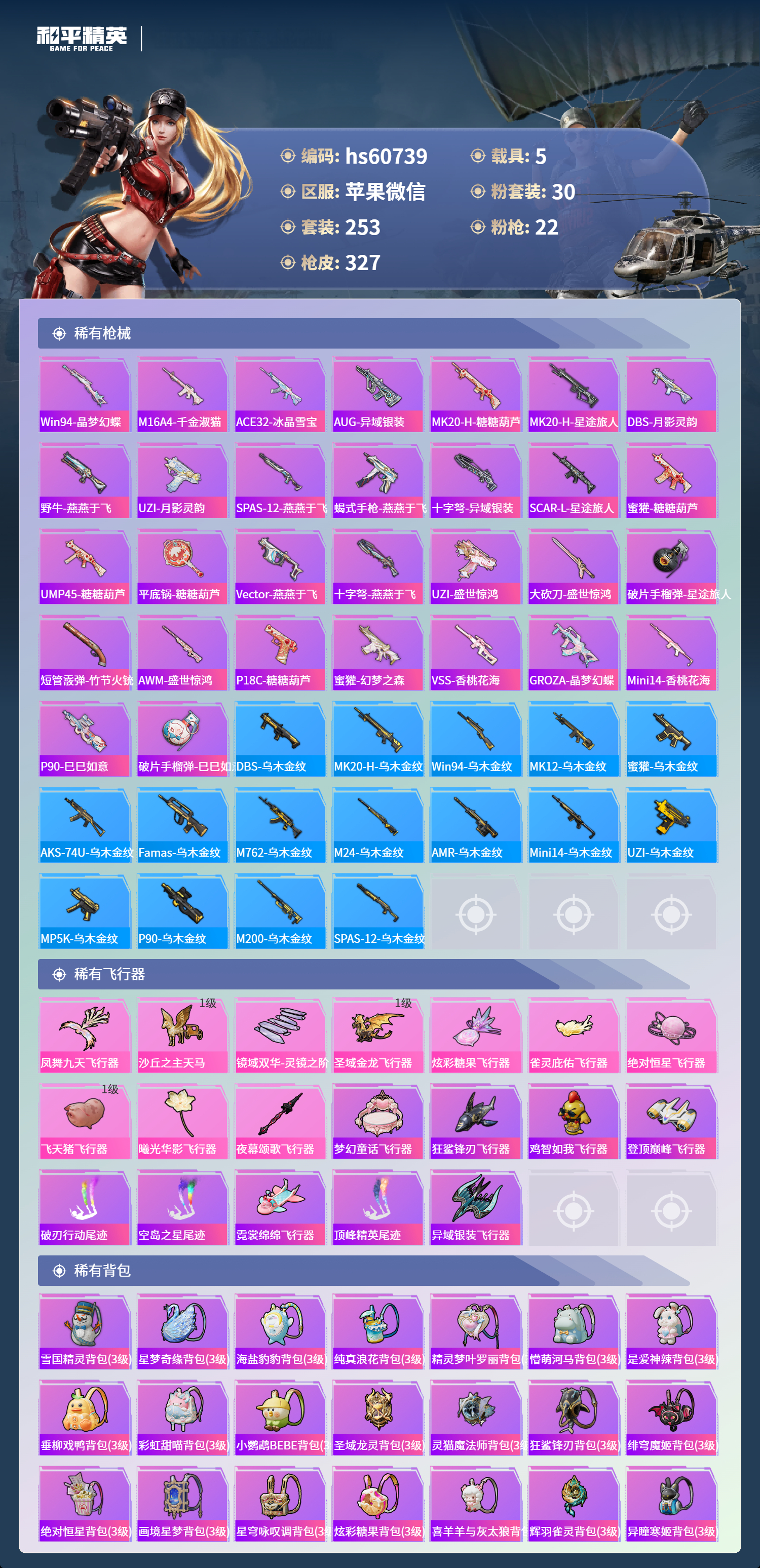 hs60739 苹果微信-16王牌印记-1红装-30粉装-22特效枪-5载具-热力值-253套装-327枪皮-5卓越印记-2传奇印记