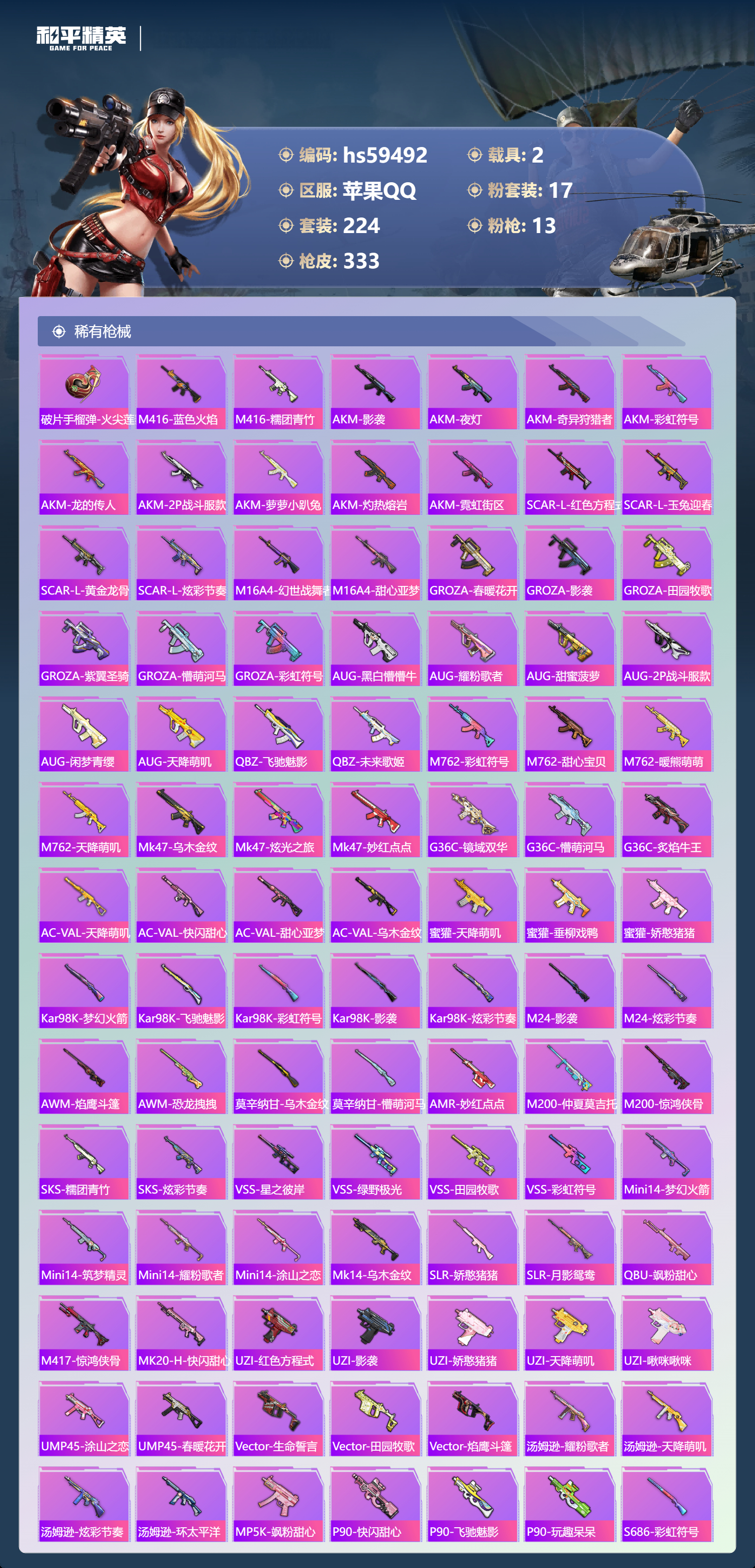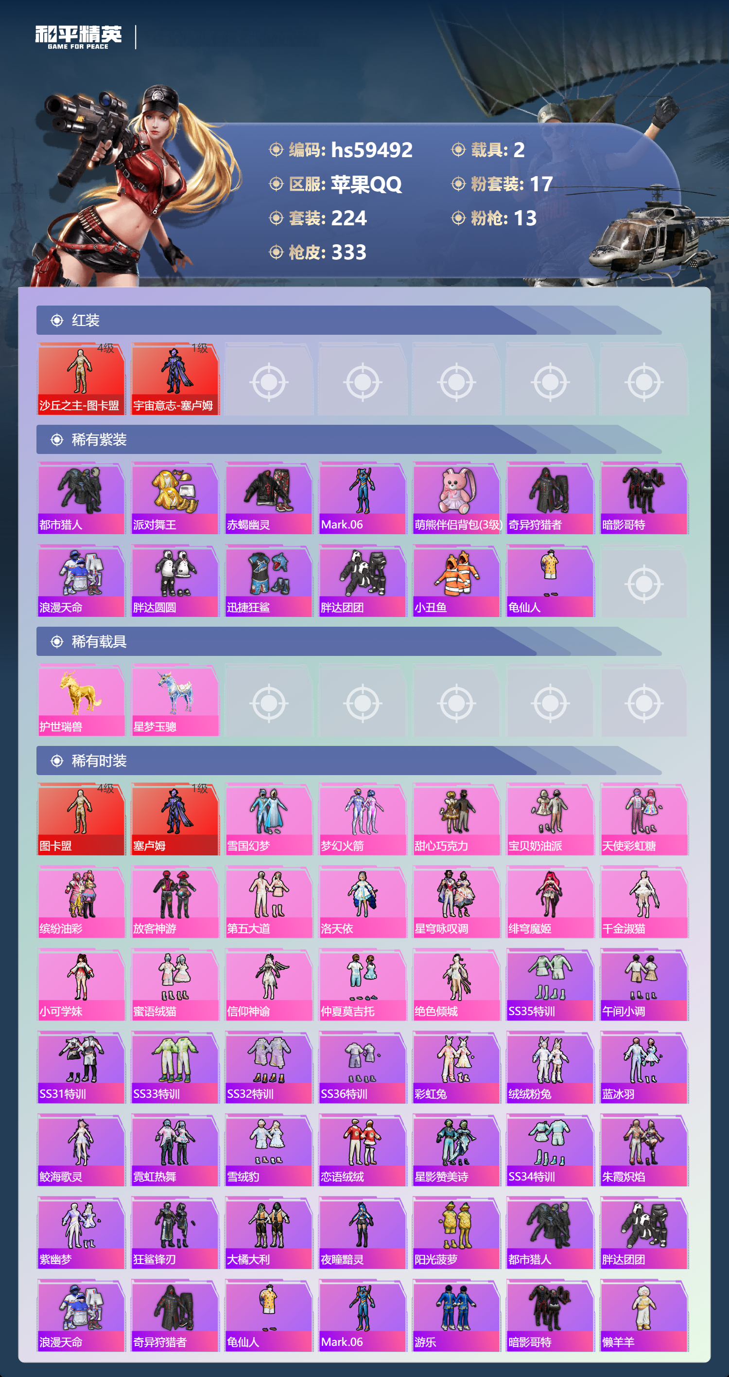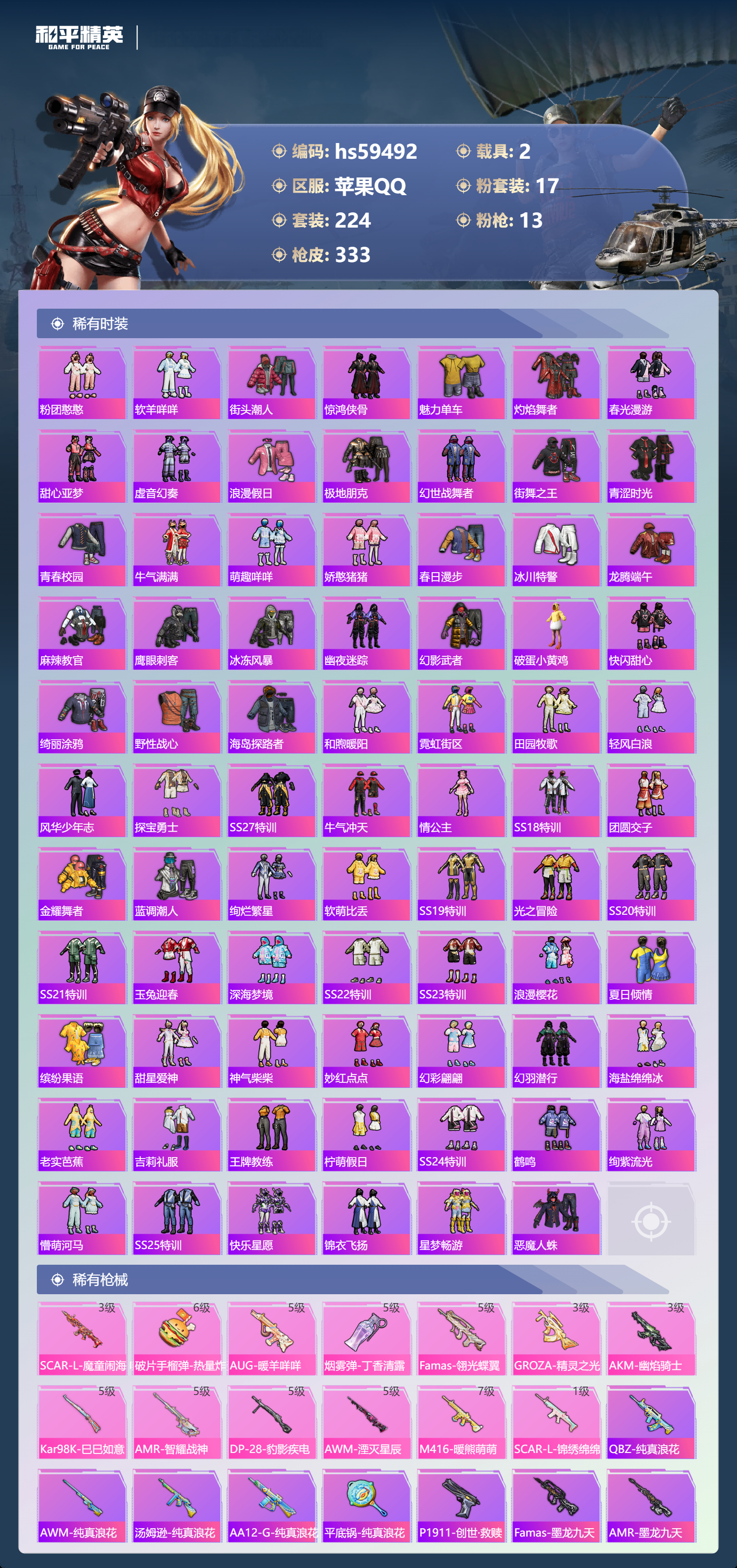 hs59492 苹果手Q-17王牌印记-2红装-17粉装-13特效枪-2载具-热力值-224套装-333枪皮-7卓越印记-4传奇印记