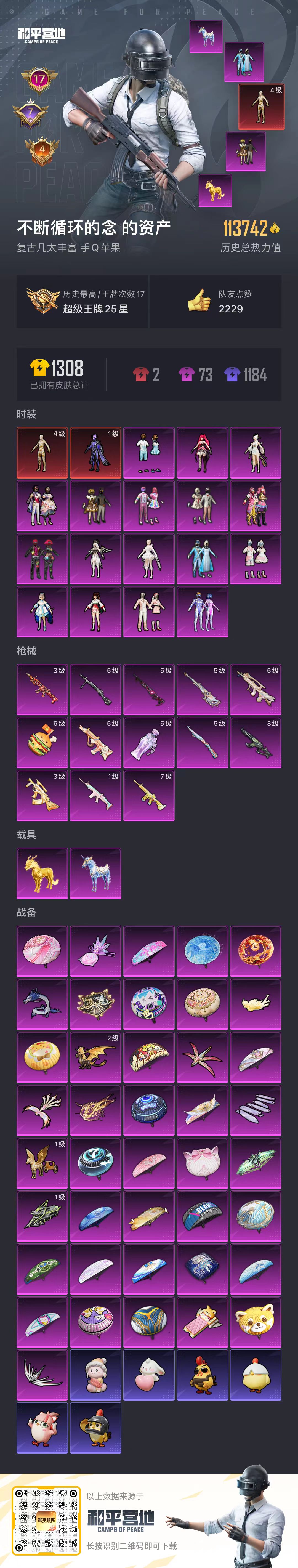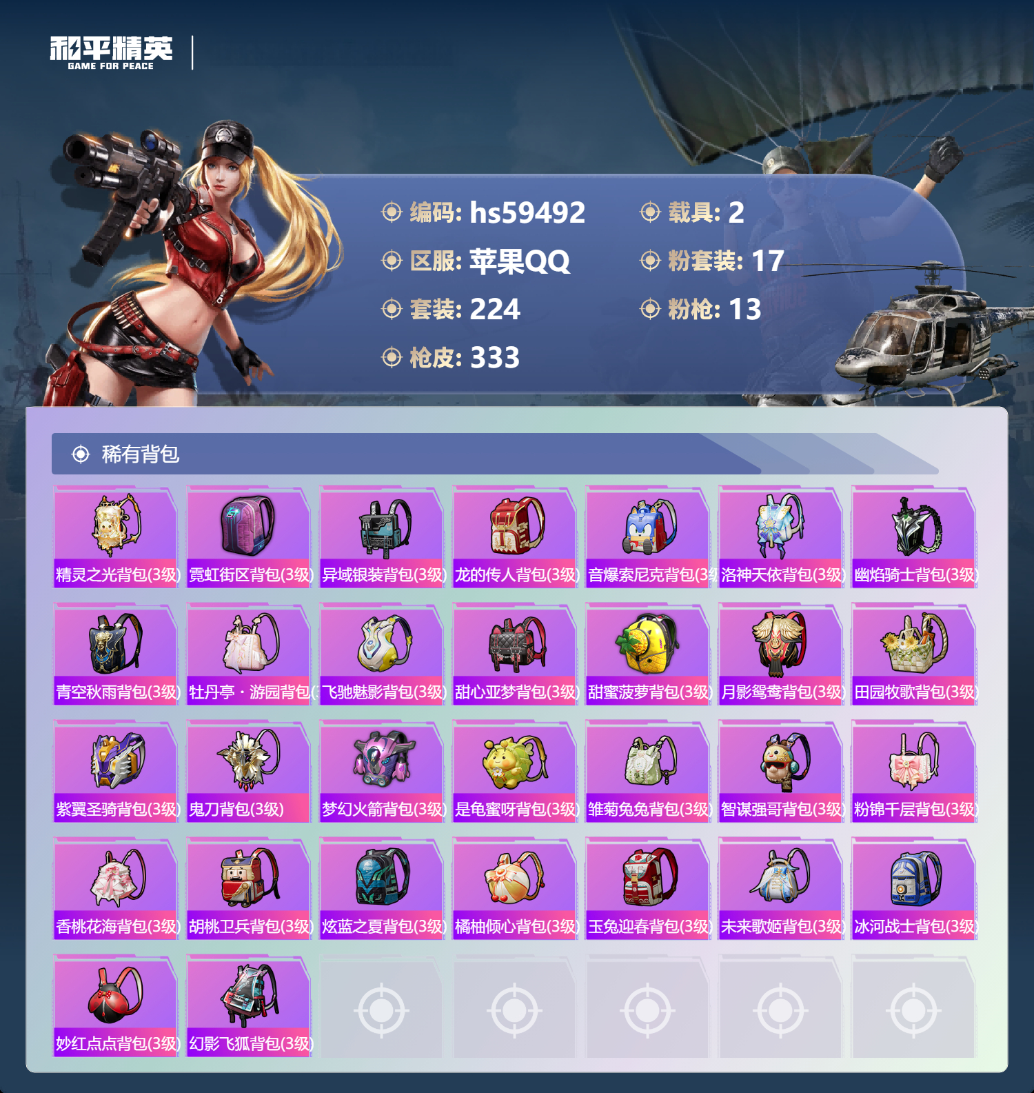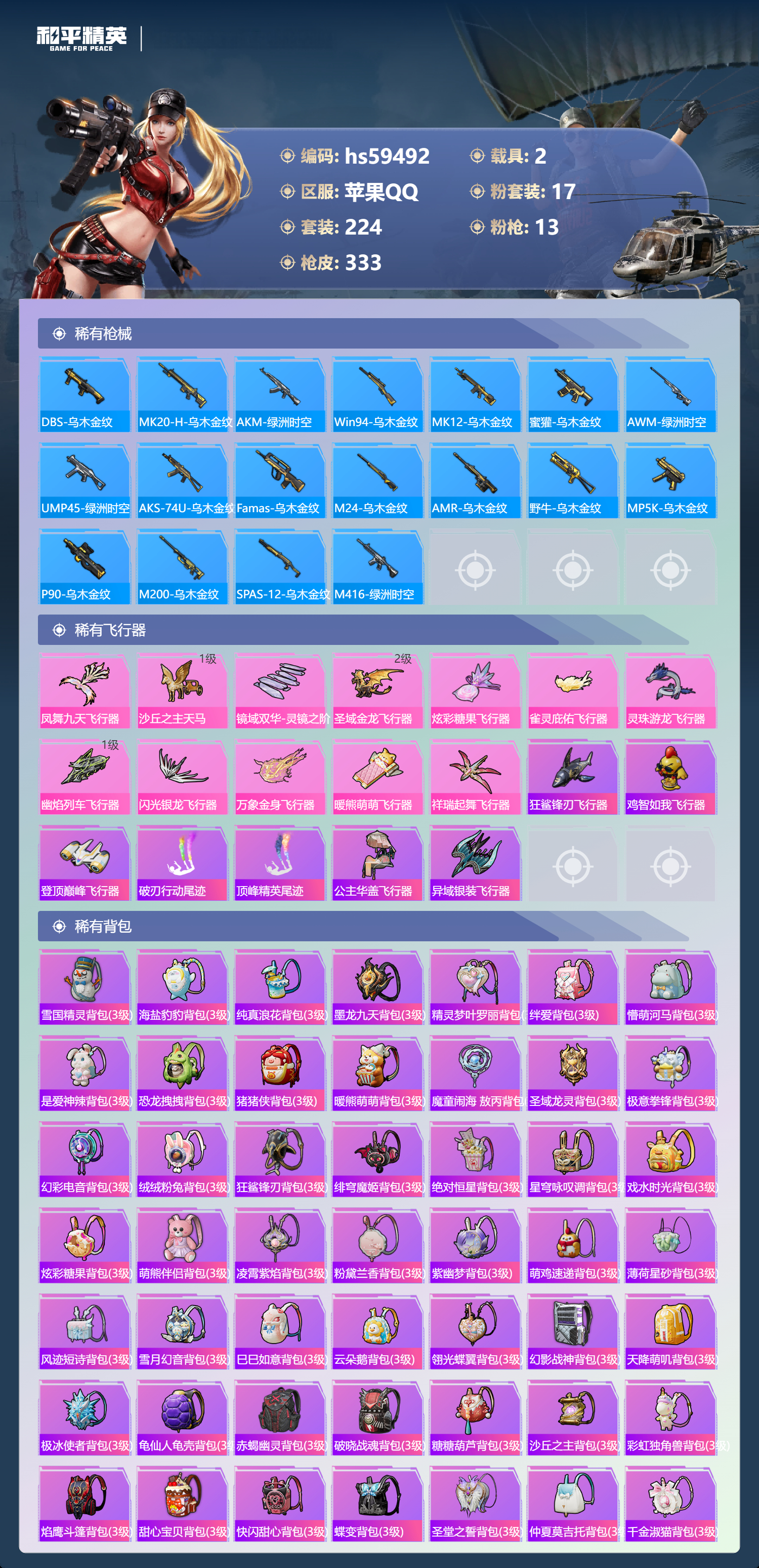 hs59492 苹果手Q-17王牌印记-2红装-17粉装-13特效枪-2载具-热力值-224套装-333枪皮-7卓越印记-4传奇印记