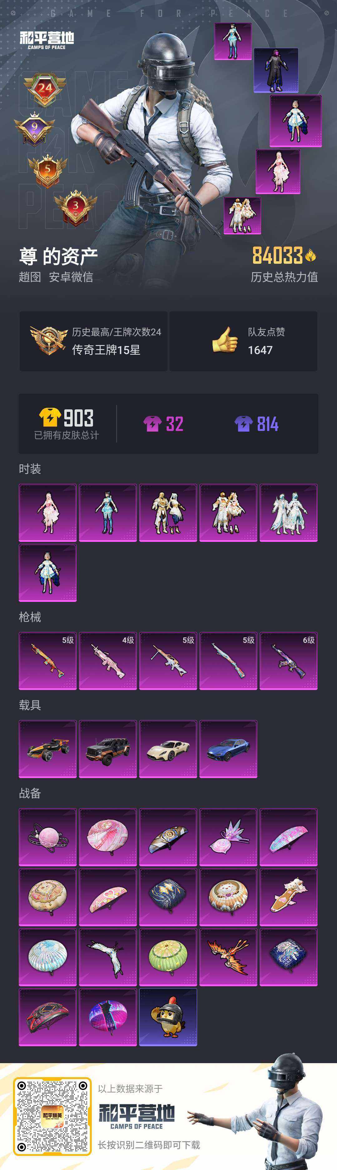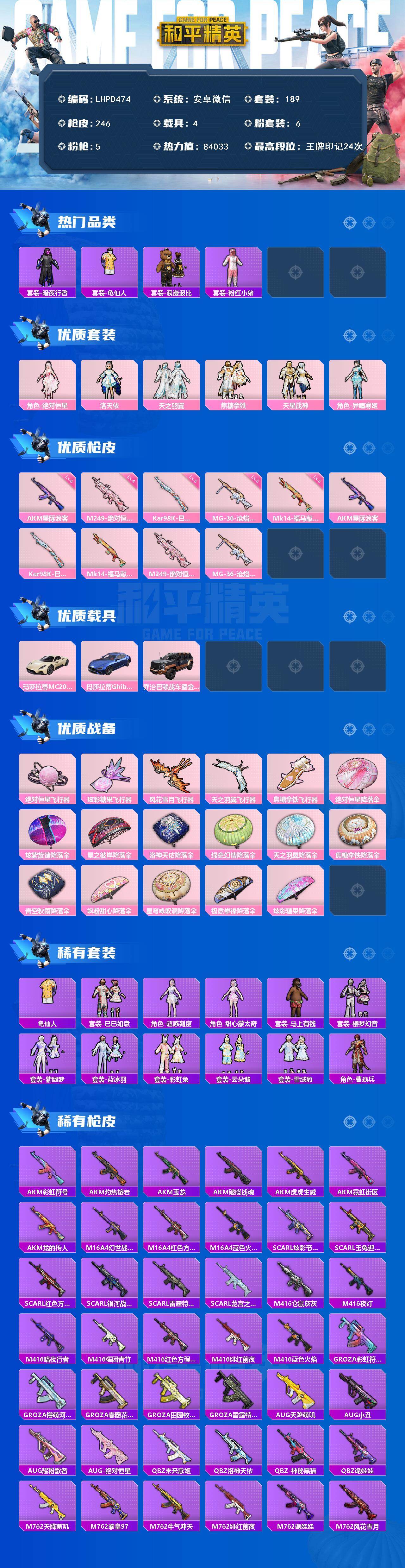 【店主推荐捡漏号!可直接换绑】安卓 微信-6粉装-5特效枪-4载具-5粉色飞行器-84033热力值-24王牌印记-189套装-246枪皮【热门品类】:套装-暗夜行者,套装-龟仙人,套装-浪漫波比,套装-粉红小猪【粉色套装】:角色-绝对恒星,角色-洛天依,粉装-天之羽翼,粉装-焦糖拿铁,粉装-天星战神,角色-异瞳寒姬【粉色枪皮等级】:AKM-星际浪客(六级),Kar98K-巳巳如意(五级),Mk1