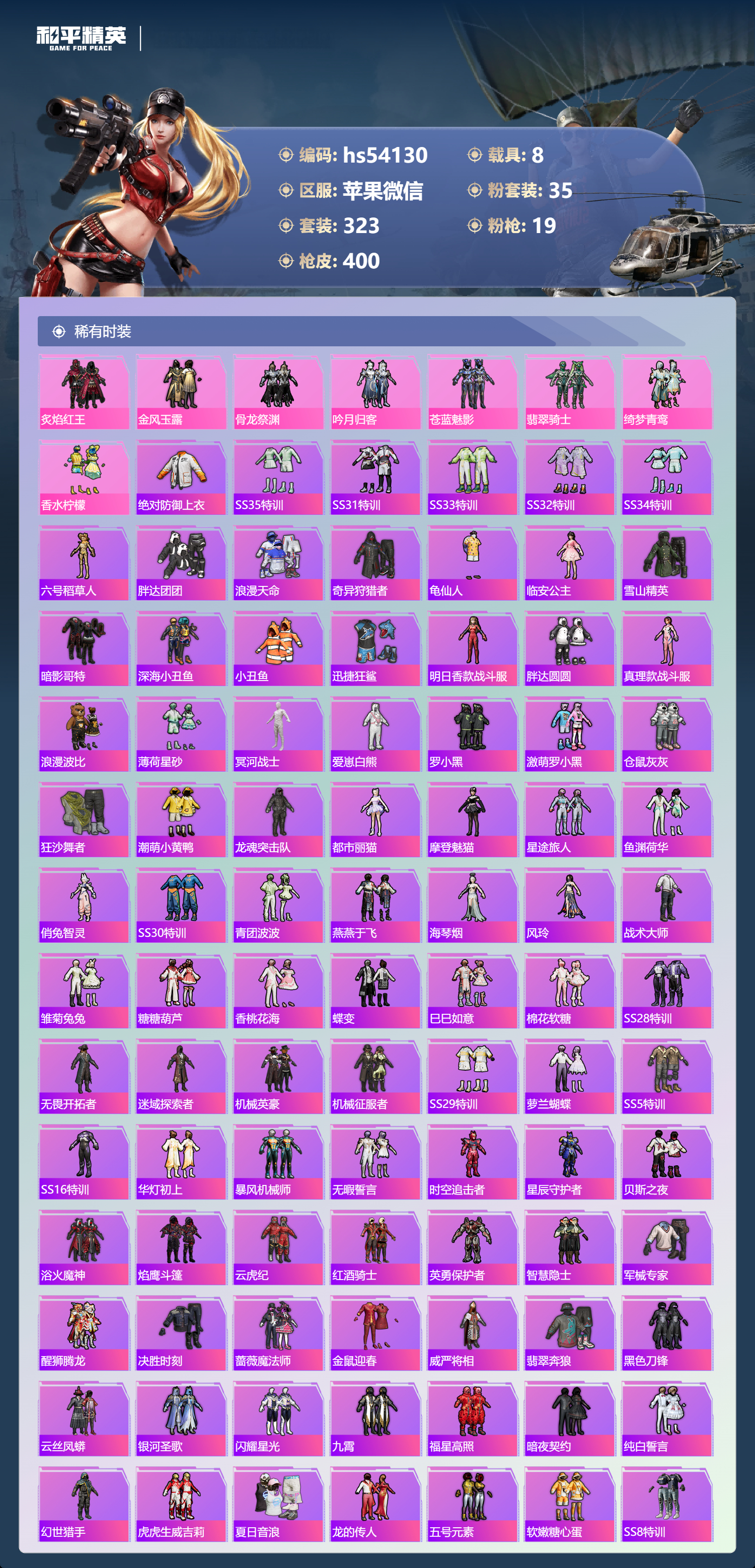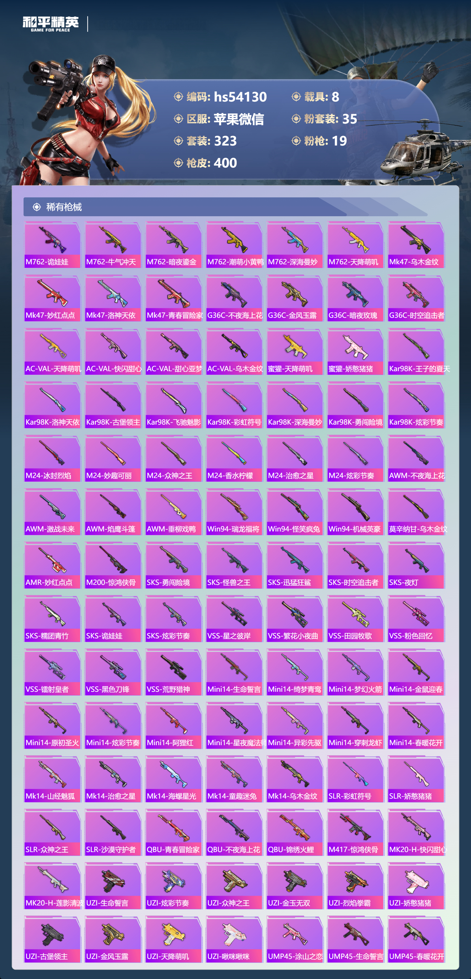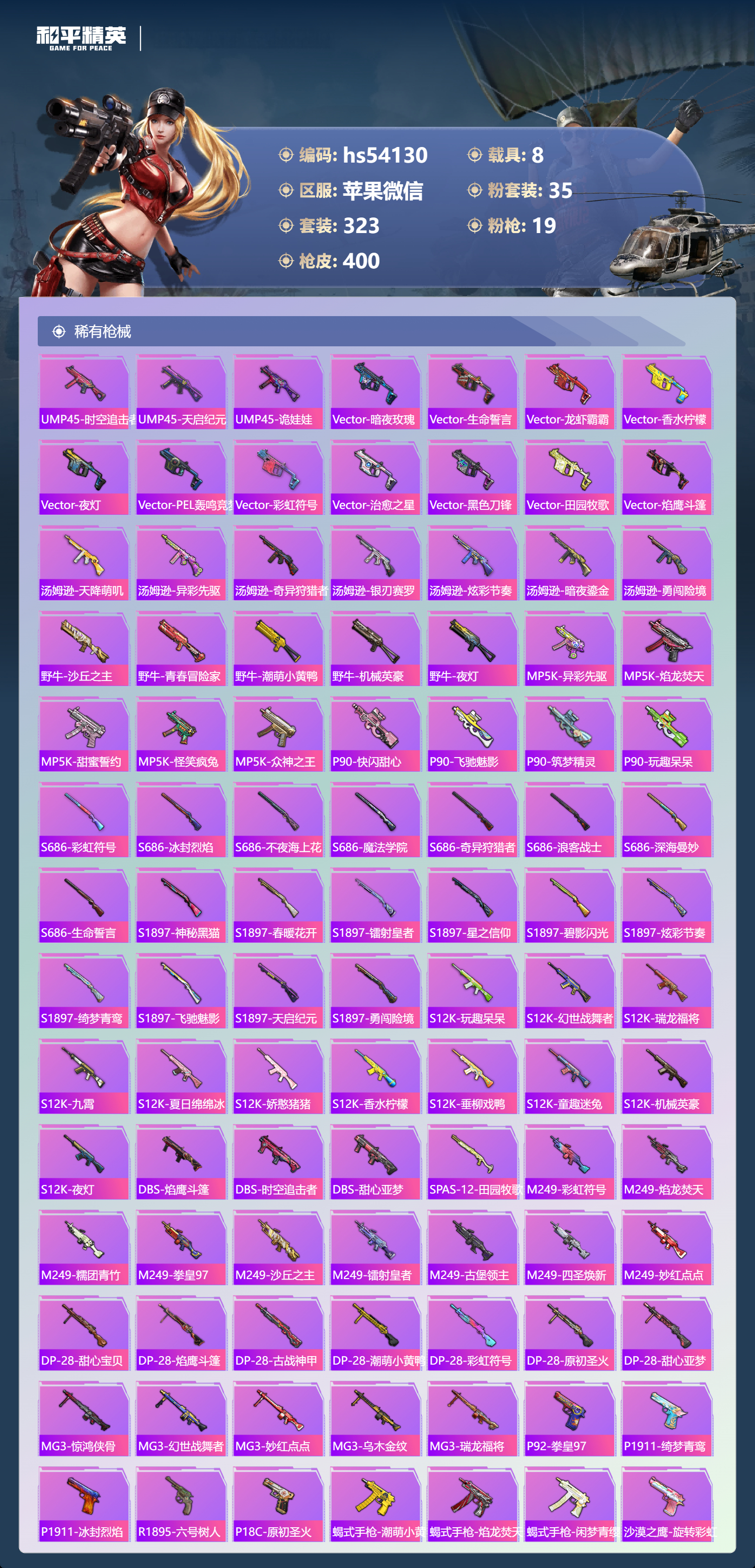 hs54130 苹果微信-27王牌印记-1红装-35粉装-19特效枪-8载具-热力值-323套装-400枪皮-3卓越印记-2传奇印记