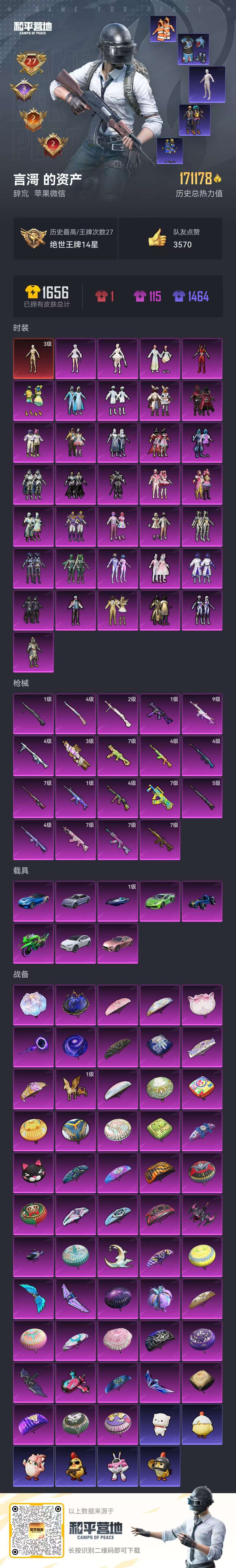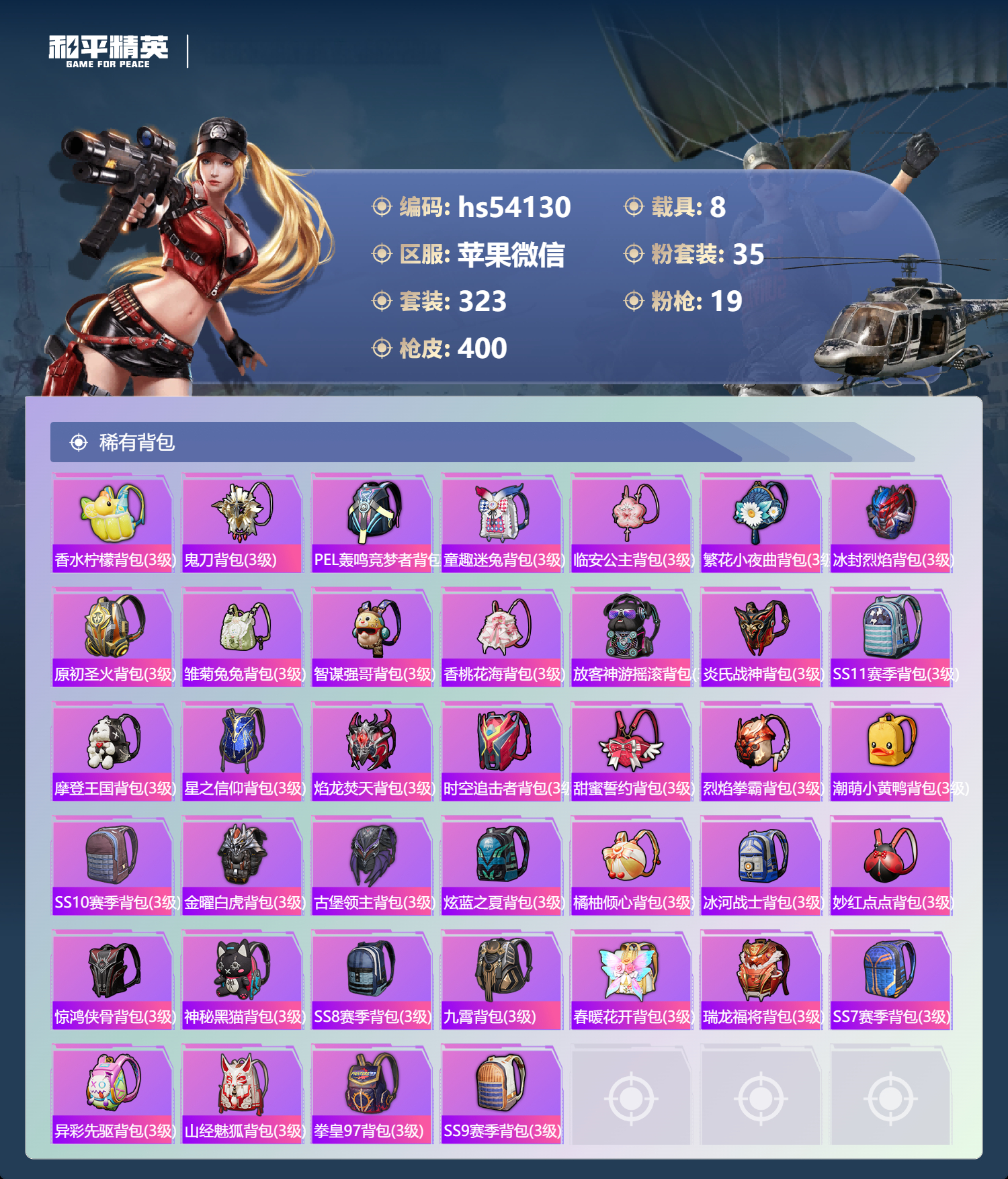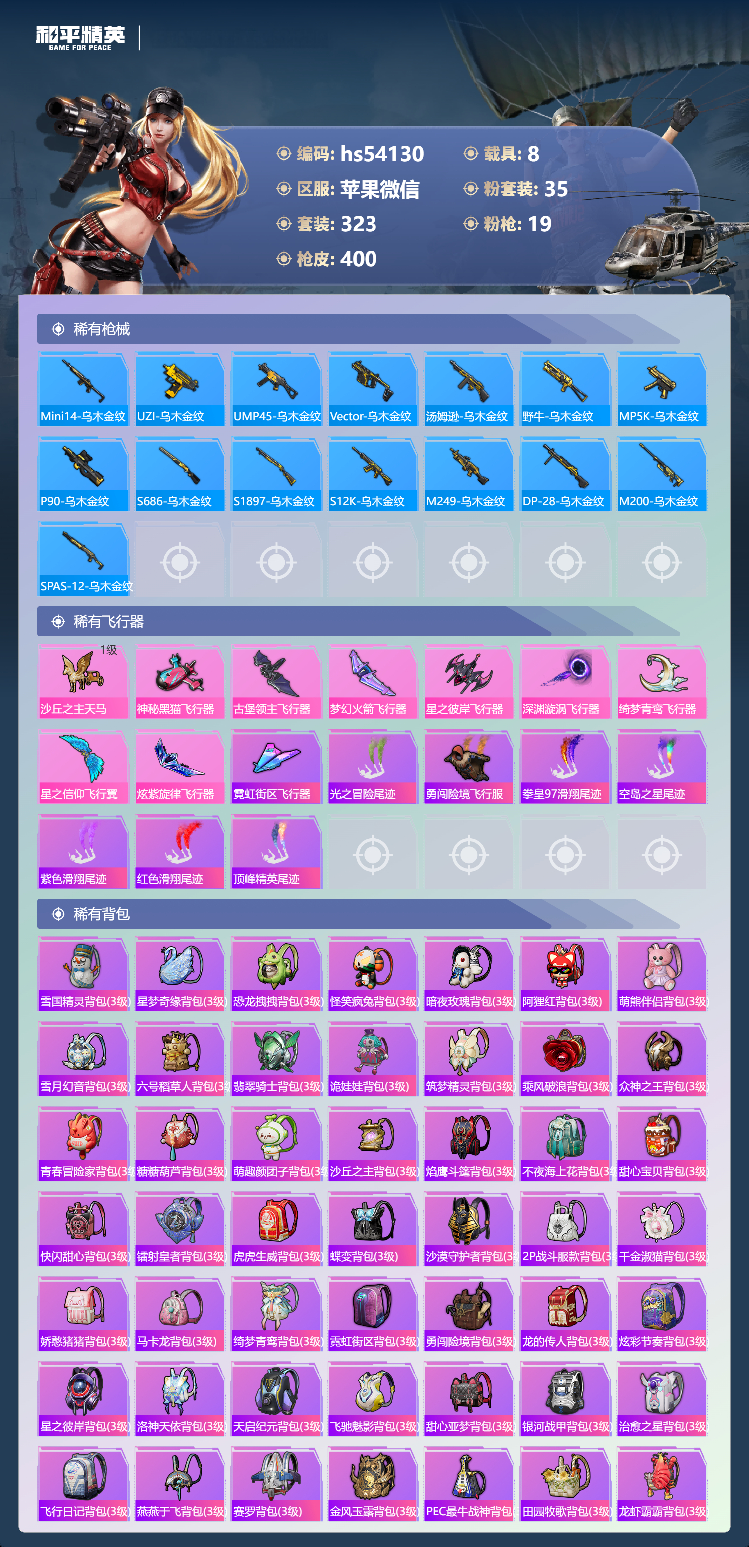 hs54130 苹果微信-27王牌印记-1红装-35粉装-19特效枪-8载具-热力值-323套装-400枪皮-3卓越印记-2传奇印记