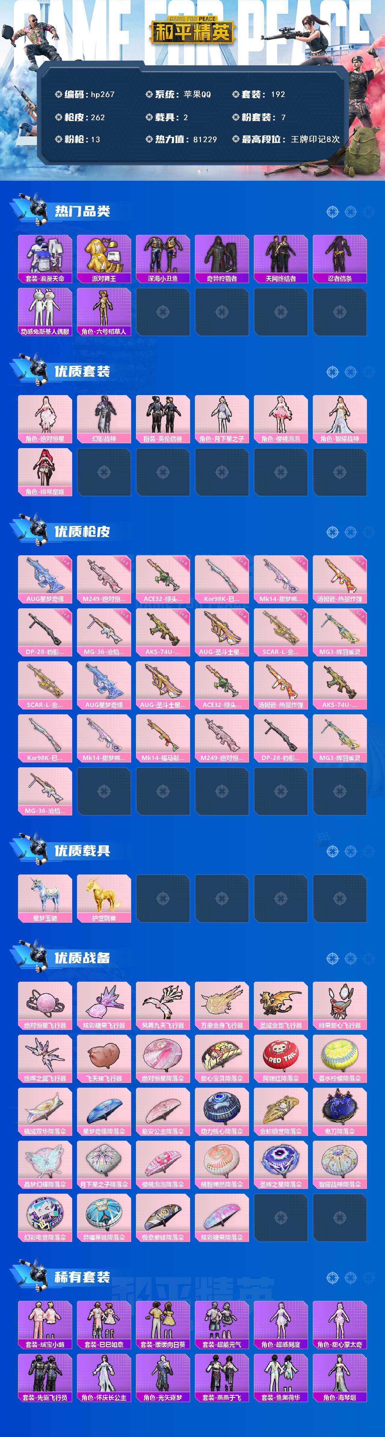 苹果 手Q-7粉装-13特效枪-2载具-8粉色飞行器-81229热力值-8王牌印记-192套装-262枪皮