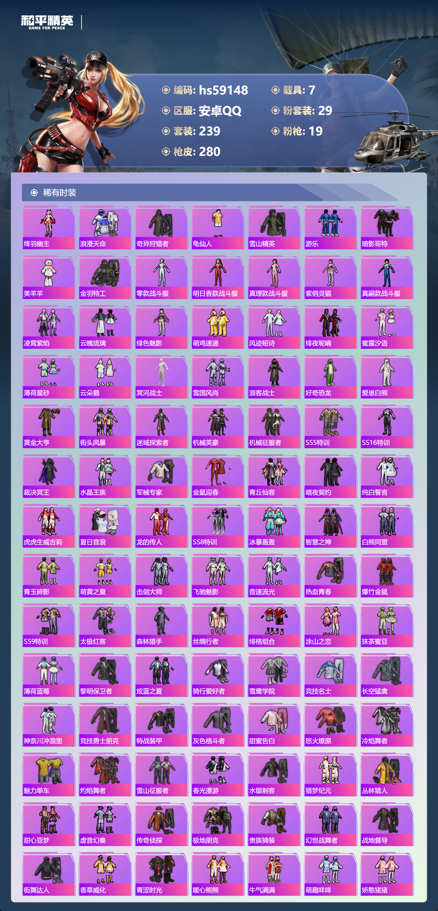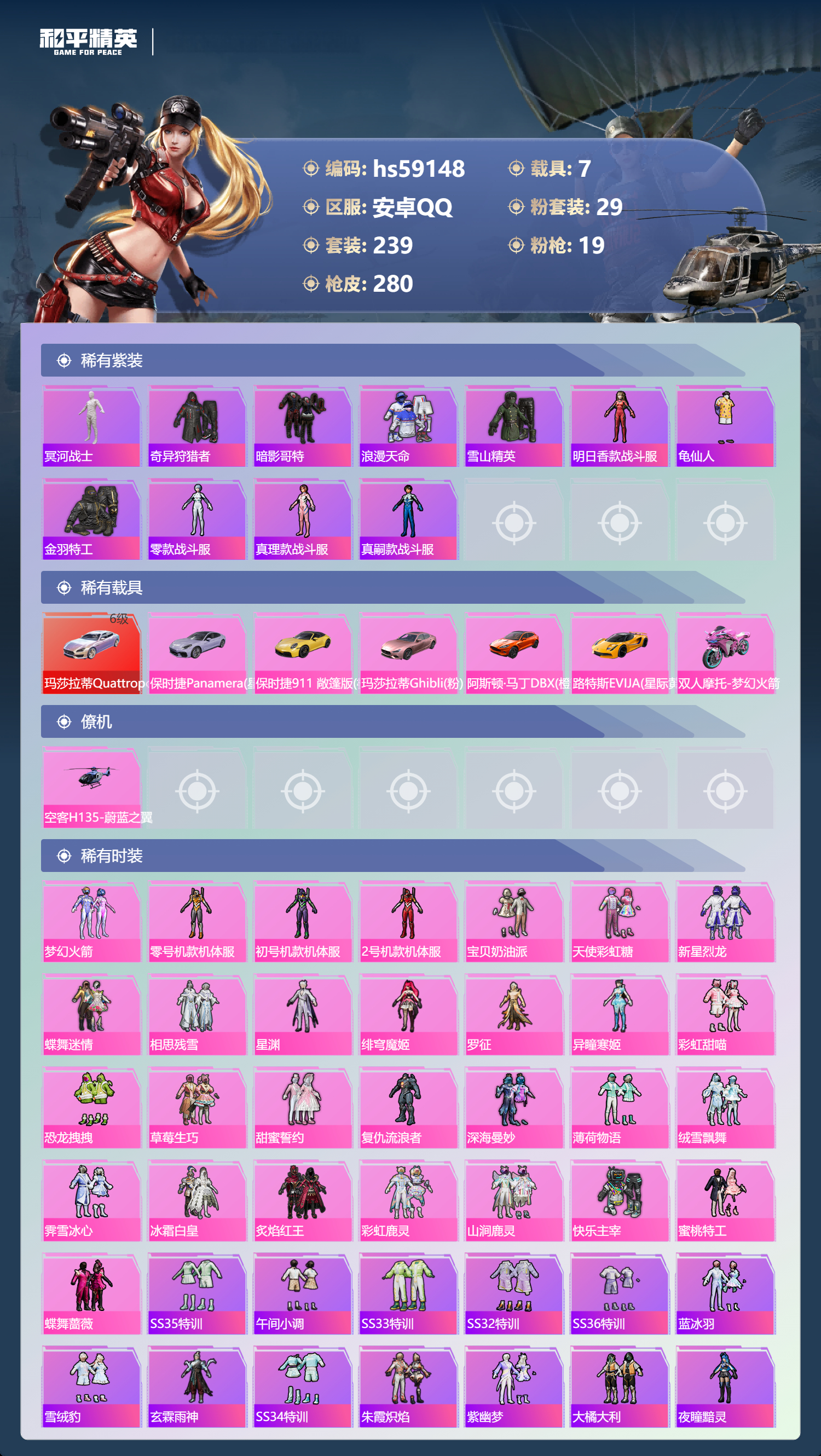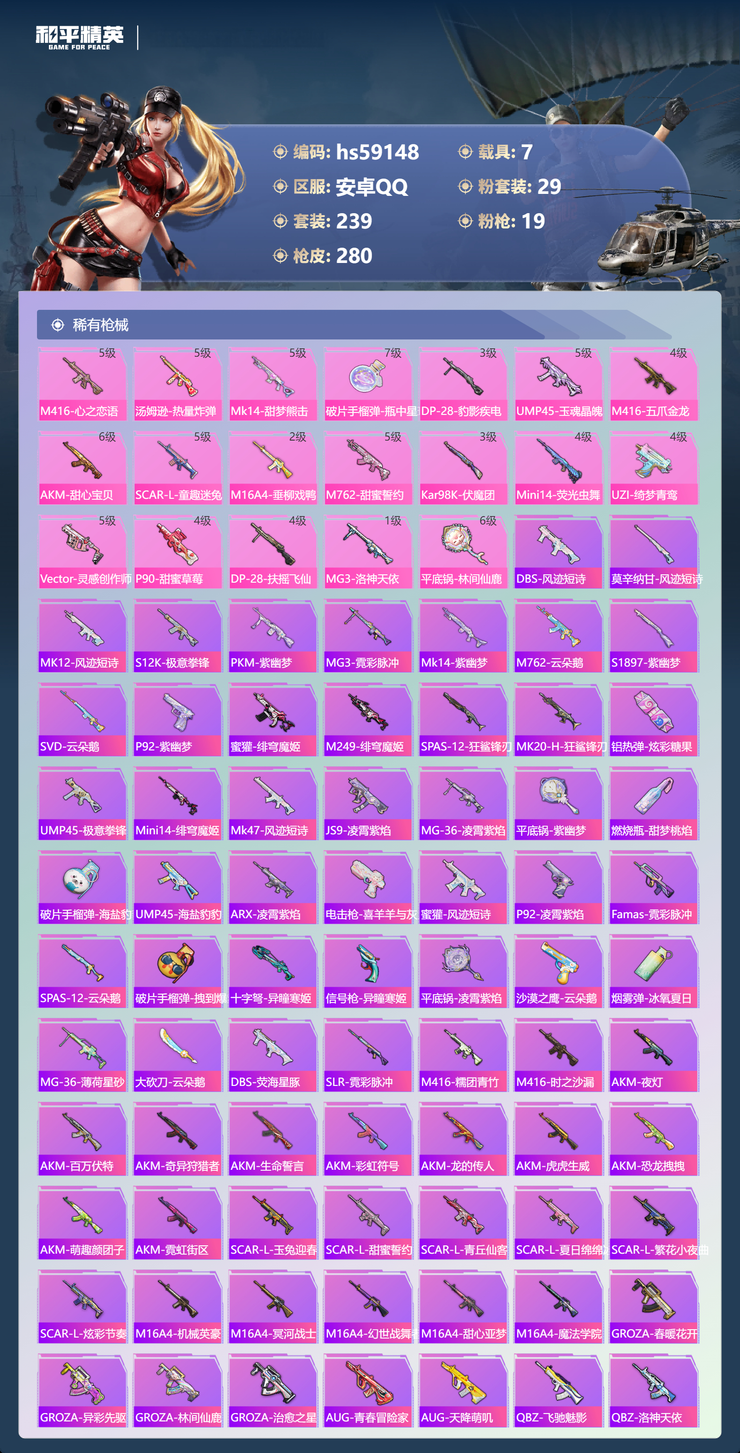 hs59148 安卓手Q-16王牌印记-有战神框-29粉装-19特效枪-7载具-热力值-239套装-280枪皮-3卓越印记-1传奇印记