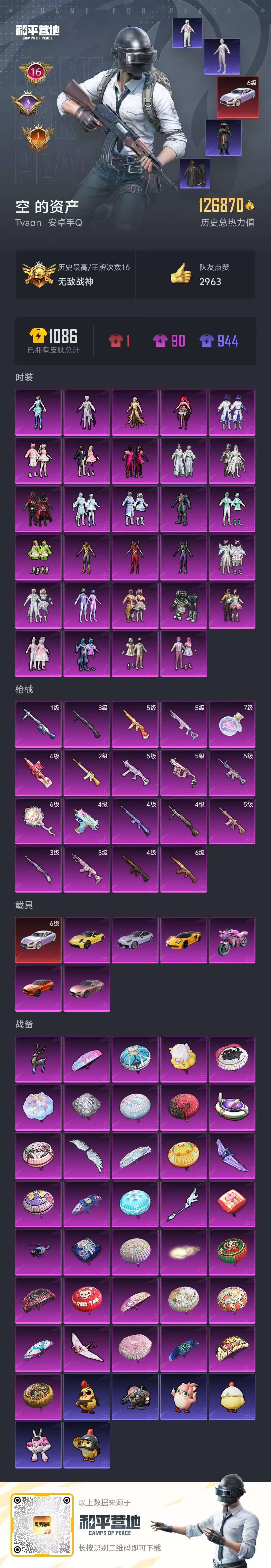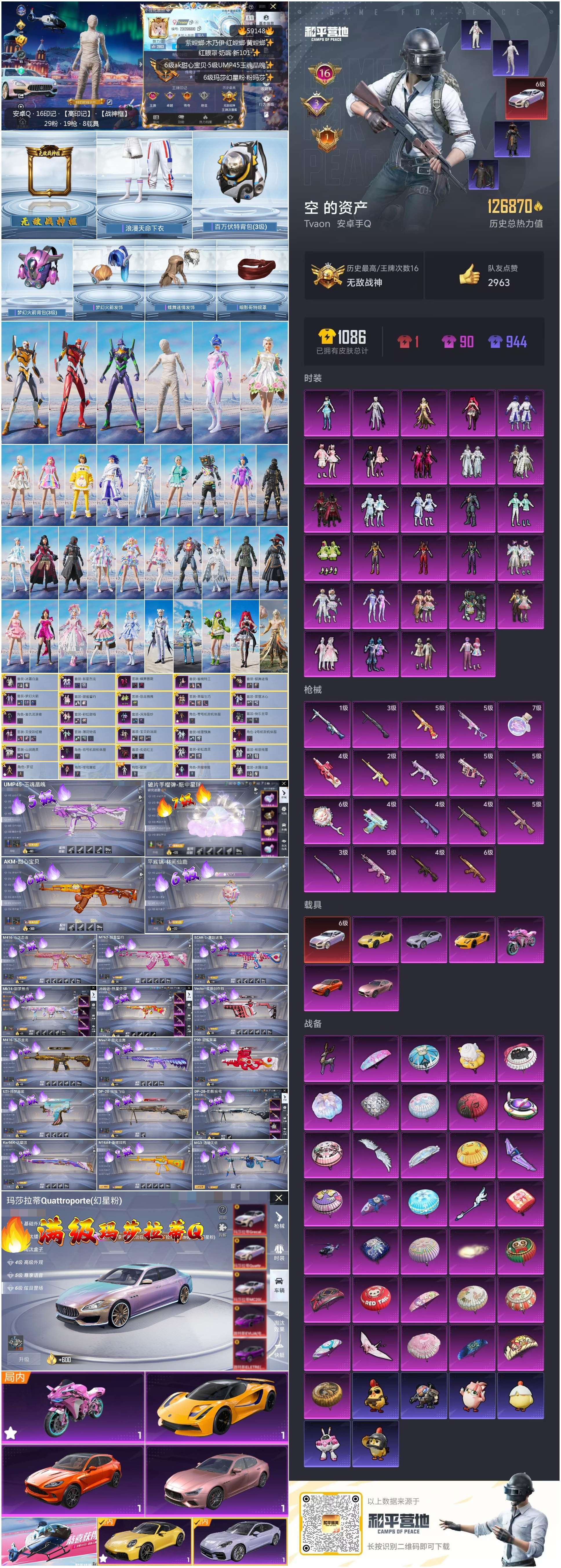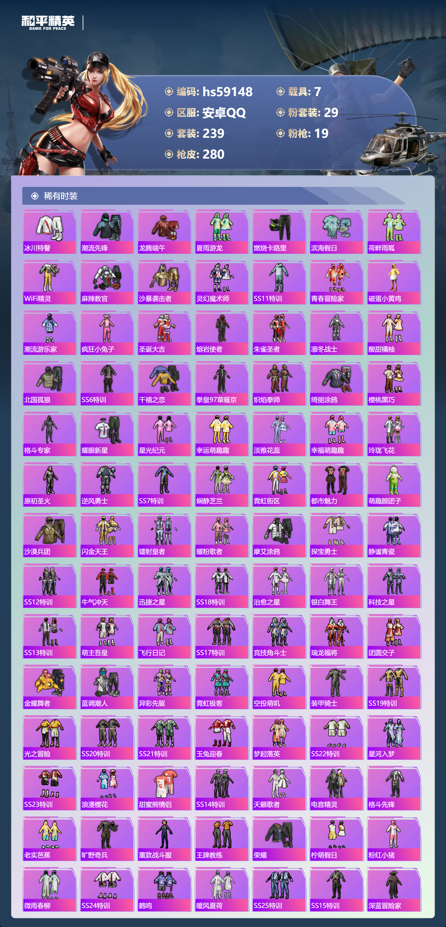 hs59148 安卓手Q-16王牌印记-有战神框-29粉装-19特效枪-7载具-热力值-239套装-280枪皮-3卓越印记-1传奇印记