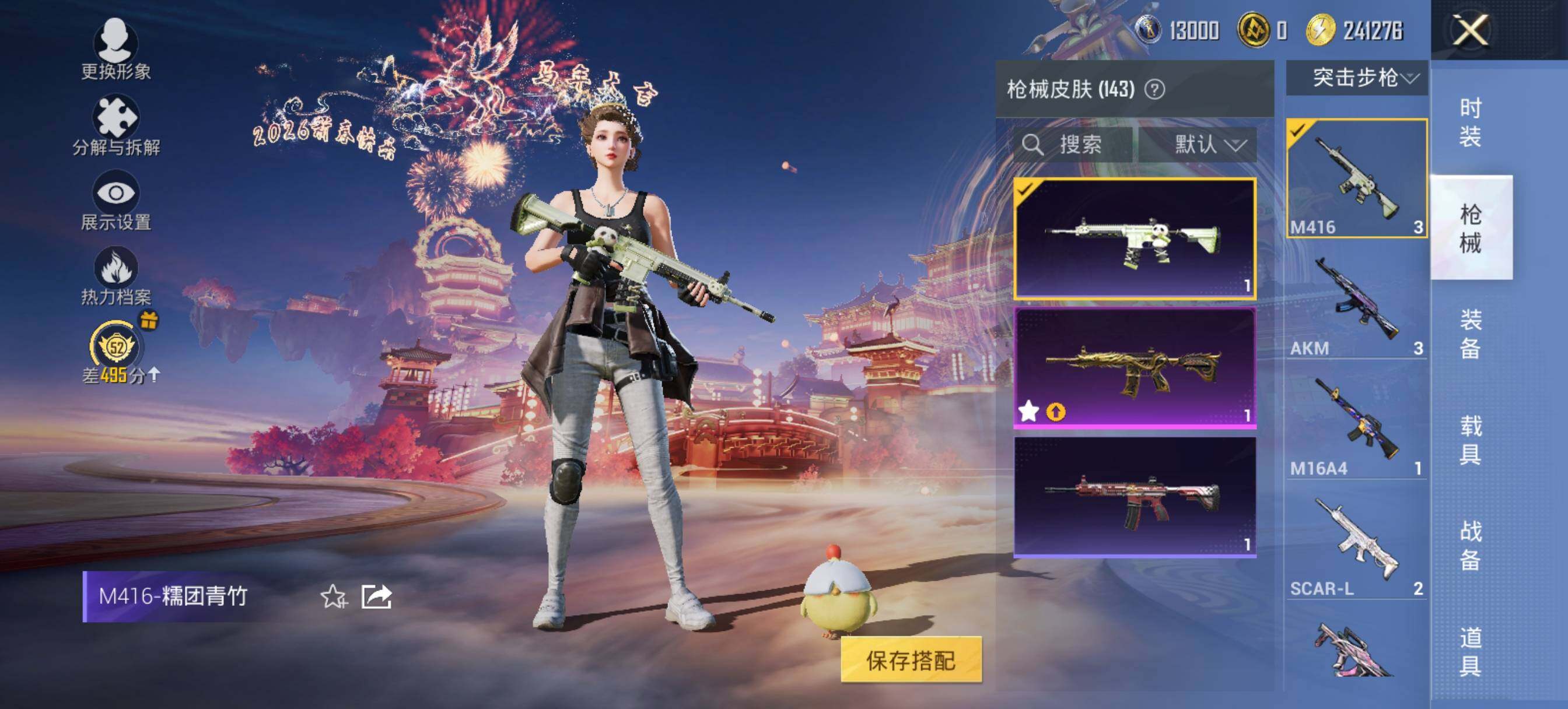 【粉色枪皮等级】:SCAR-L-纯梦嫁纱(五级),M416-五爪金龙(六级),GROZA-镜光银凌(五