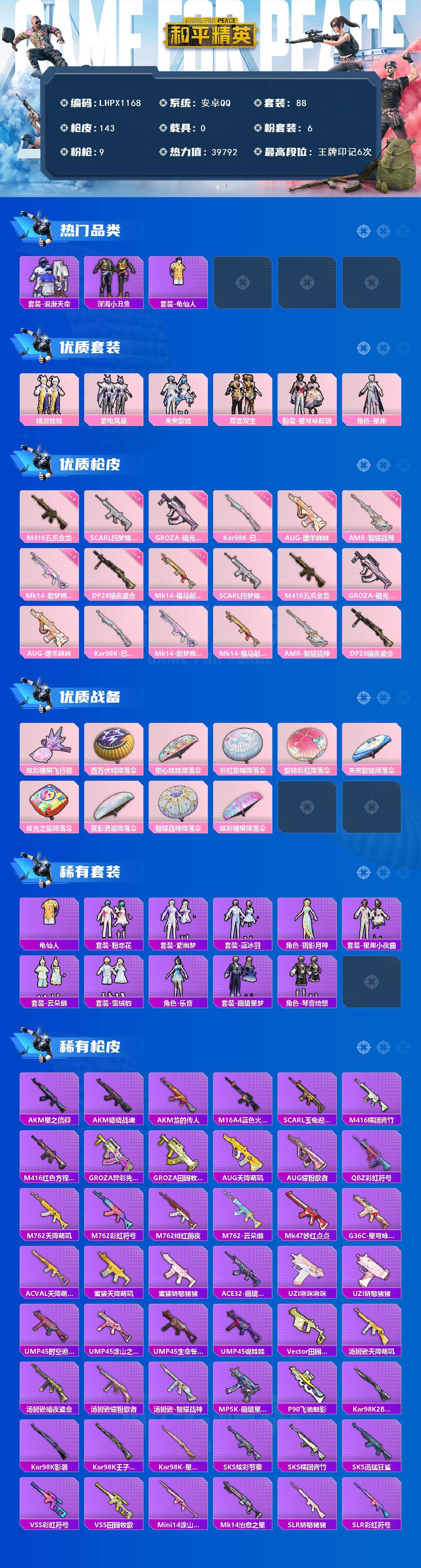 【特价出售/店主推荐】安卓 手Q-6粉装-9特效枪-0载具-1粉色飞行器-39792热力值-6王牌印记-88套装-143枪皮
