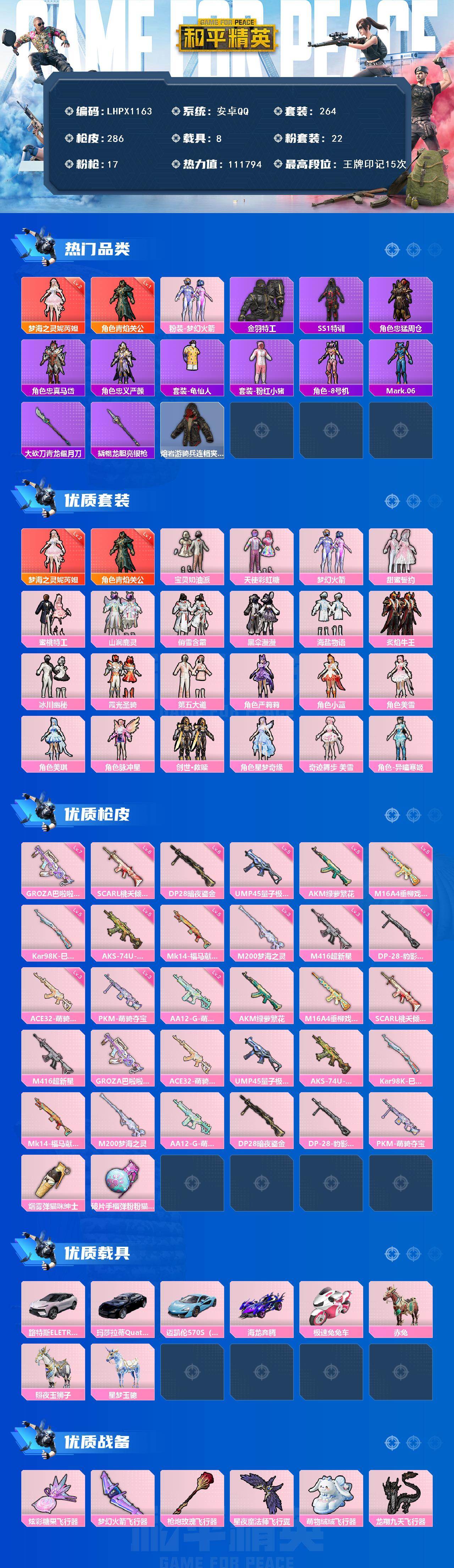 【特价出售/店主推荐】连体王者安卓Q-V10-484皮肤-5典藏皮肤-1典藏英雄-4无双-6珍品传说-67传说安卓 手Q-2神装-22粉装-17特效枪-8载具-10粉色飞行器-111794热力值-15王牌印记-264套装-286枪皮
