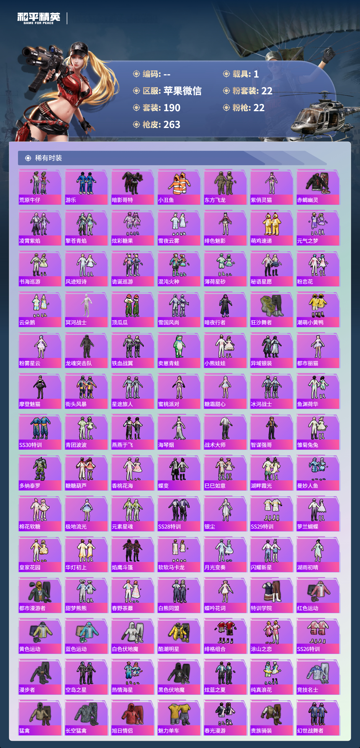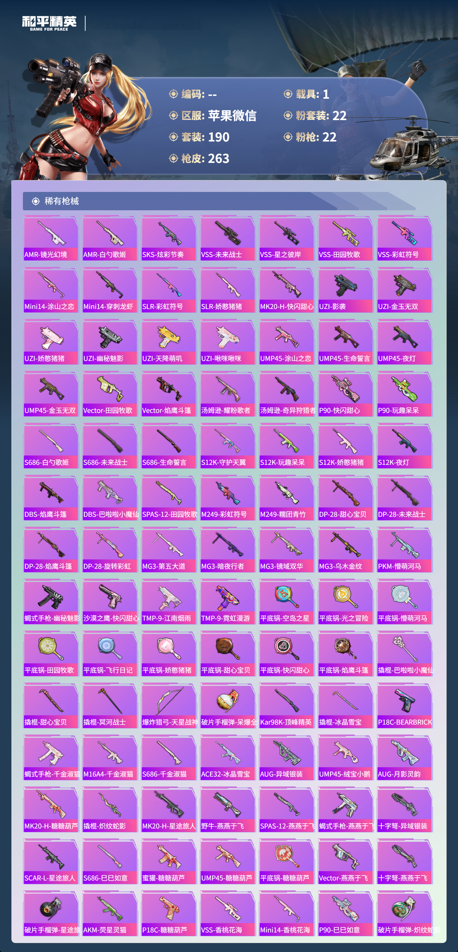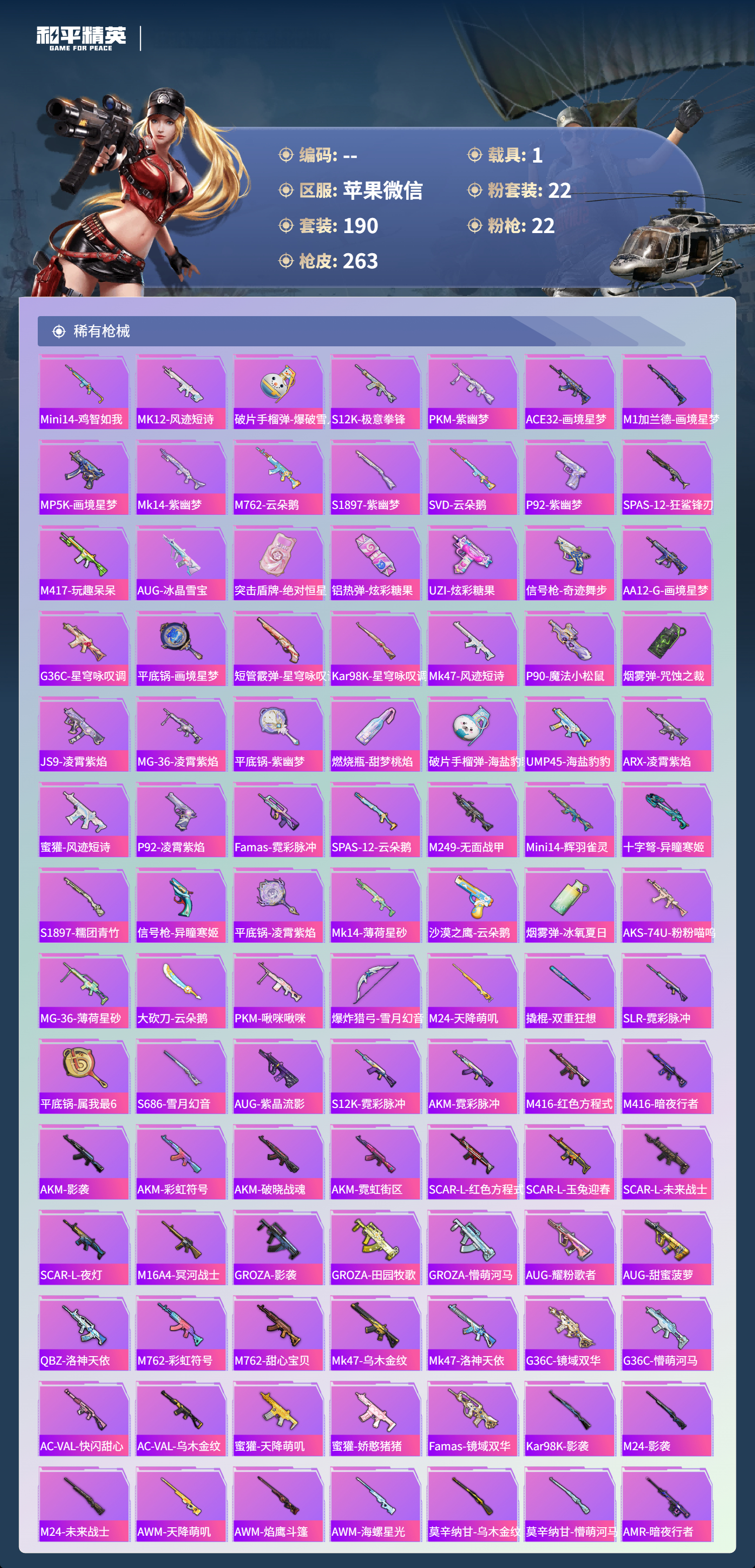 hs61036苹果微信-13王牌印记-有战神框-1红装-22粉装-22特效枪-1载具-92546热力值-190套装-263枪皮-3卓越印记-2传奇印记
