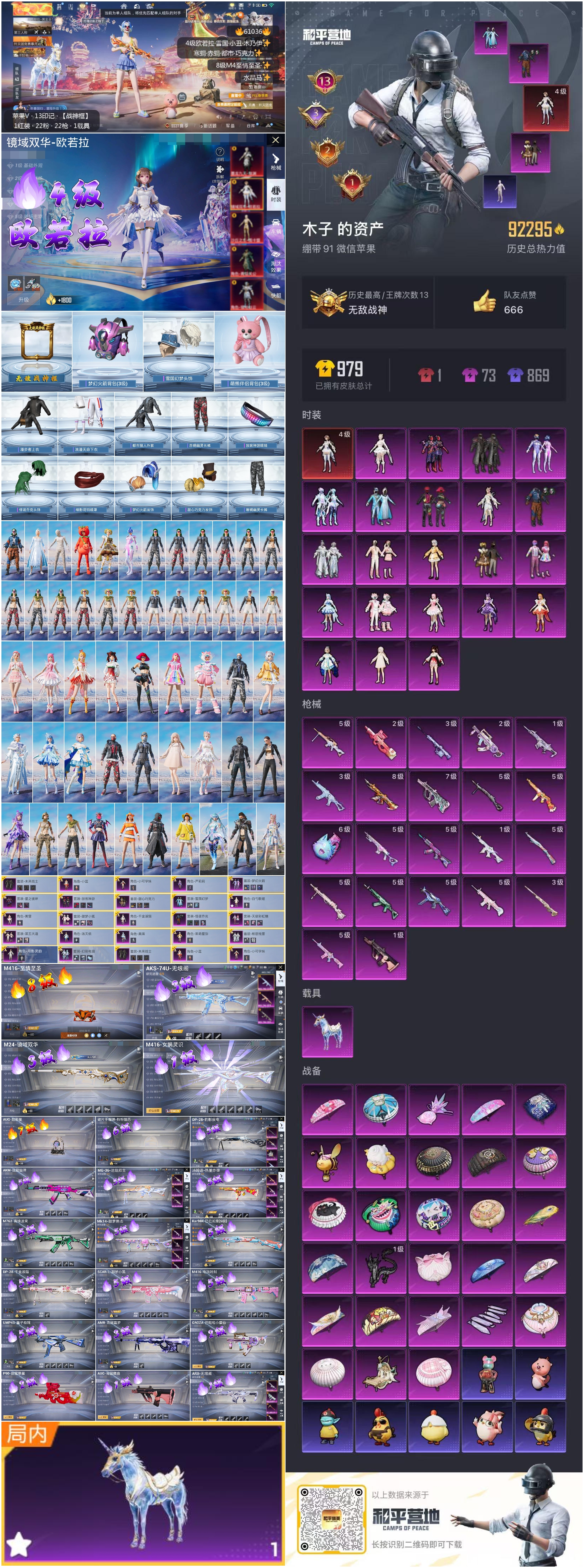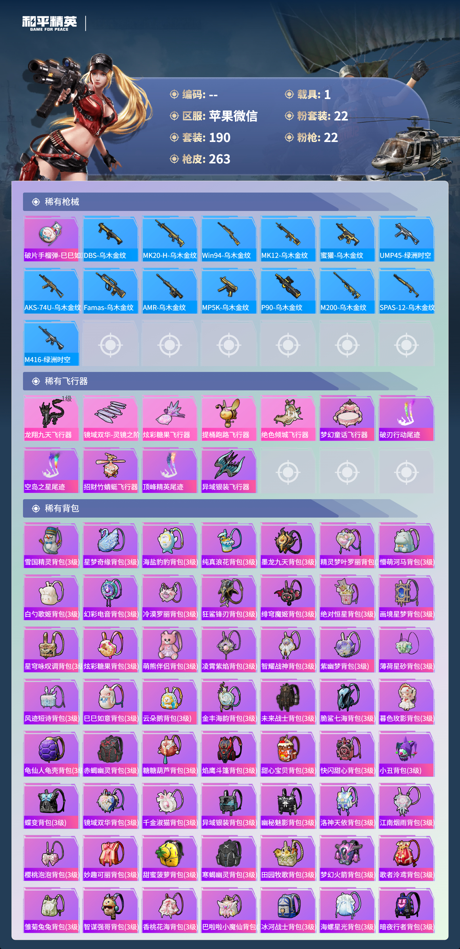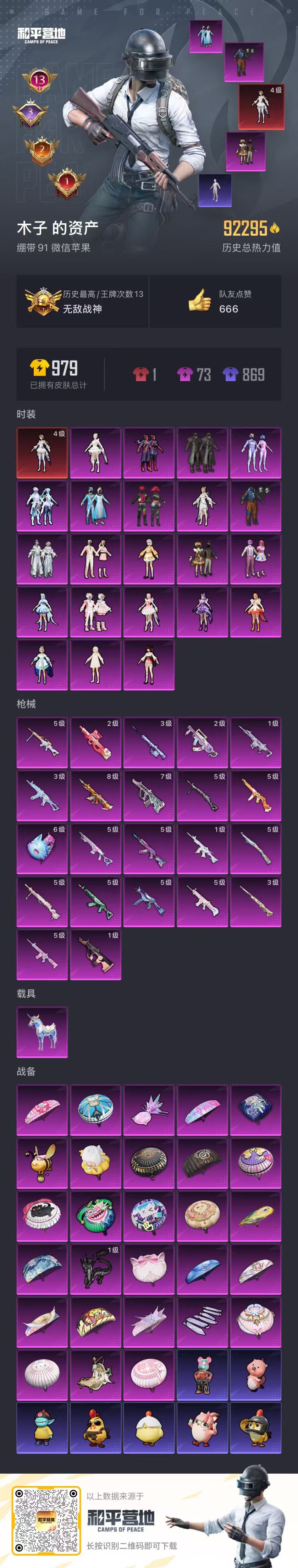 hs61036苹果微信-13王牌印记-有战神框-1红装-22粉装-22特效枪-1载具-92546热力值-190套装-263枪皮-3卓越印记-2传奇印记