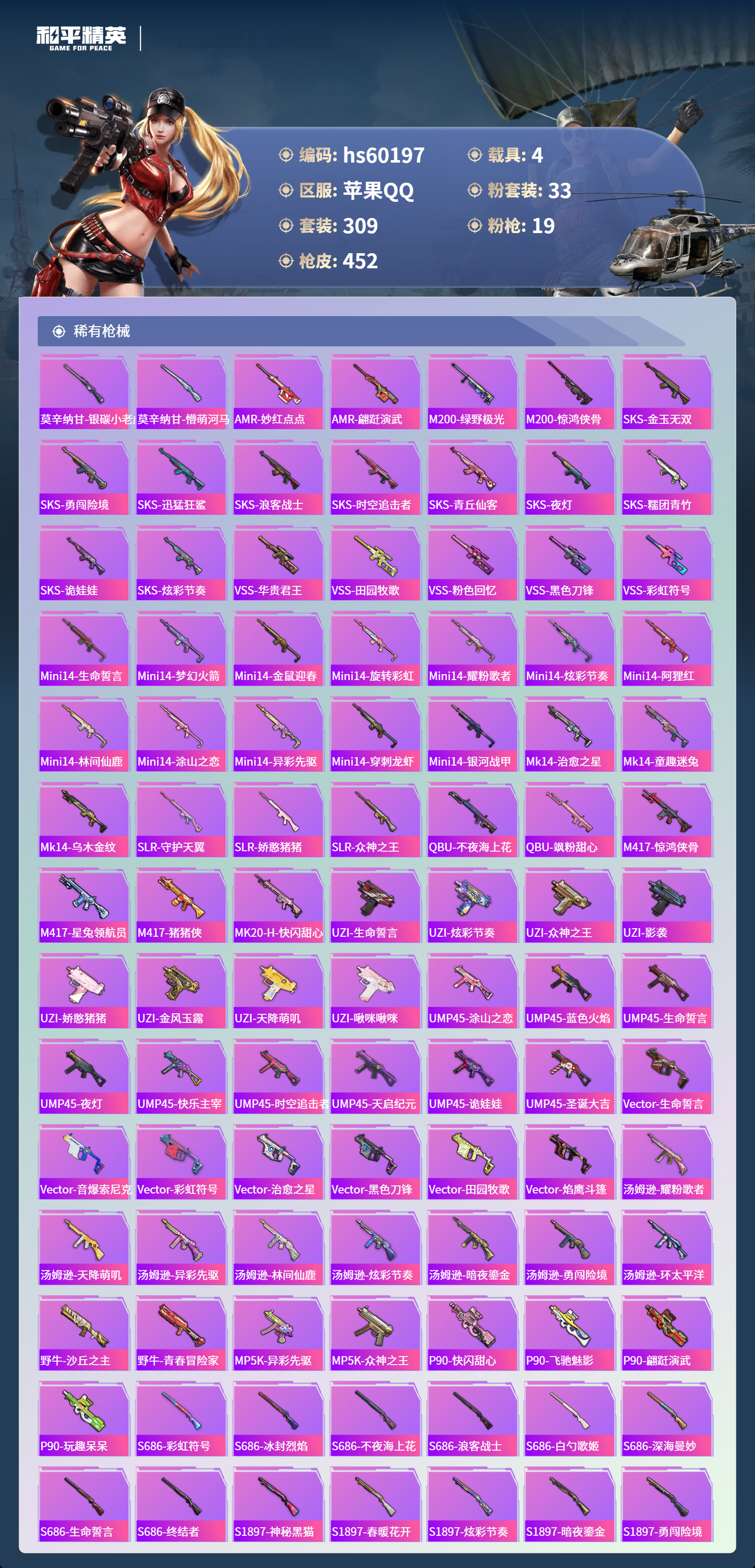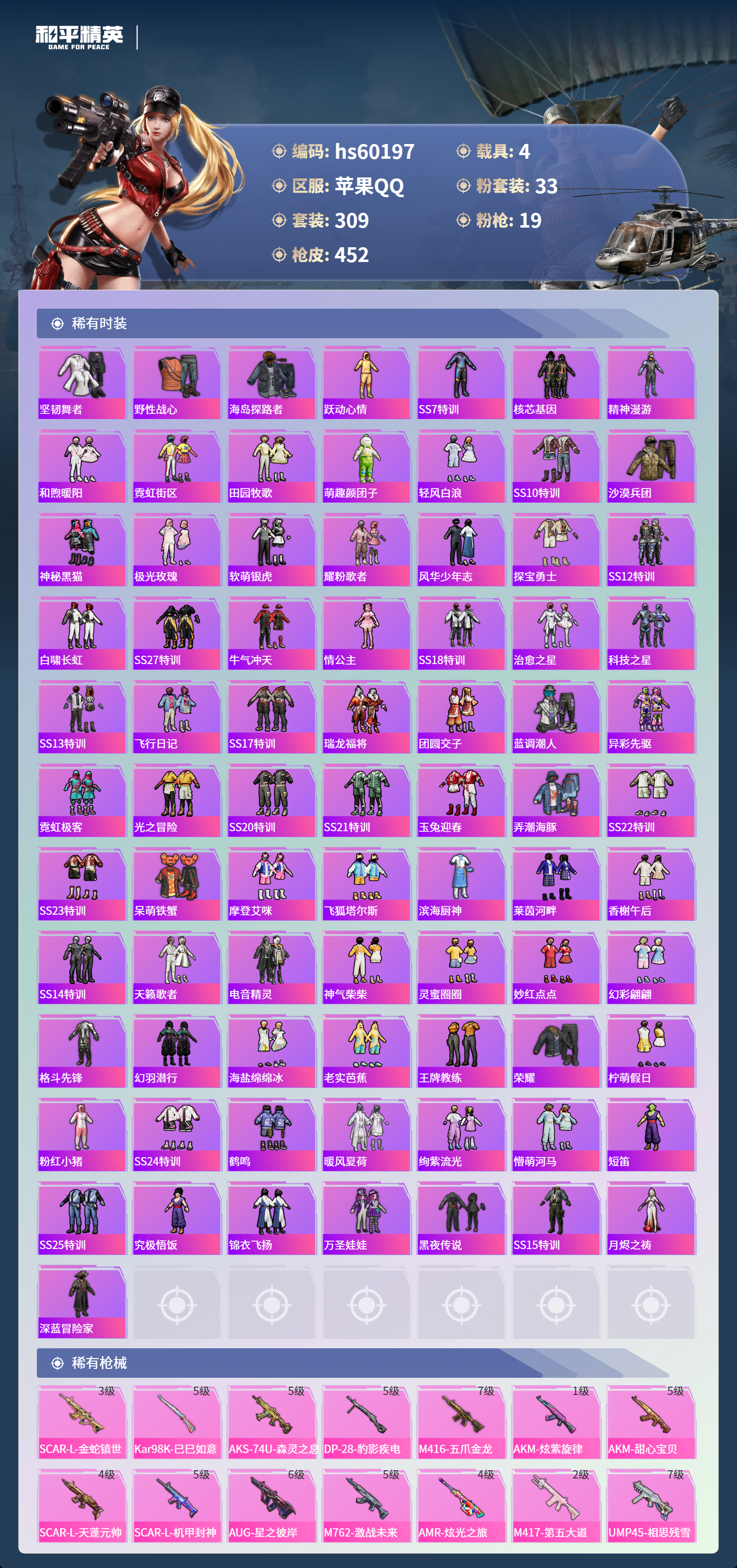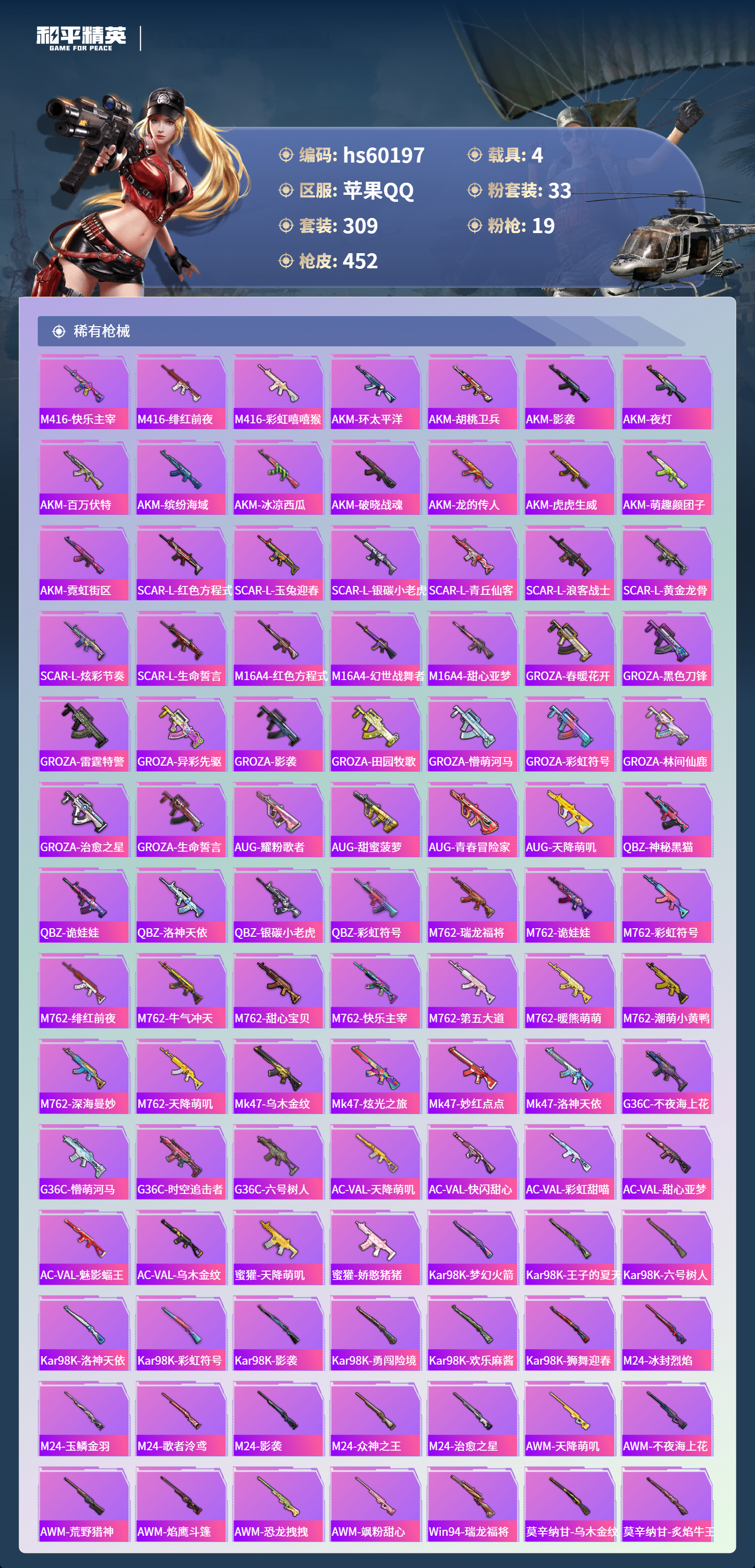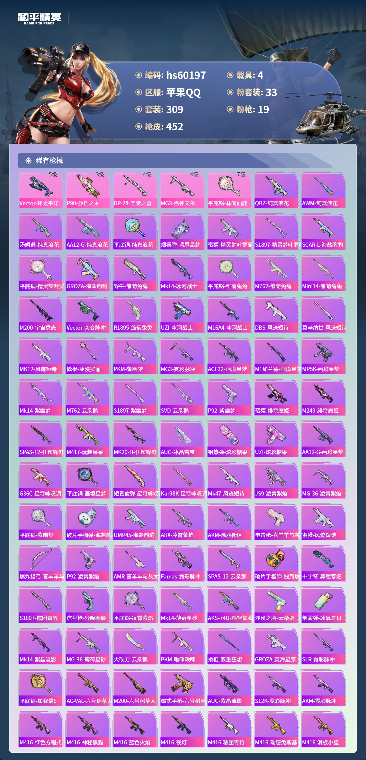 hs60197 苹果手Q-23王牌印记-1红装-33粉装-19特效枪-4载具-热力值-309套装-452枪皮-7卓越印记-4传奇印记