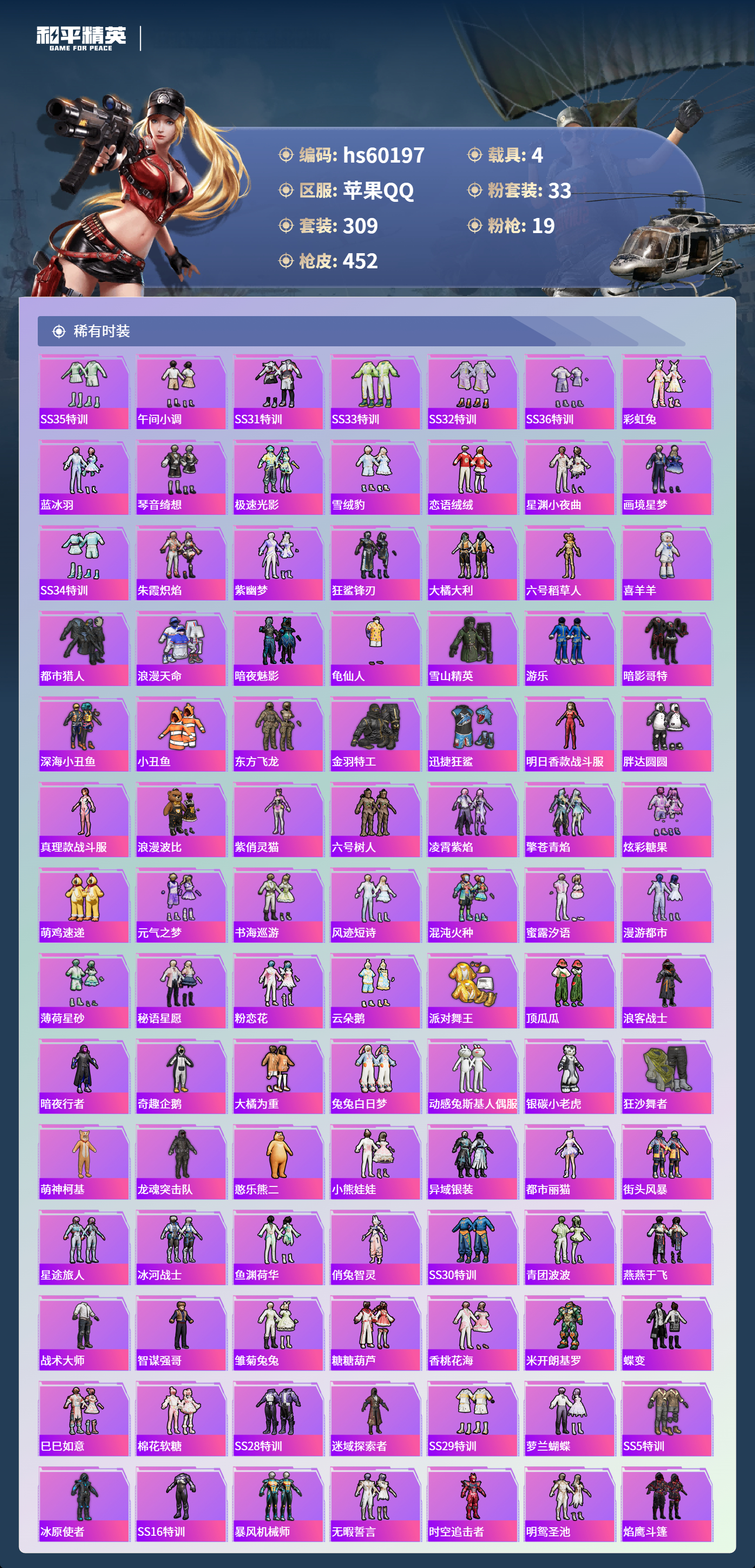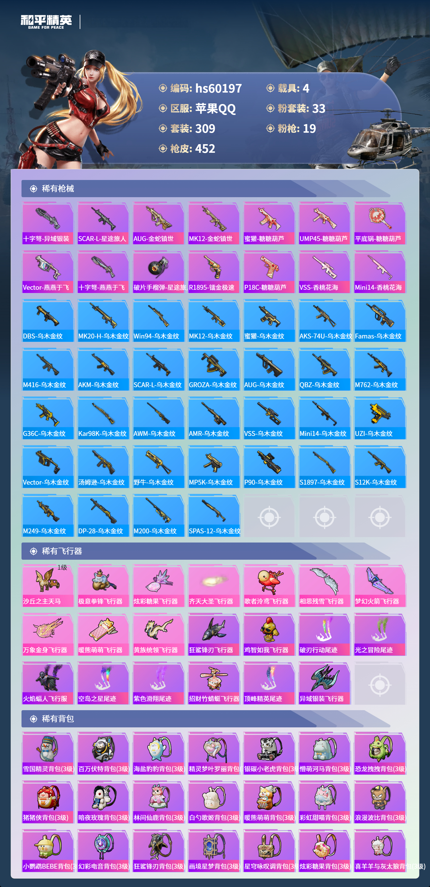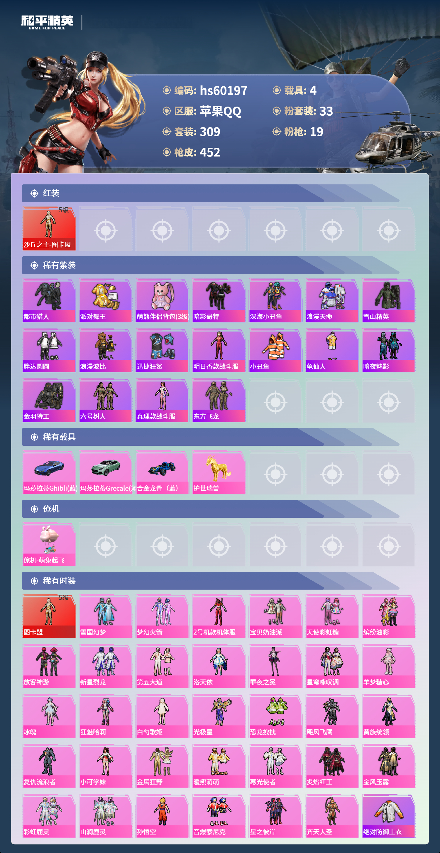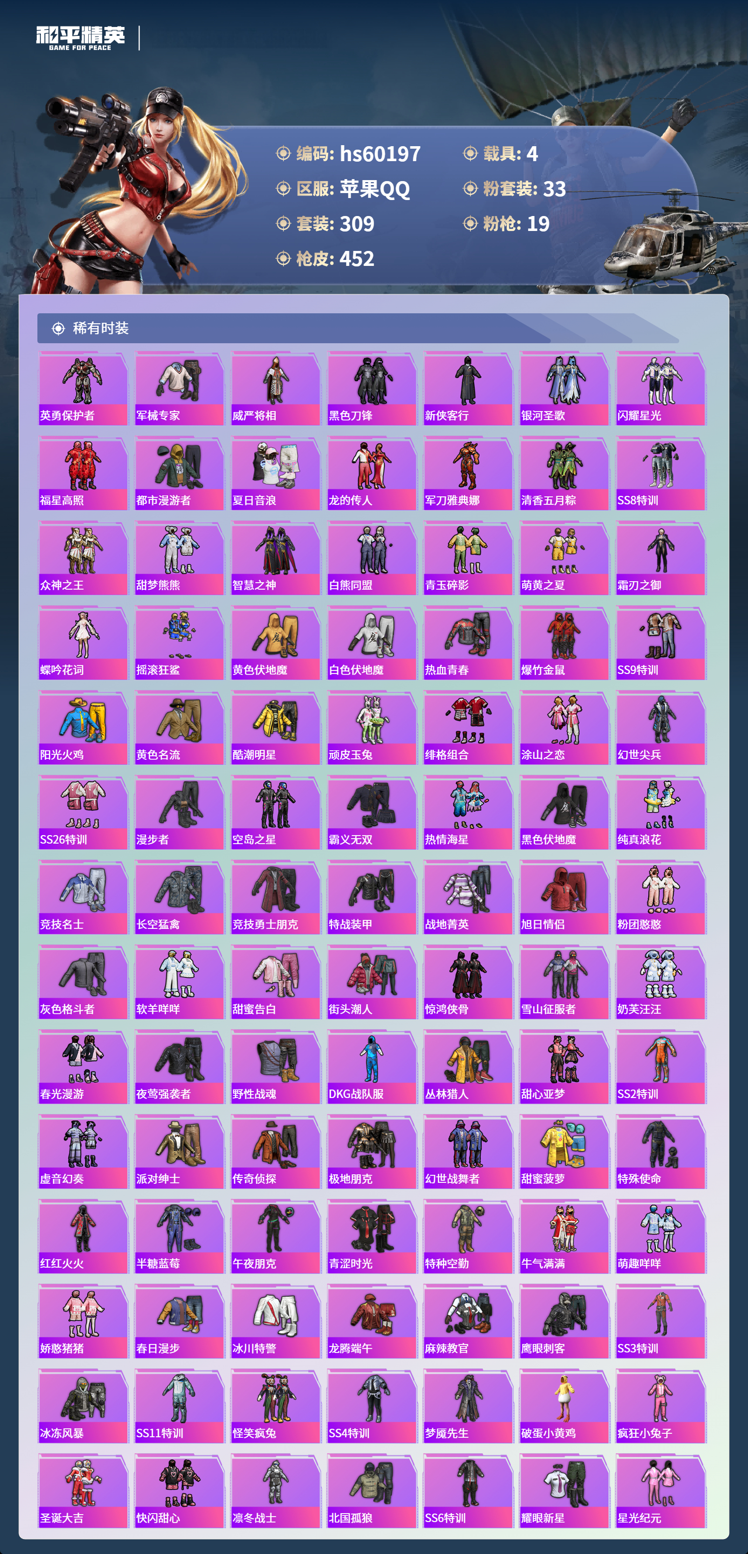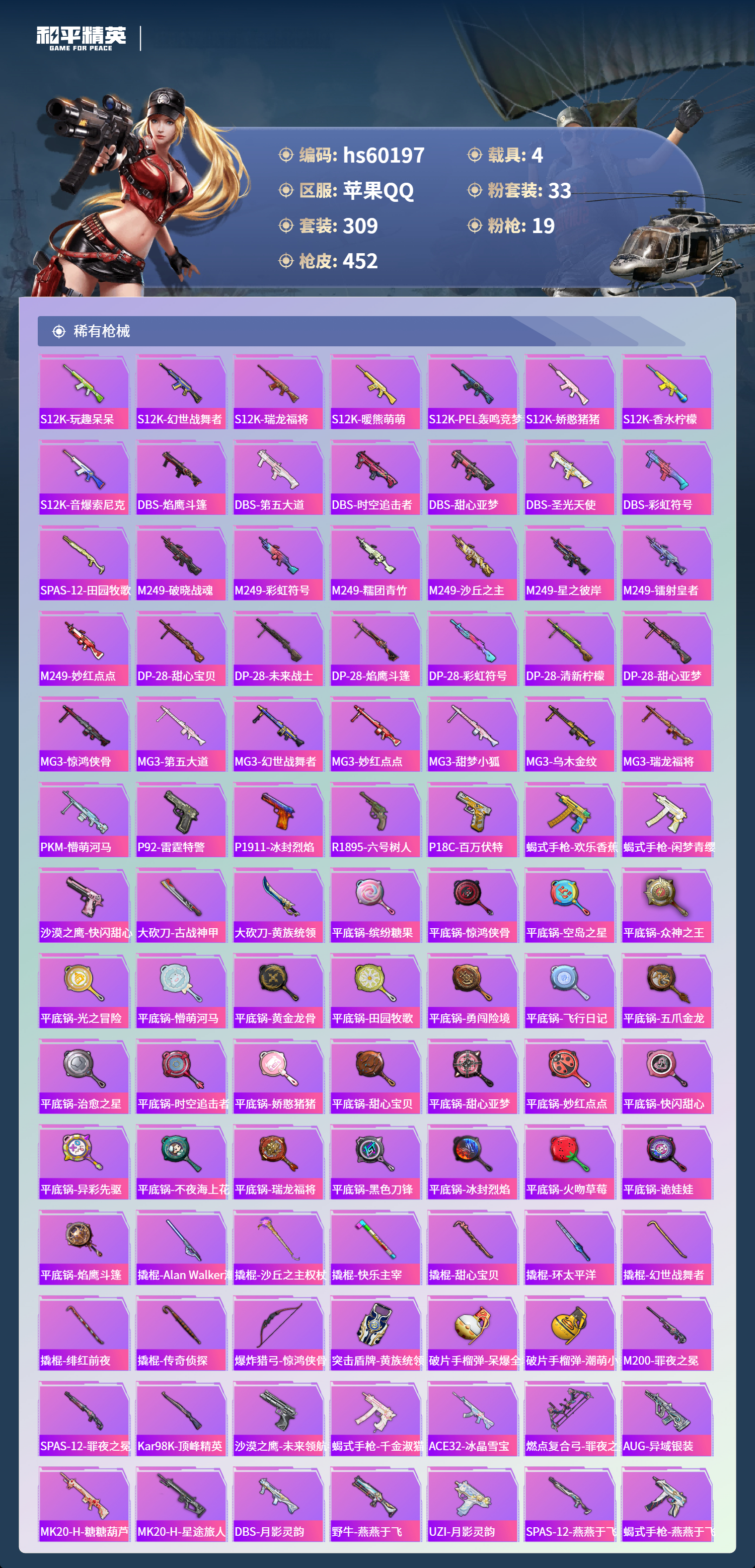 hs60197 苹果手Q-23王牌印记-1红装-33粉装-19特效枪-4载具-热力值-309套装-452枪皮-7卓越印记-4传奇印记