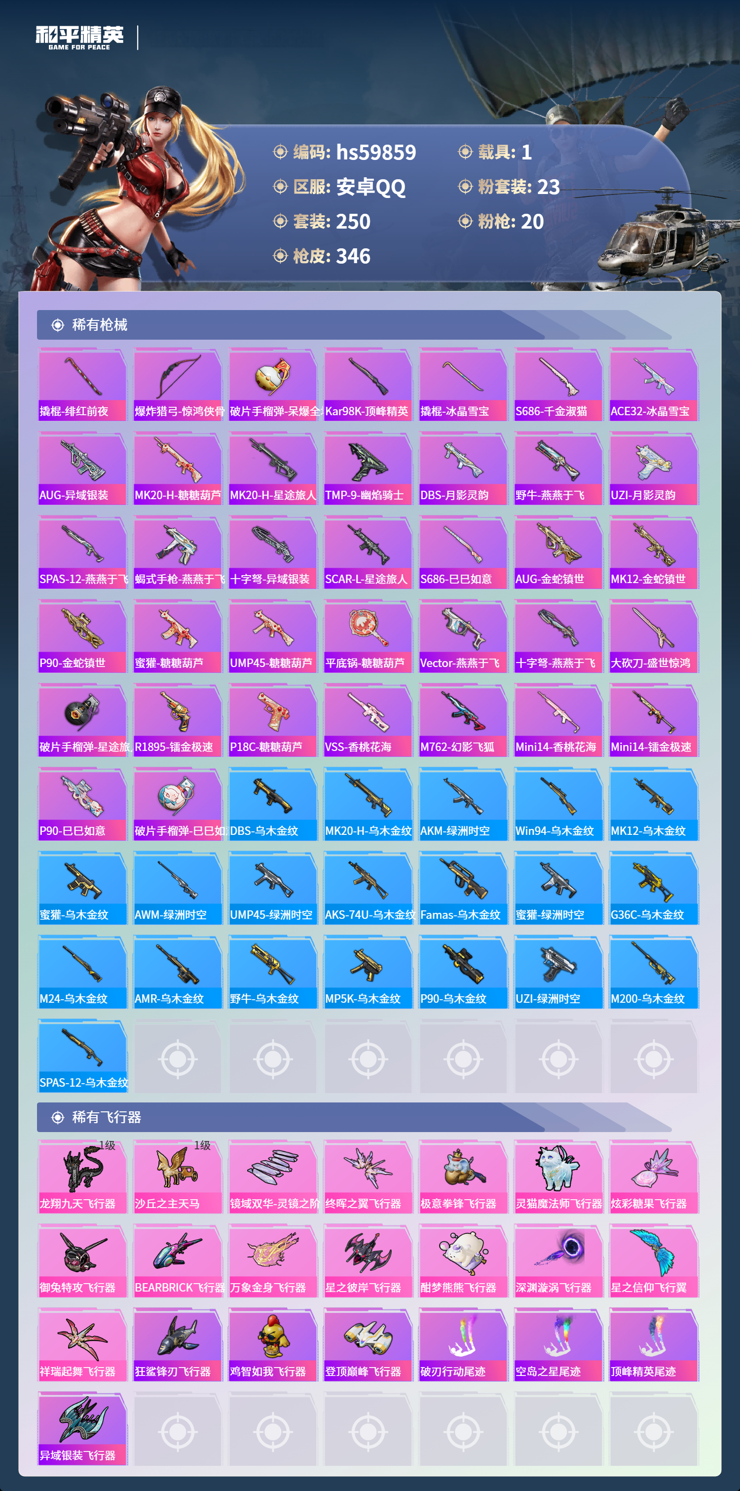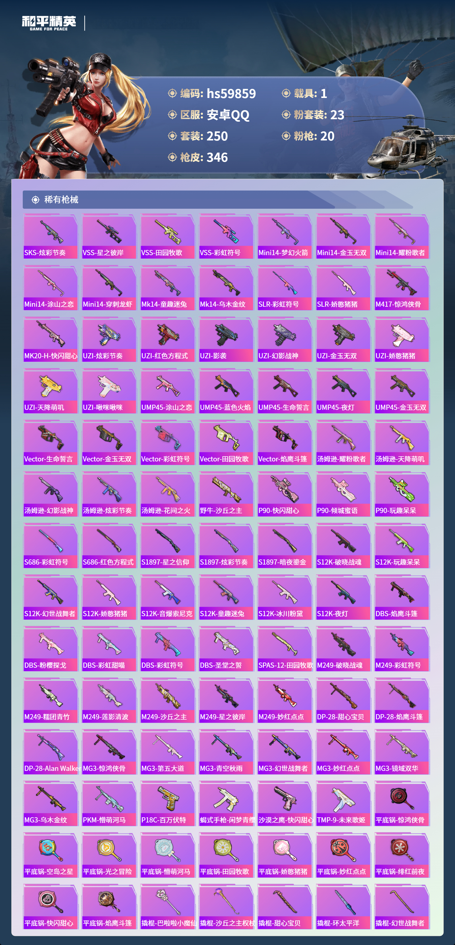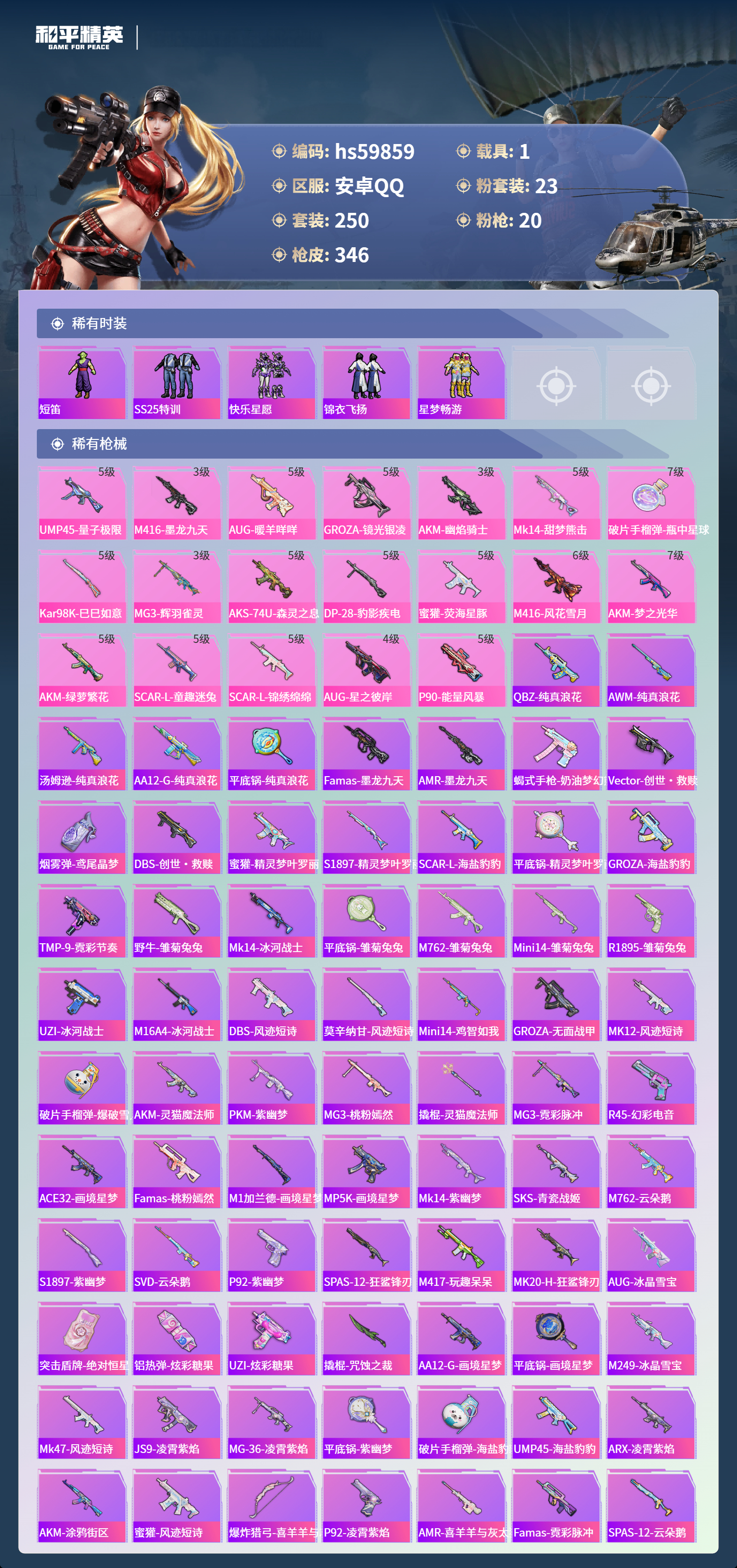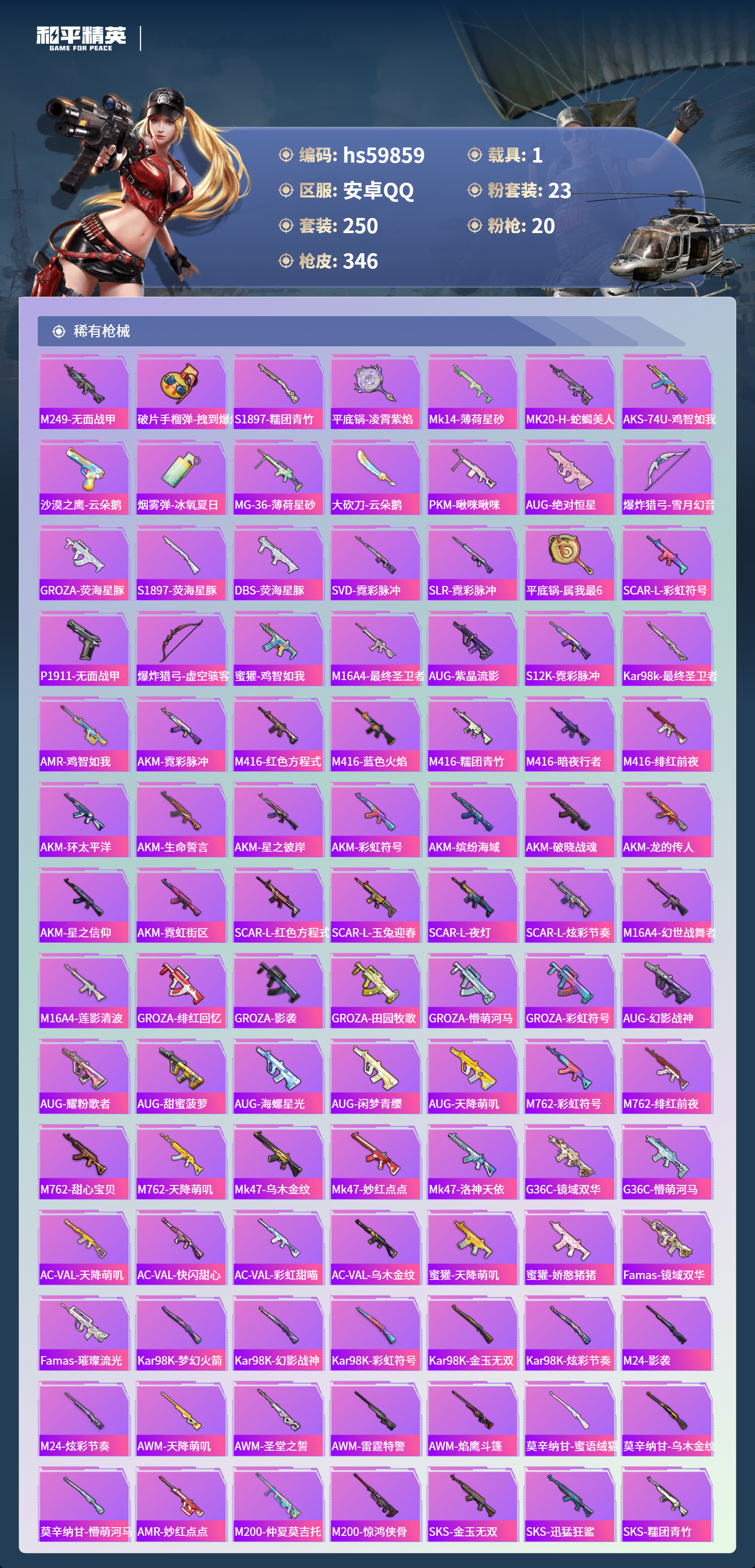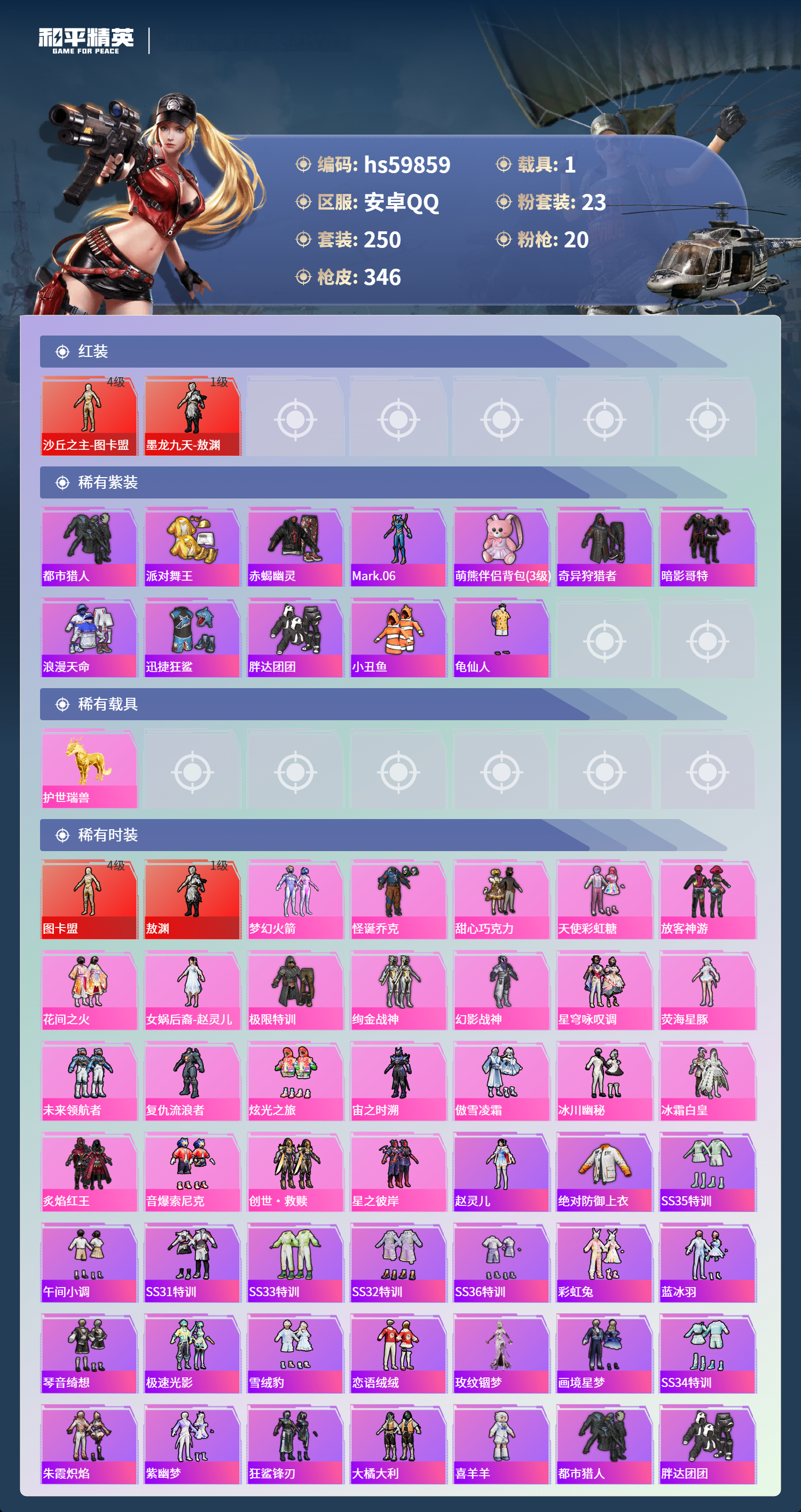 hs59859 安卓手Q-17王牌印记-2红装-23粉装-20特效枪-1载具-热力值-250套装-346枪皮-6卓越印记-3传奇印记