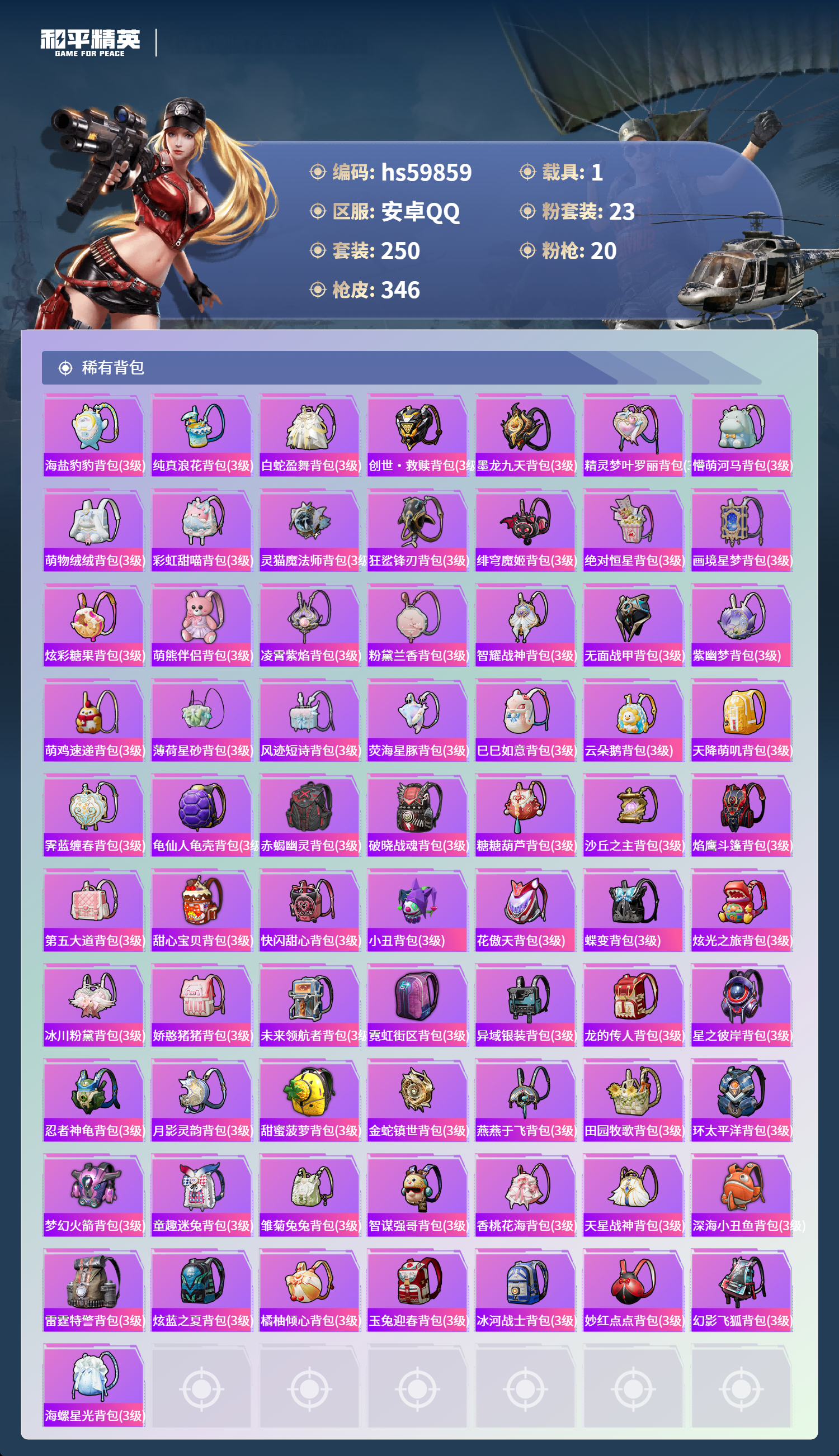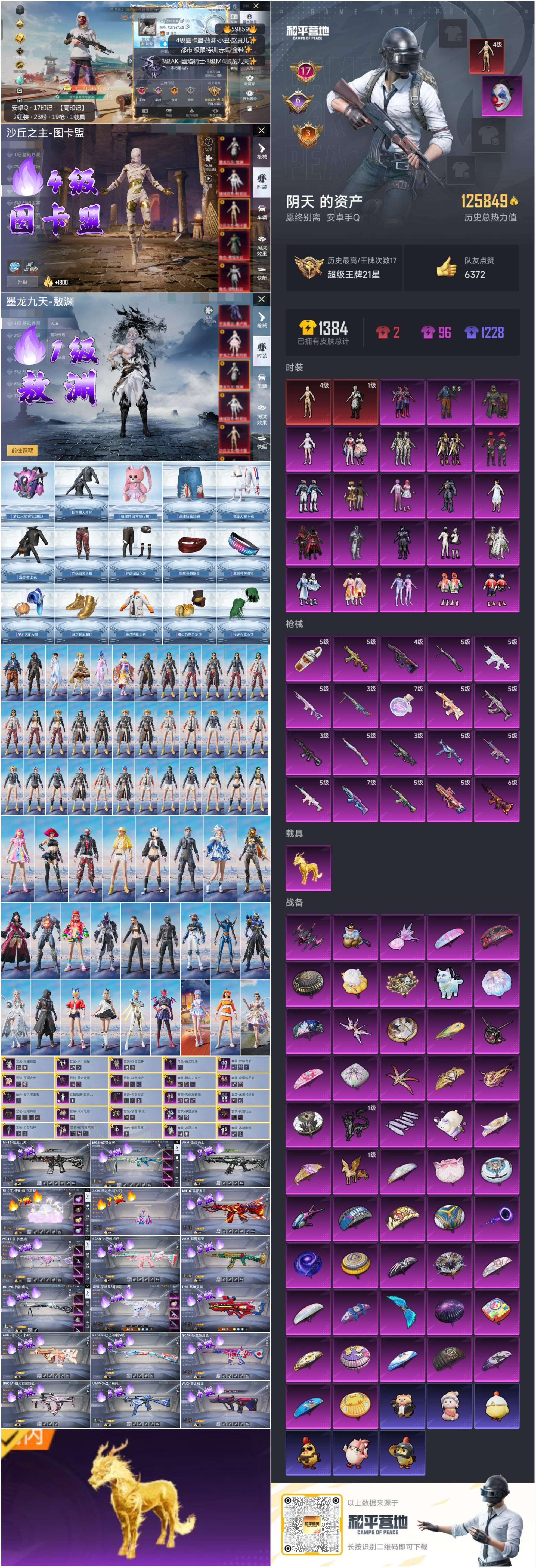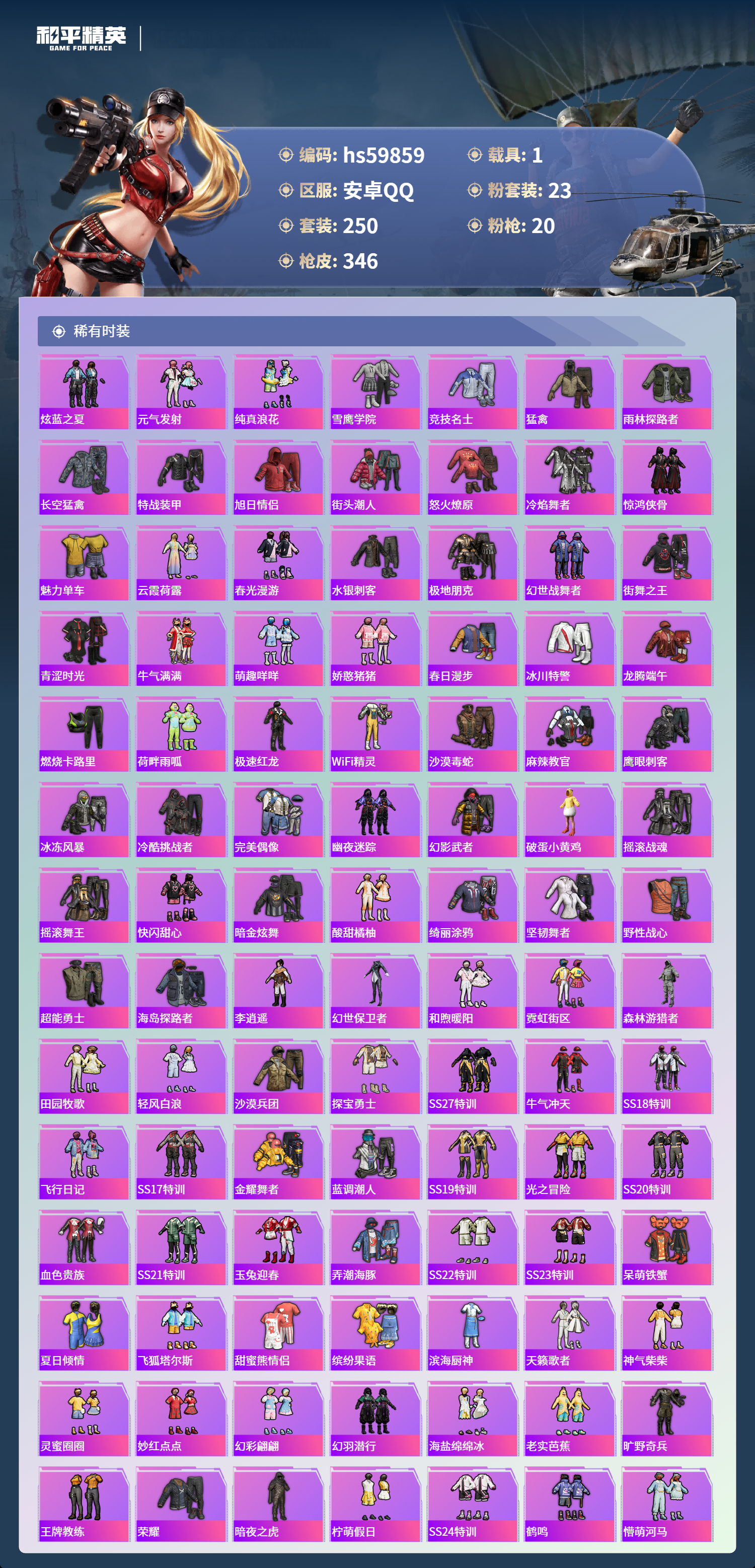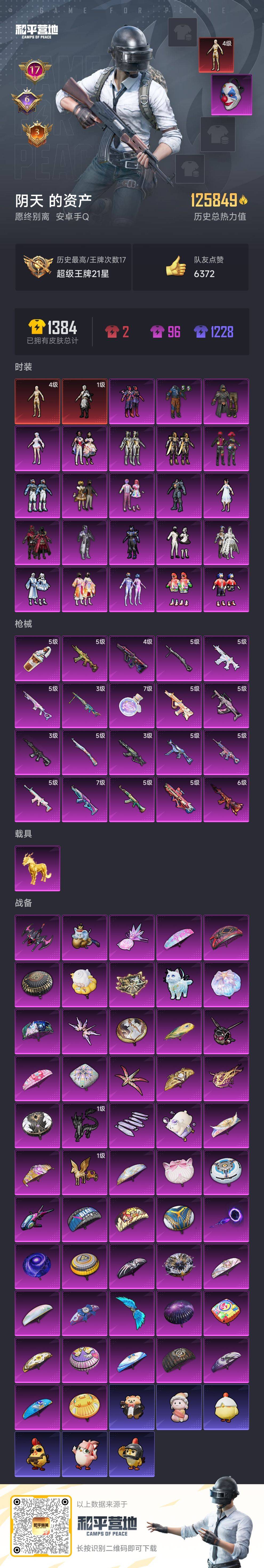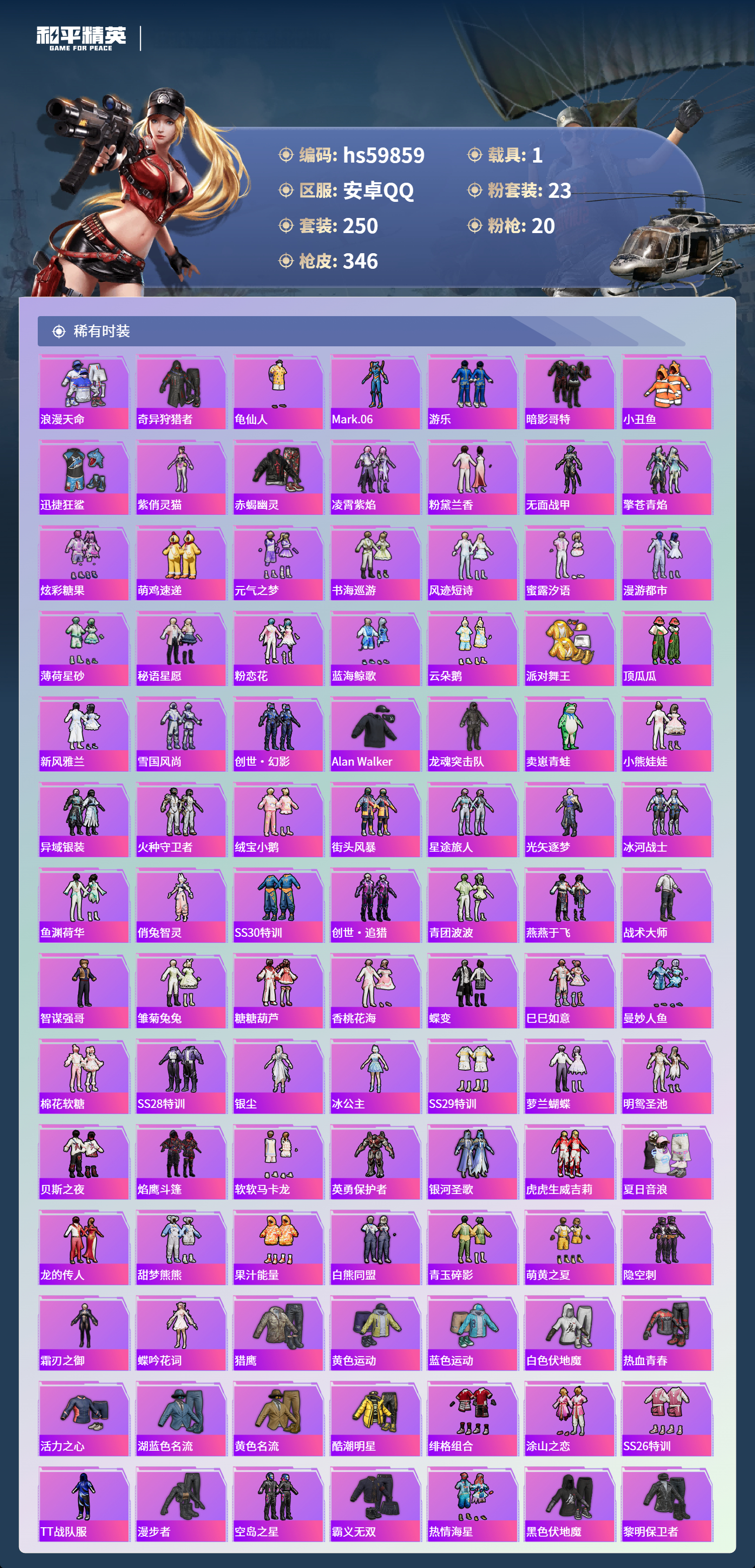 hs59859 安卓手Q-17王牌印记-2红装-23粉装-20特效枪-1载具-热力值-250套装-346枪皮-6卓越印记-3传奇印记