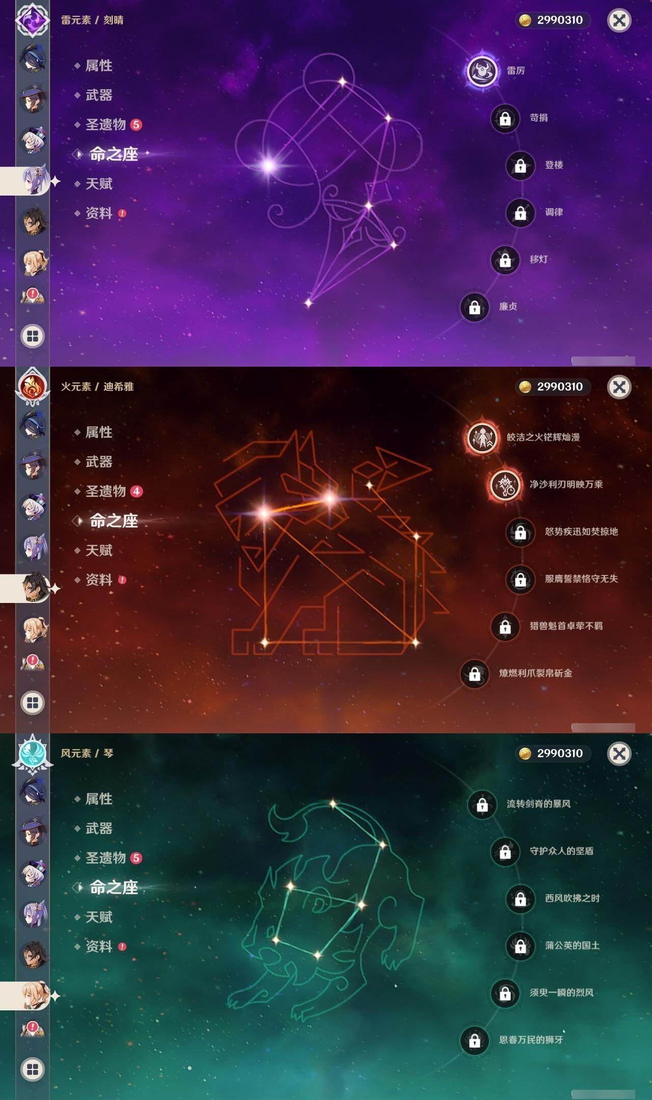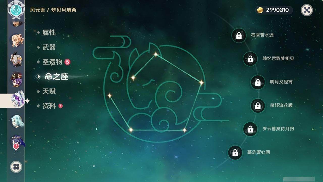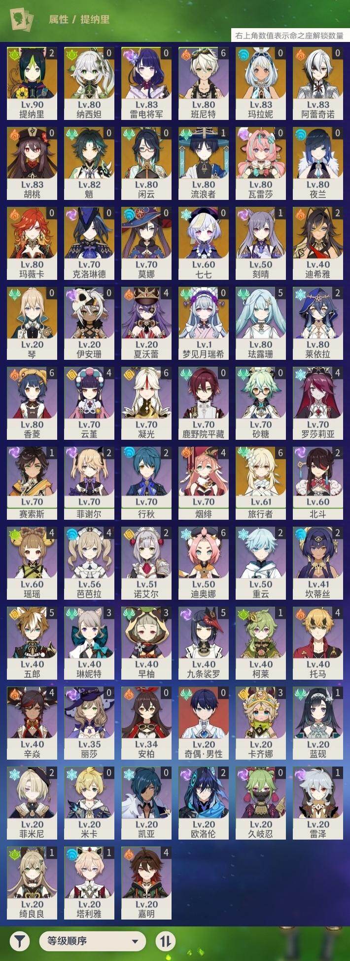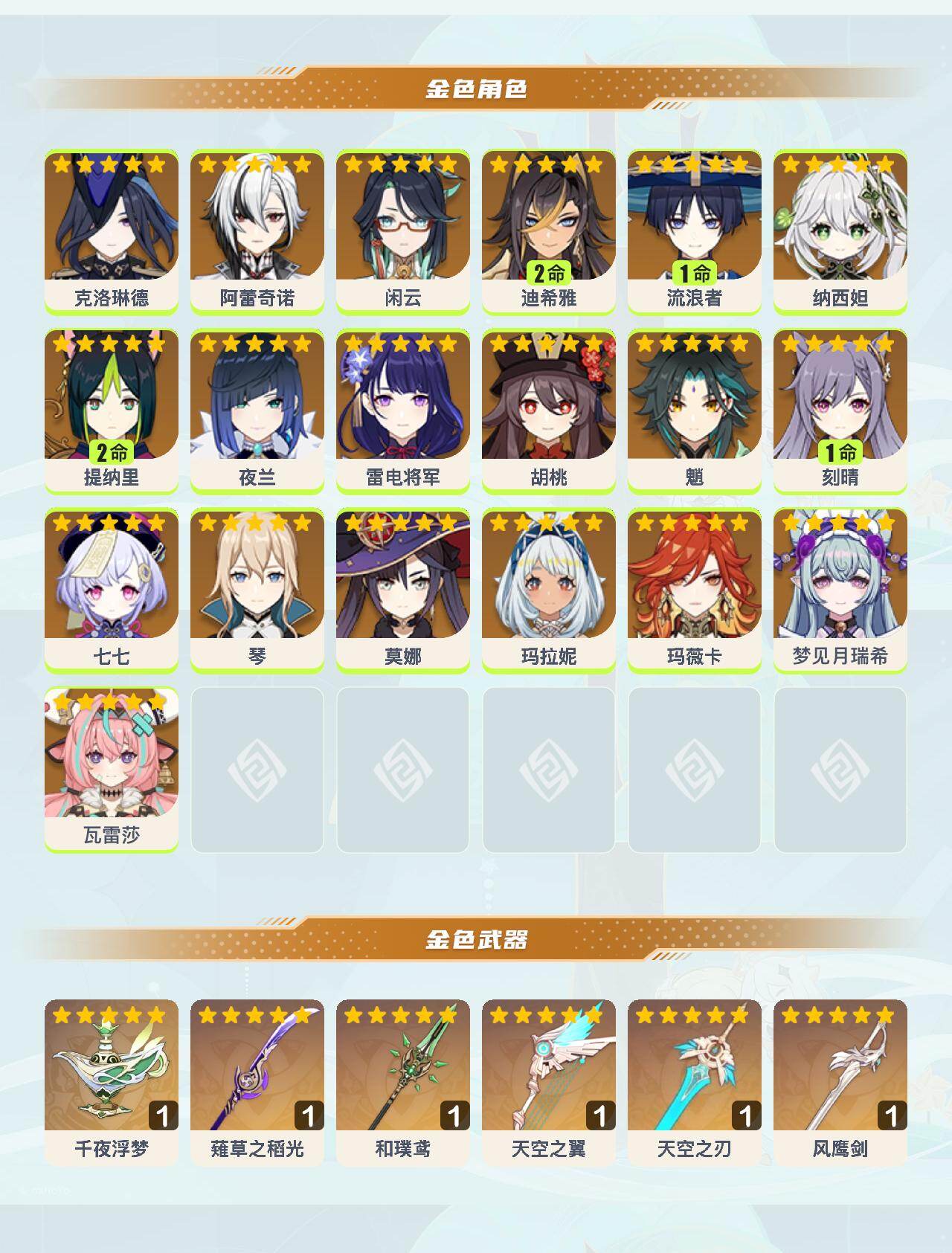 0命克洛琳德,0命阿蕾奇诺,0命闲云,2命迪希雅,1命流浪者,0命纳西妲,2命提纳里,0命夜兰,0命雷电将军,0命胡桃,0命魈,1命刻晴,0命七七,0命琴,0命莫娜,0命玛拉妮,0命玛薇卡,0命梦见月瑞希,0命瓦雷莎,精1千夜浮梦,精1薙草之稻光,精1和璞鸢,精1天空之翼,精1天空之刃,精1风鹰剑