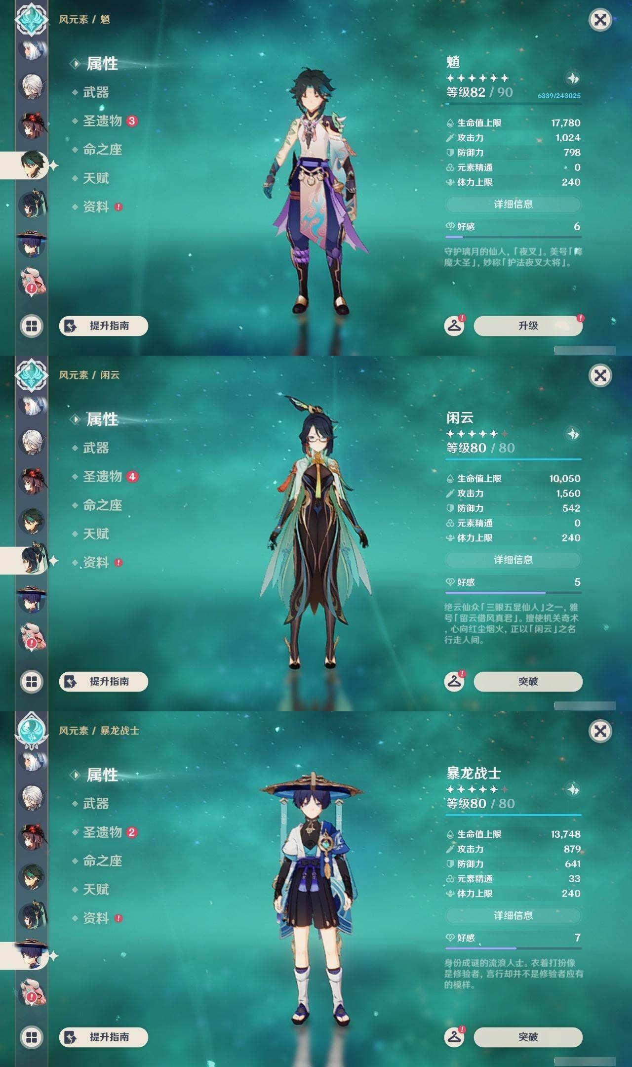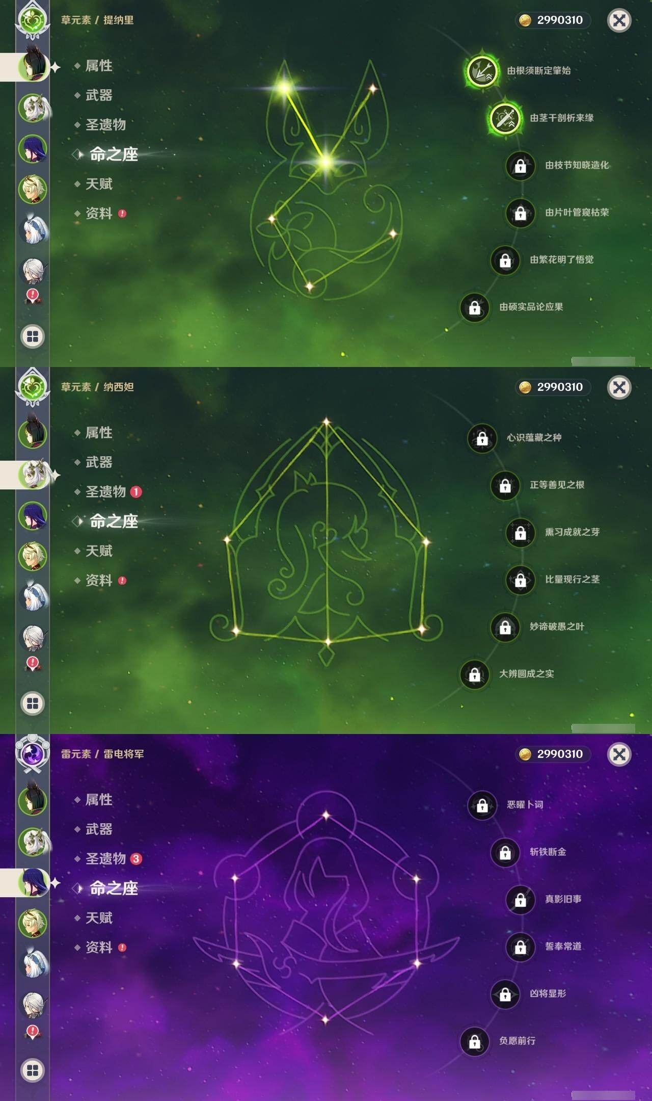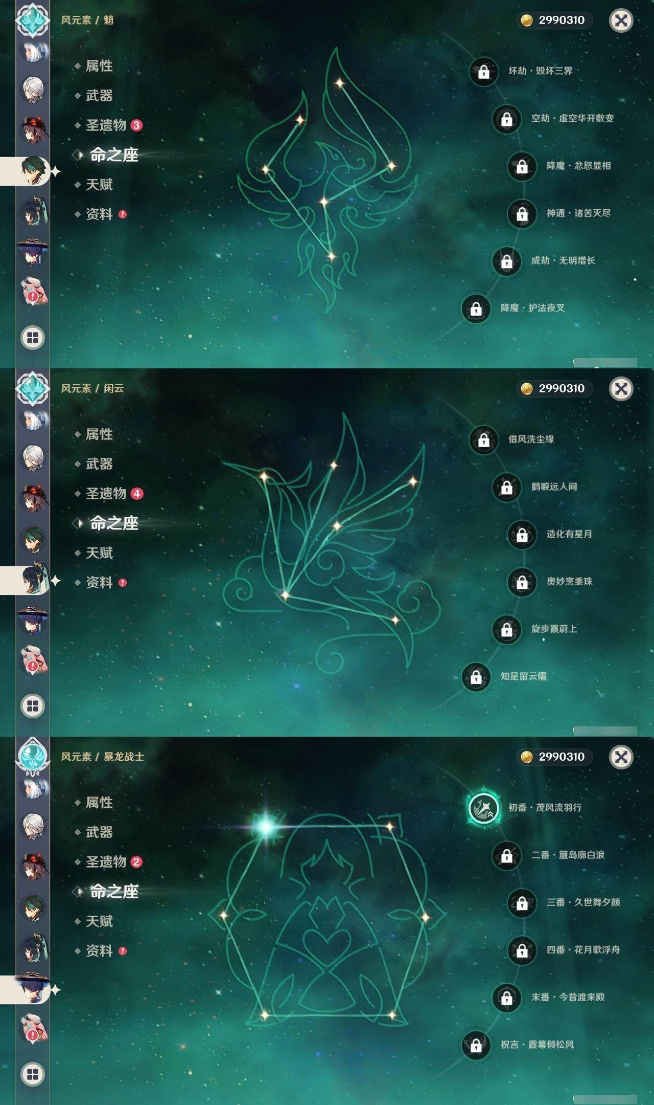 0命克洛琳德,0命阿蕾奇诺,0命闲云,2命迪希雅,1命流浪者,0命纳西妲,2命提纳里,0命夜兰,0命雷电将军,0命胡桃,0命魈,1命刻晴,0命七七,0命琴,0命莫娜,0命玛拉妮,0命玛薇卡,0命梦见月瑞希,0命瓦雷莎,精1千夜浮梦,精1薙草之稻光,精1和璞鸢,精1天空之翼,精1天空之刃,精1风鹰剑
