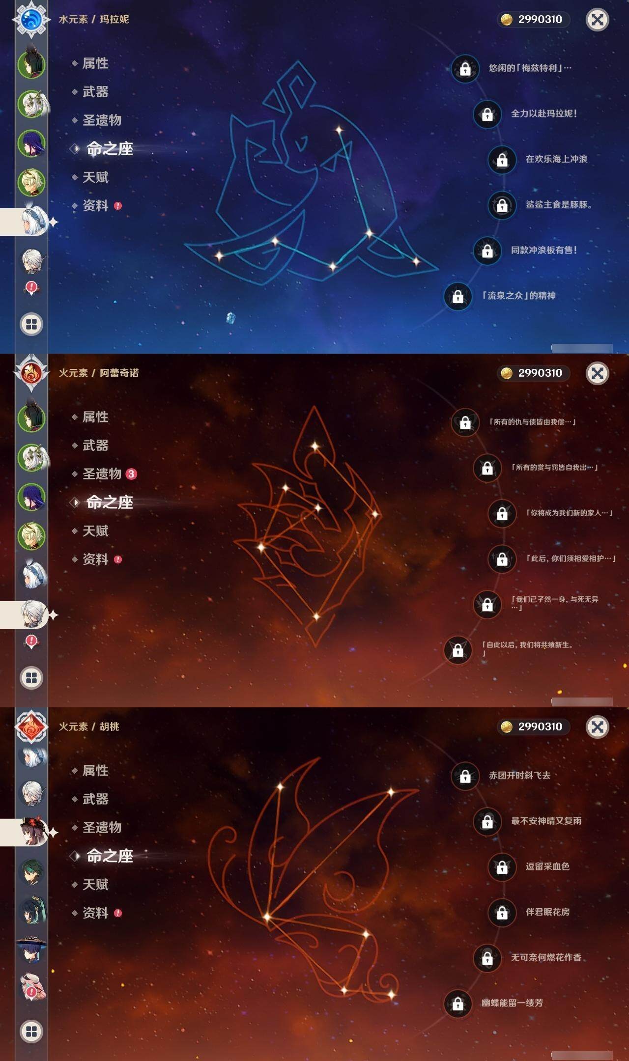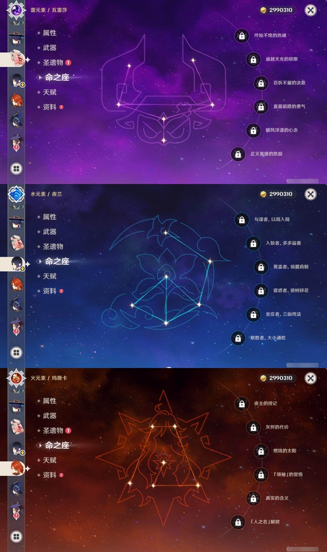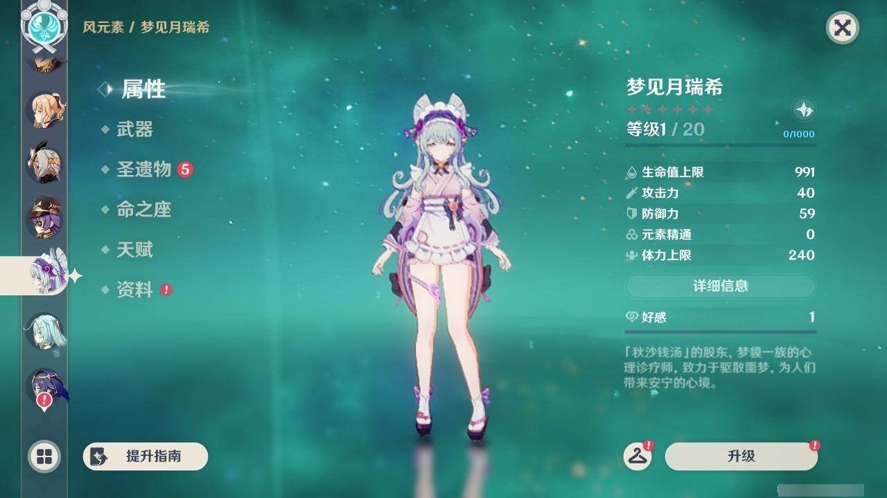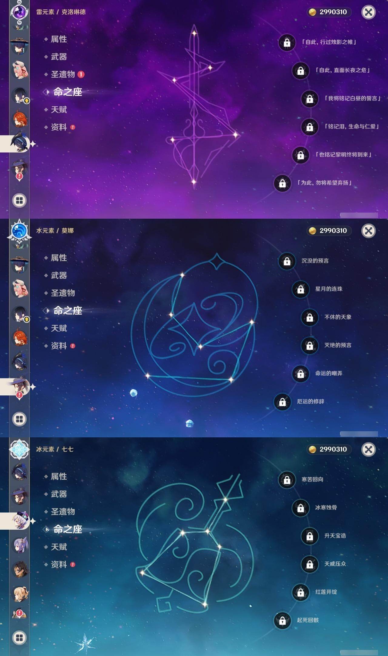 0命克洛琳德,0命阿蕾奇诺,0命闲云,2命迪希雅,1命流浪者,0命纳西妲,2命提纳里,0命夜兰,0命雷电将军,0命胡桃,0命魈,1命刻晴,0命七七,0命琴,0命莫娜,0命玛拉妮,0命玛薇卡,0命梦见月瑞希,0命瓦雷莎,精1千夜浮梦,精1薙草之稻光,精1和璞鸢,精1天空之翼,精1天空之刃,精1风鹰剑