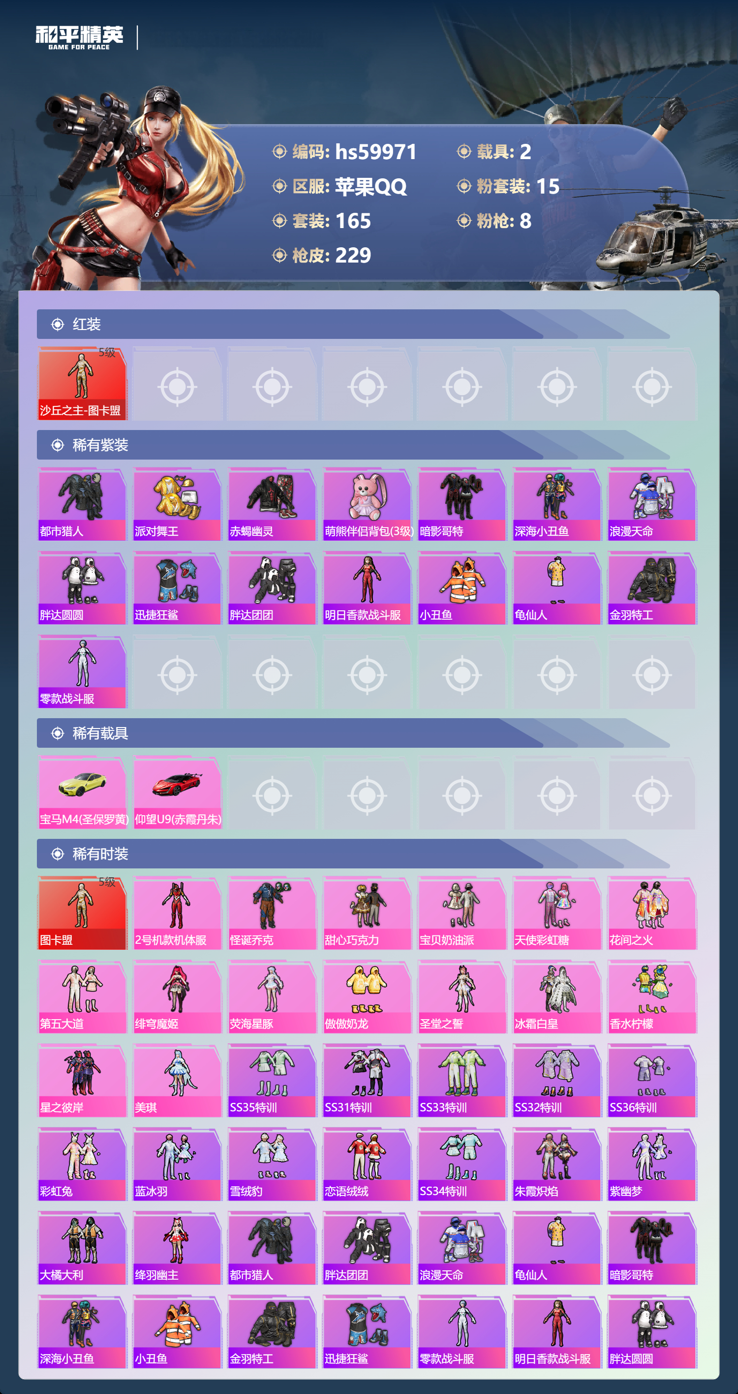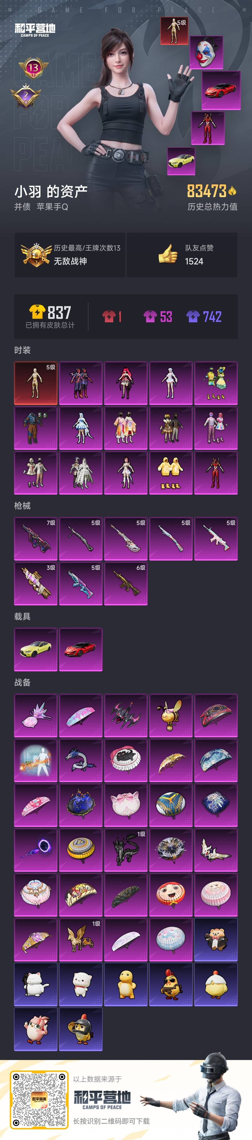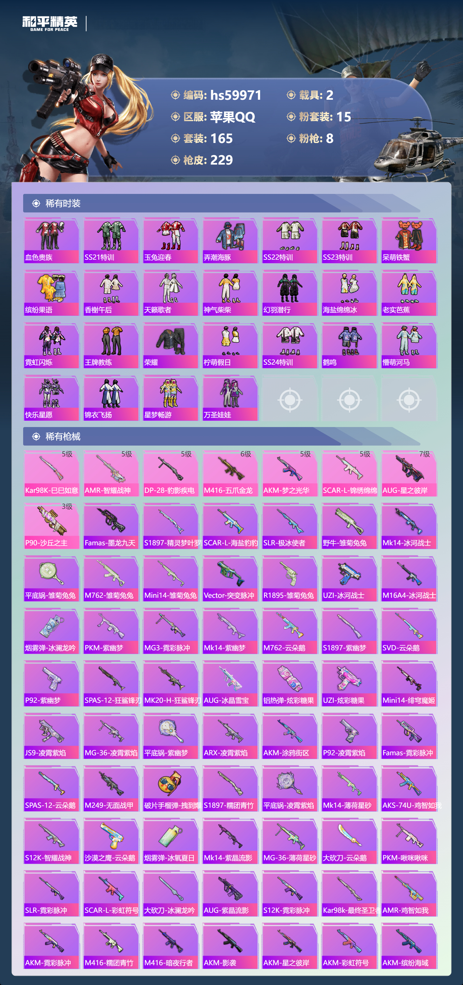 hs59971 苹果手Q-13王牌印记-有战神框-1红装-15粉装-8特效枪-2载具-84561热力值-165套装-229枪皮-2卓越印记