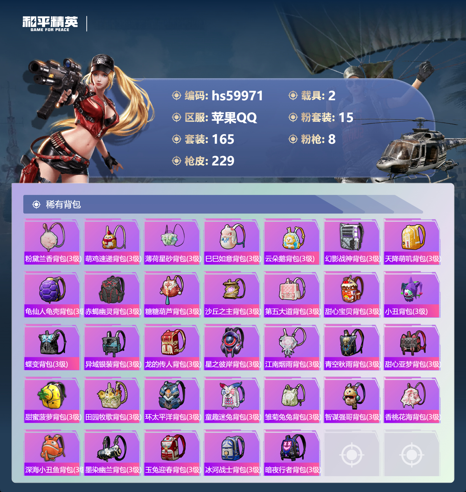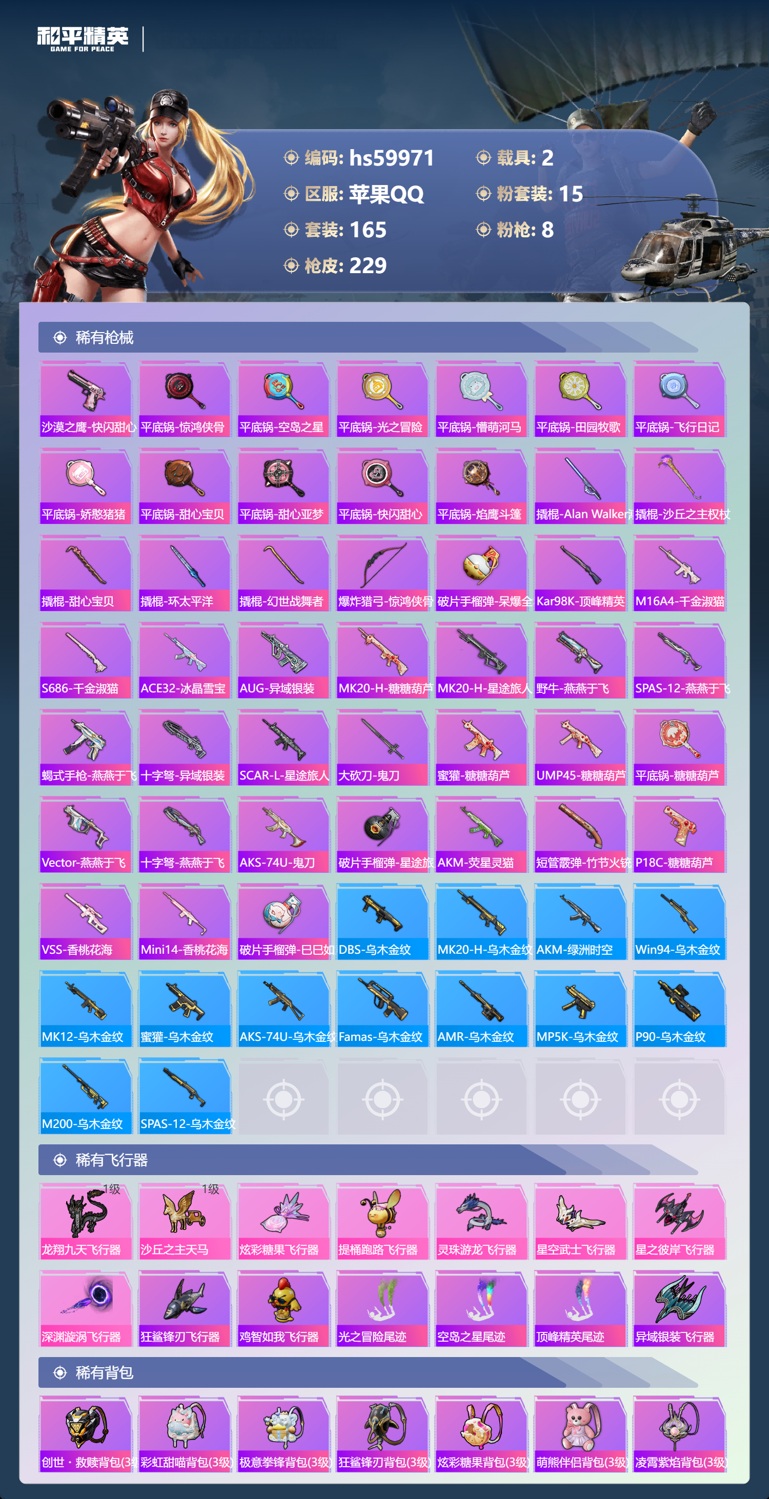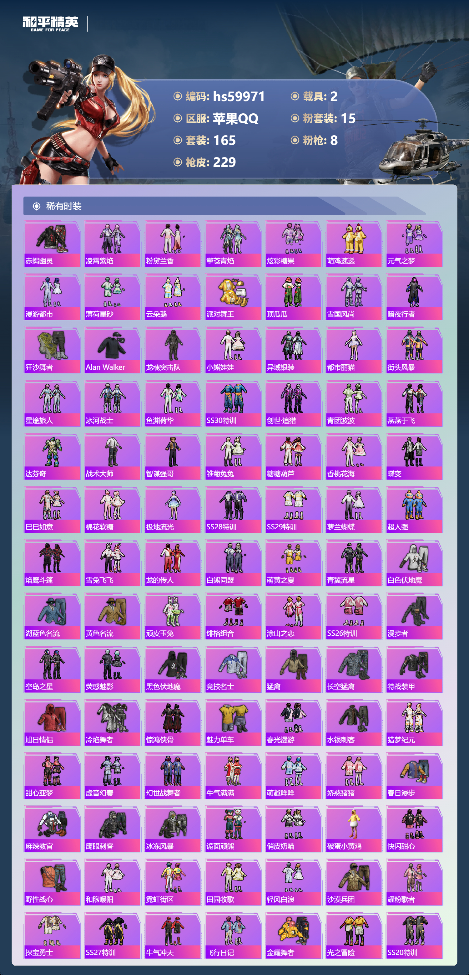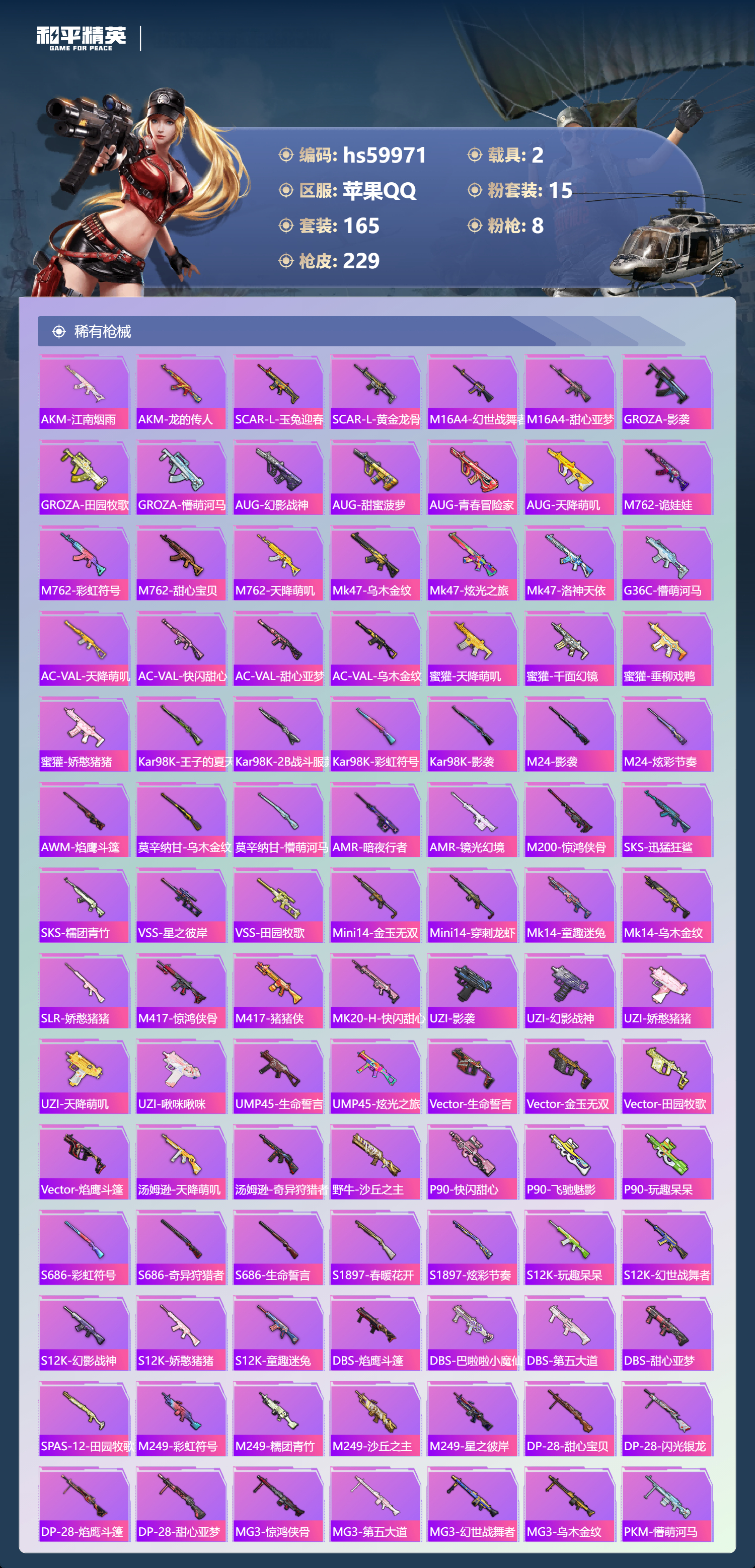 hs59971 苹果手Q-13王牌印记-有战神框-1红装-15粉装-8特效枪-2载具-84561热力值-165套装-229枪皮-2卓越印记