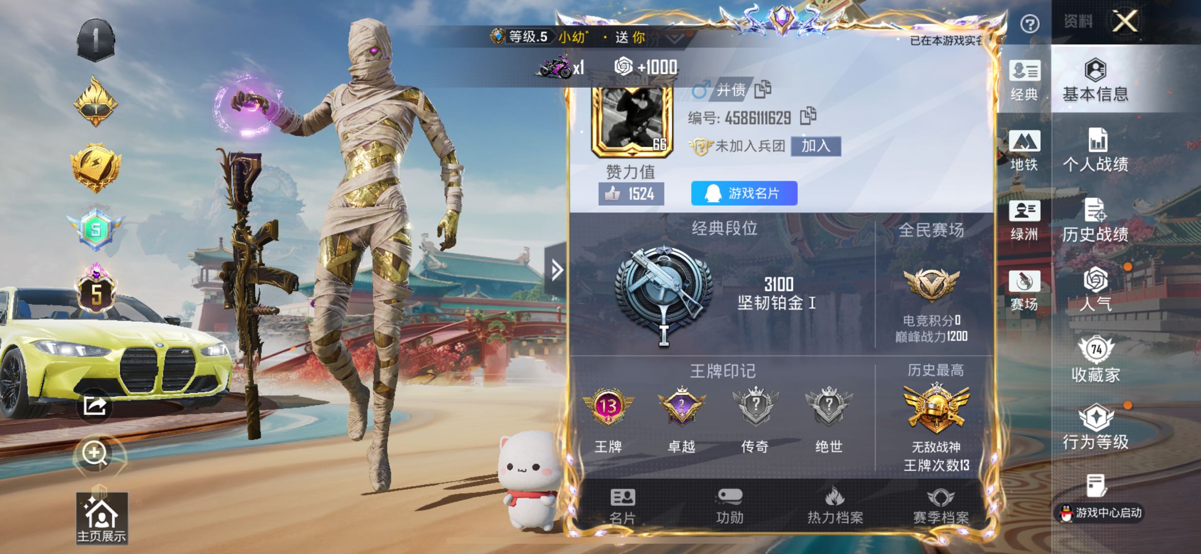 13王牌印记-有战神框-1红装-15粉装-8特效枪-2载具-84561热力值-165套装-229枪皮-2卓越印记