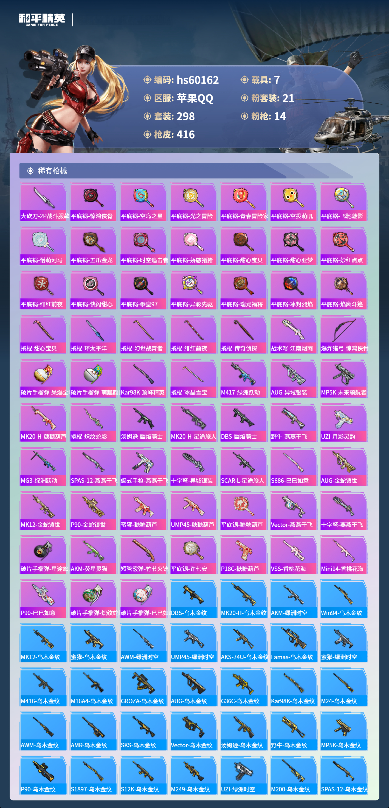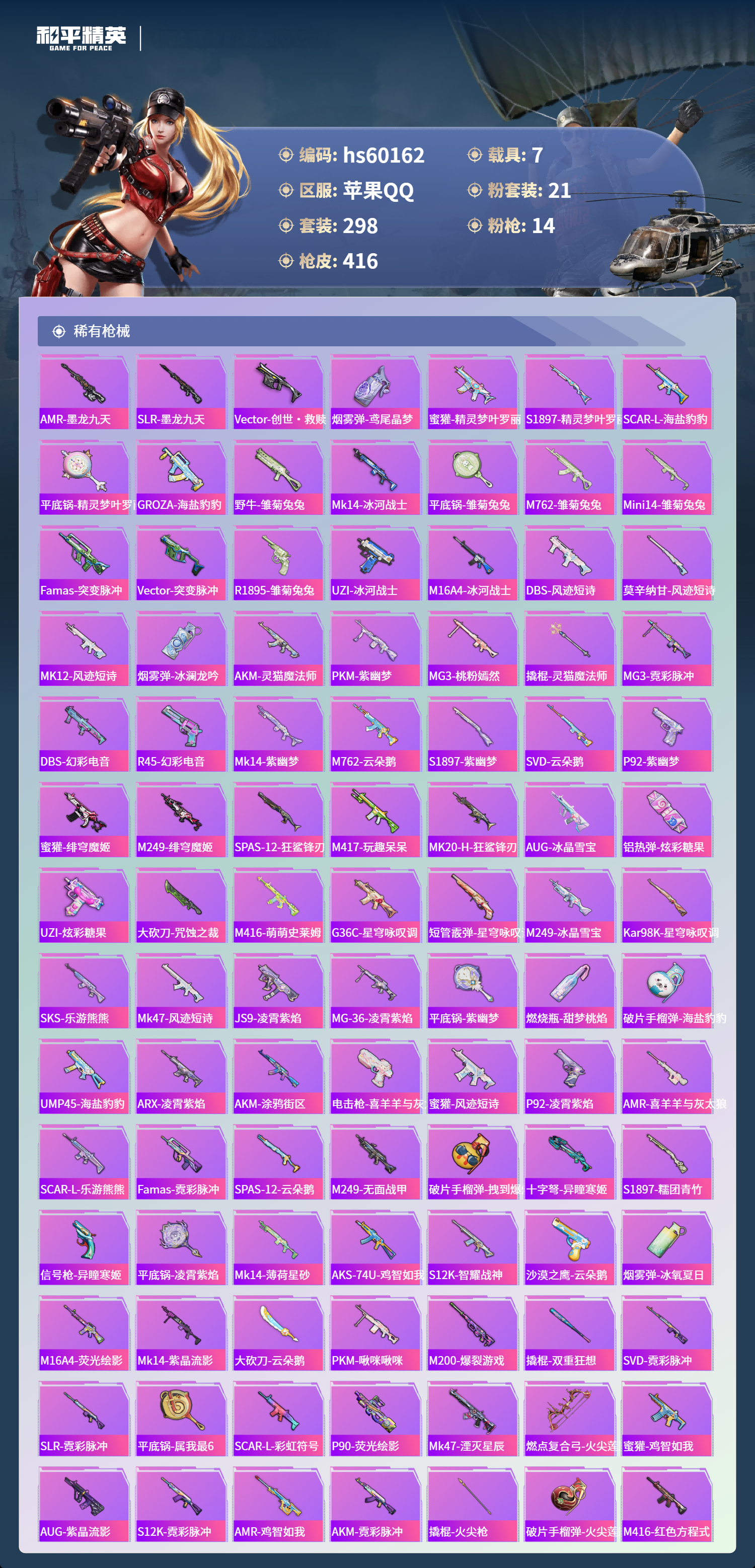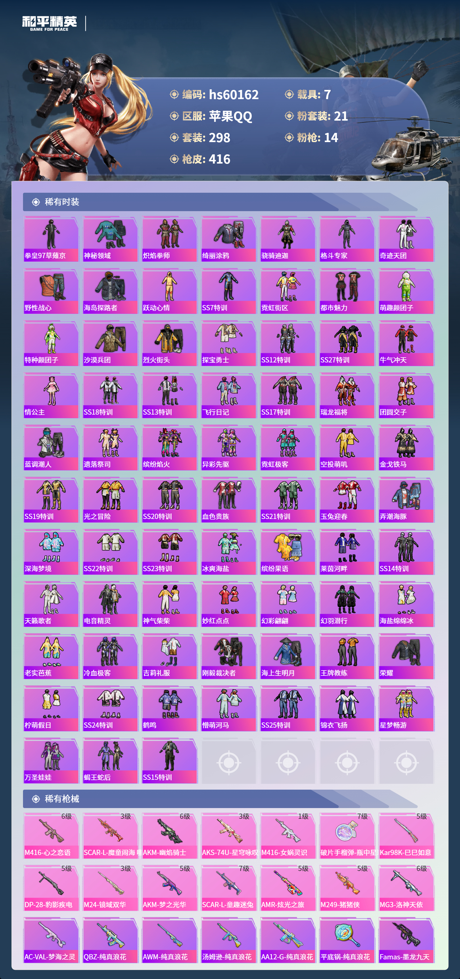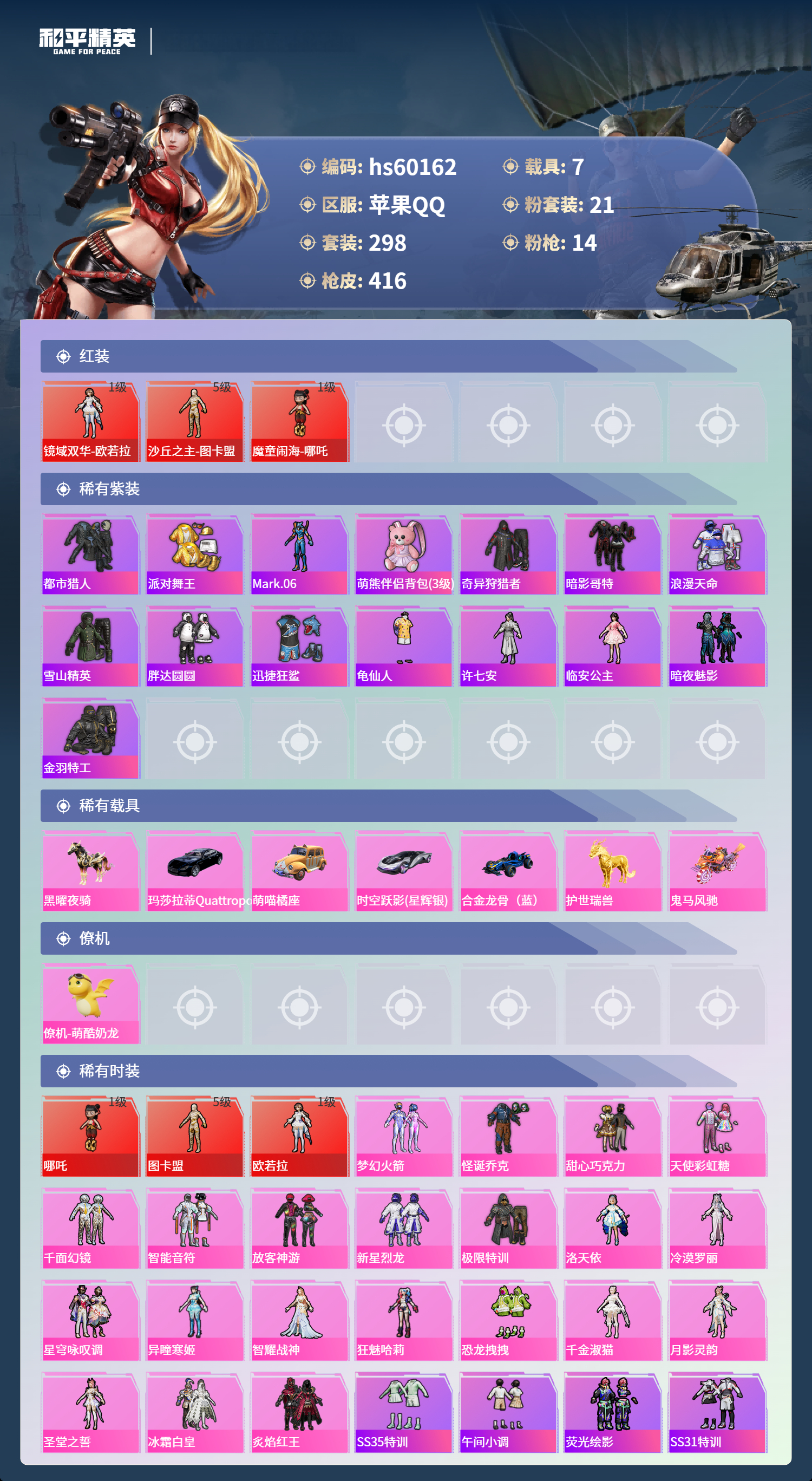 hs60162 苹果手Q-19王牌印记-有战神框-3红装-21粉装-14特效枪-7载具-热力值-298套装-416枪皮-5卓越印记-3传奇印记