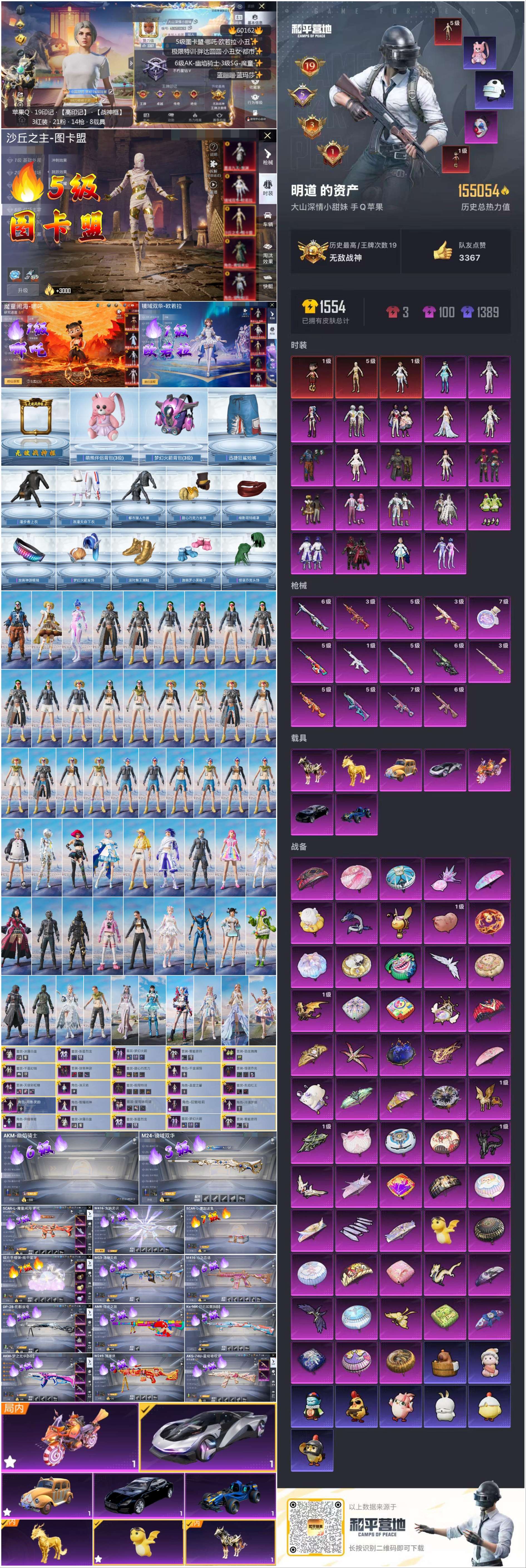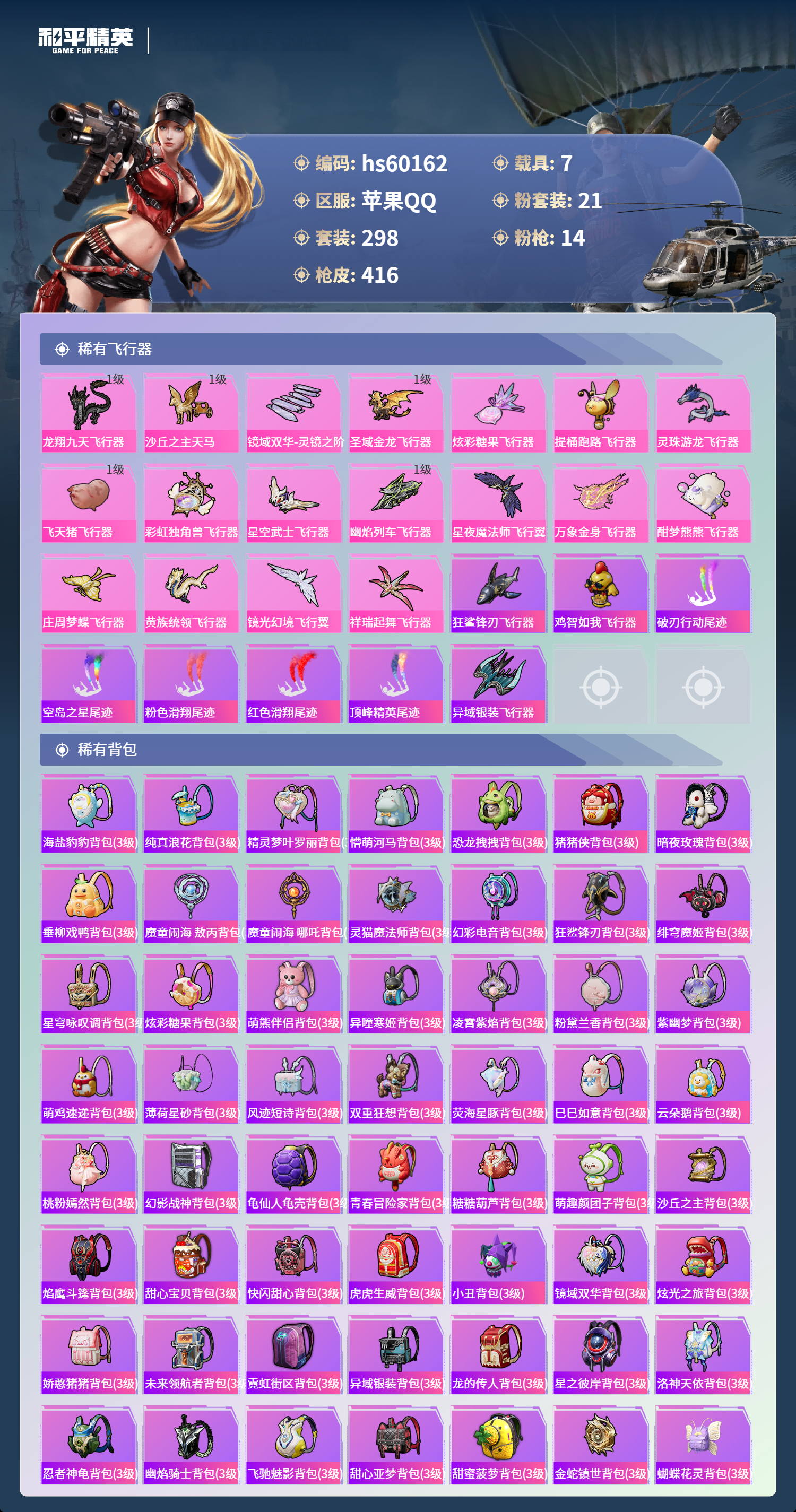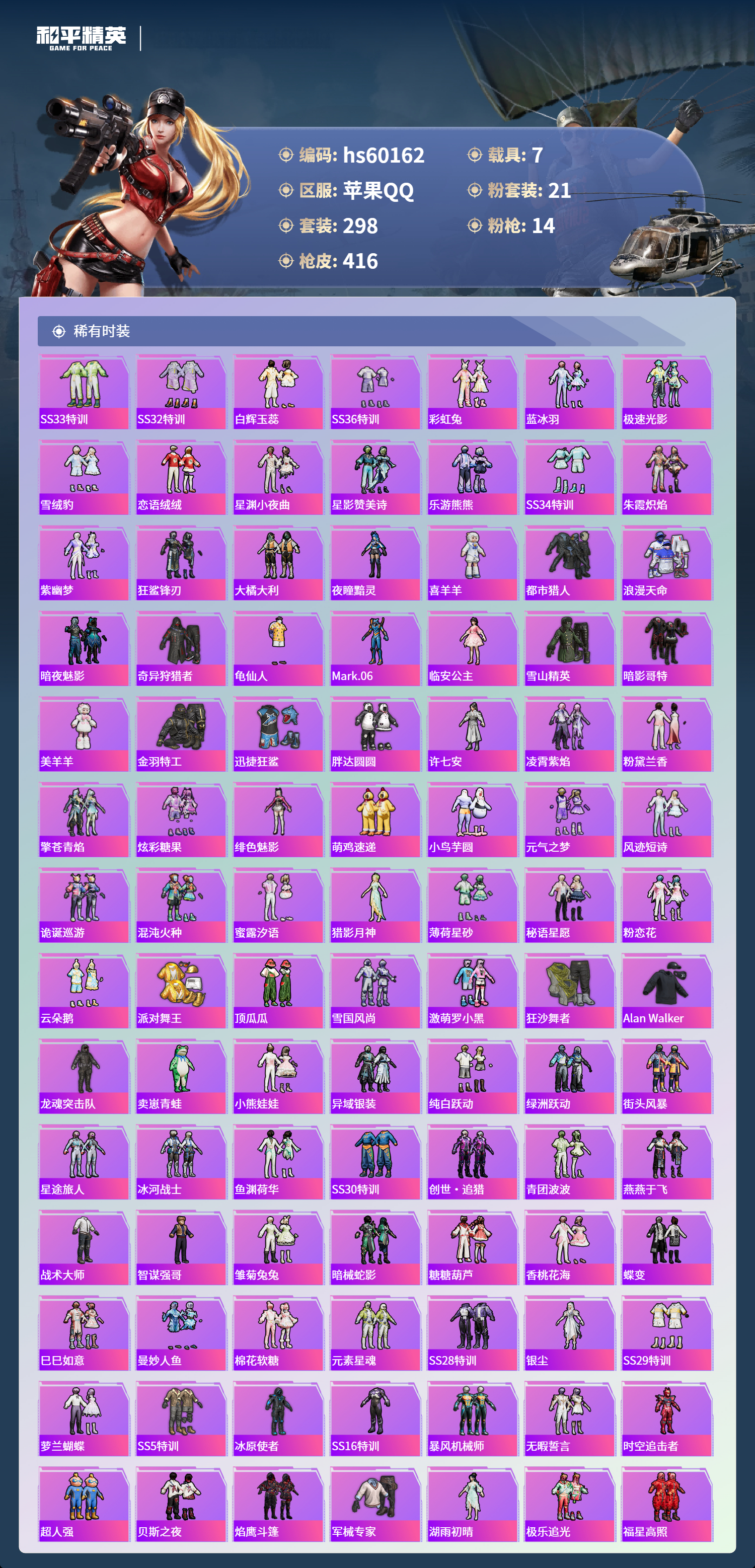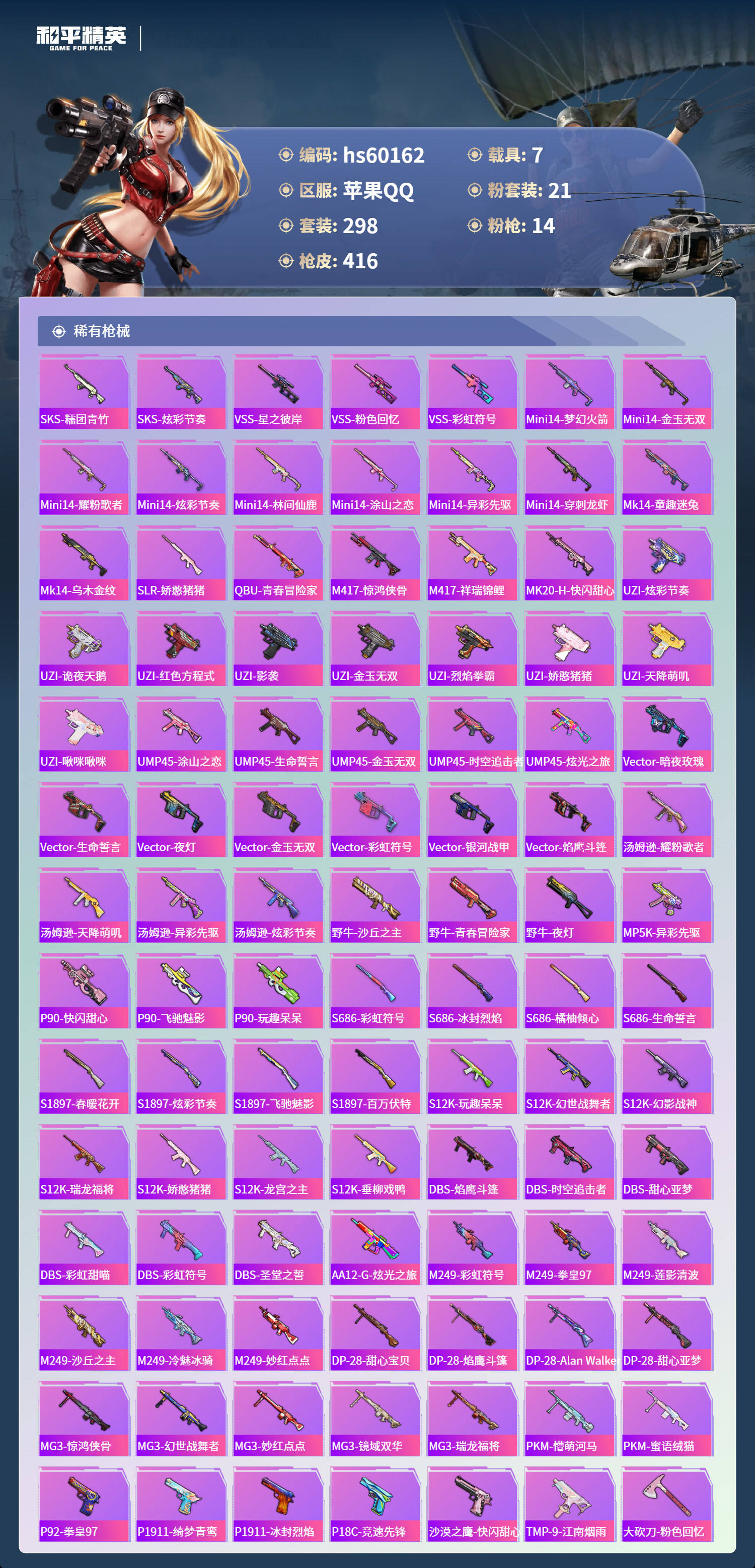 hs60162 苹果手Q-19王牌印记-有战神框-3红装-21粉装-14特效枪-7载具-热力值-298套装-416枪皮-5卓越印记-3传奇印记