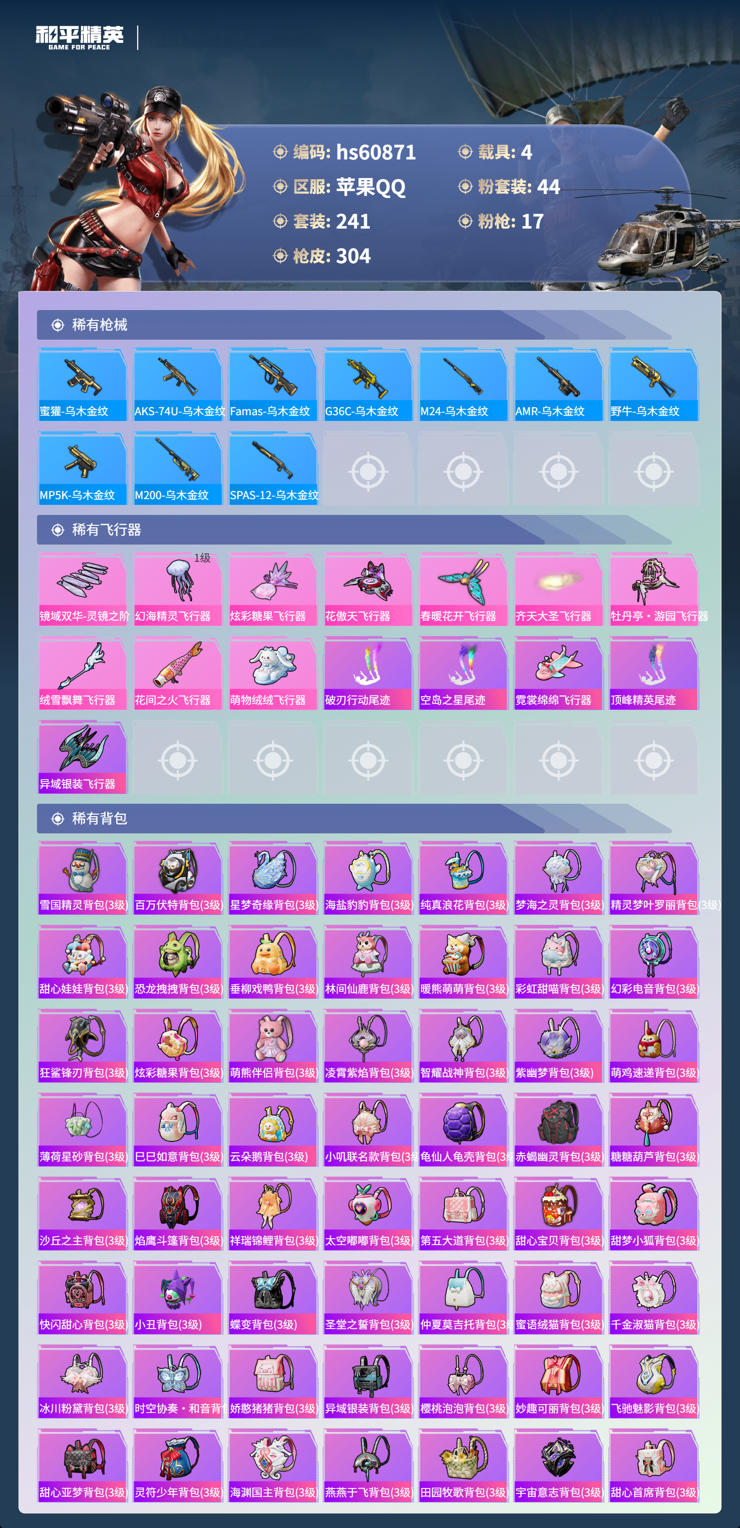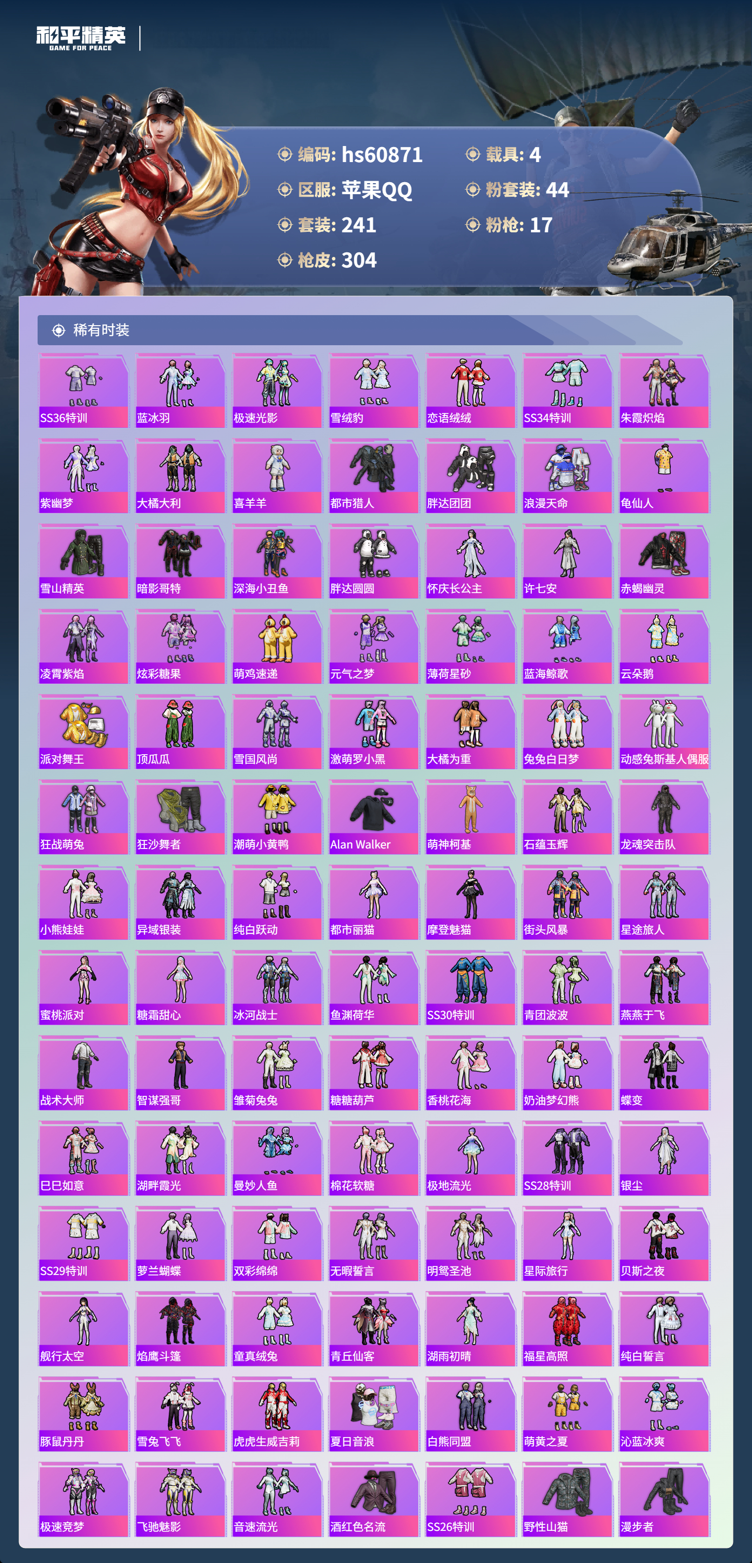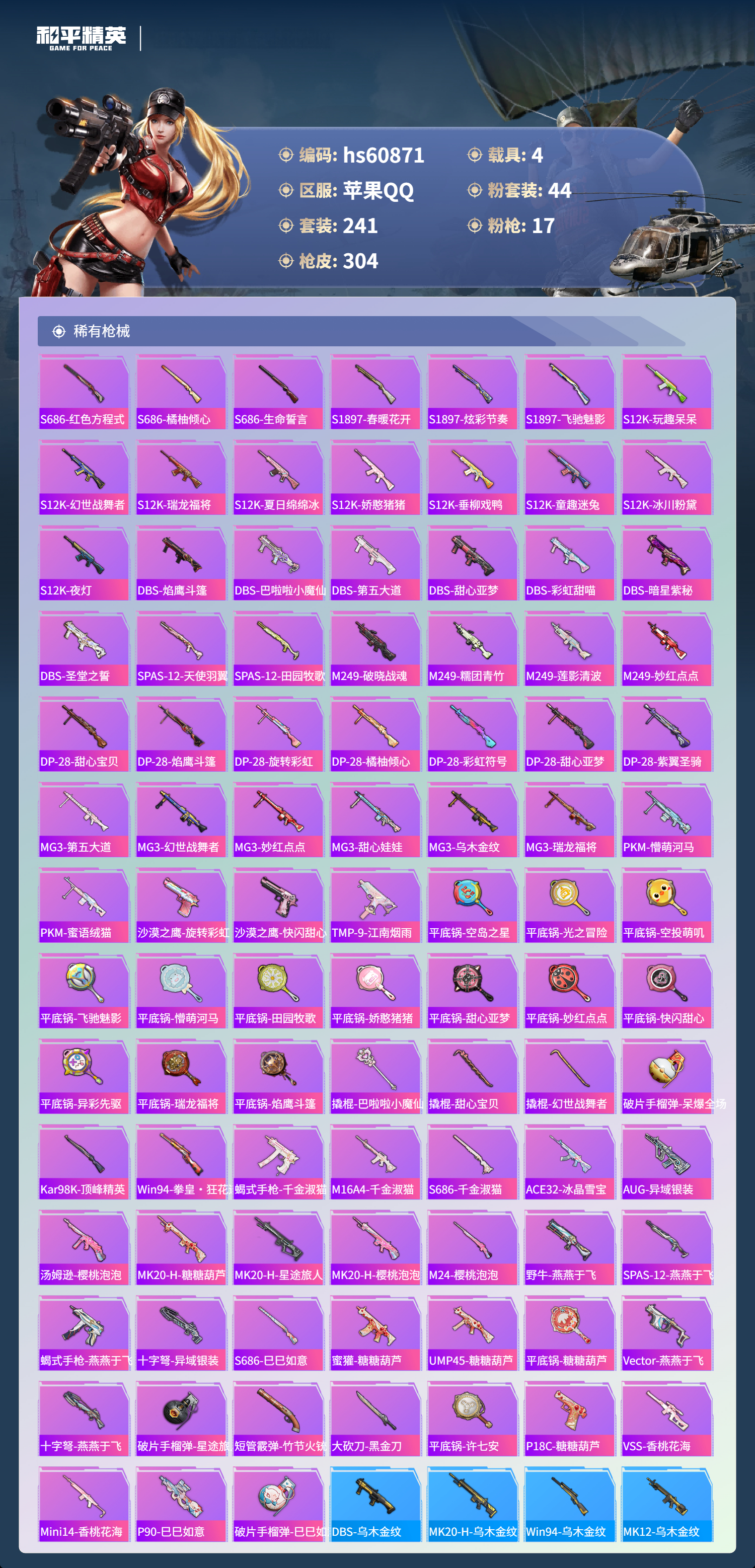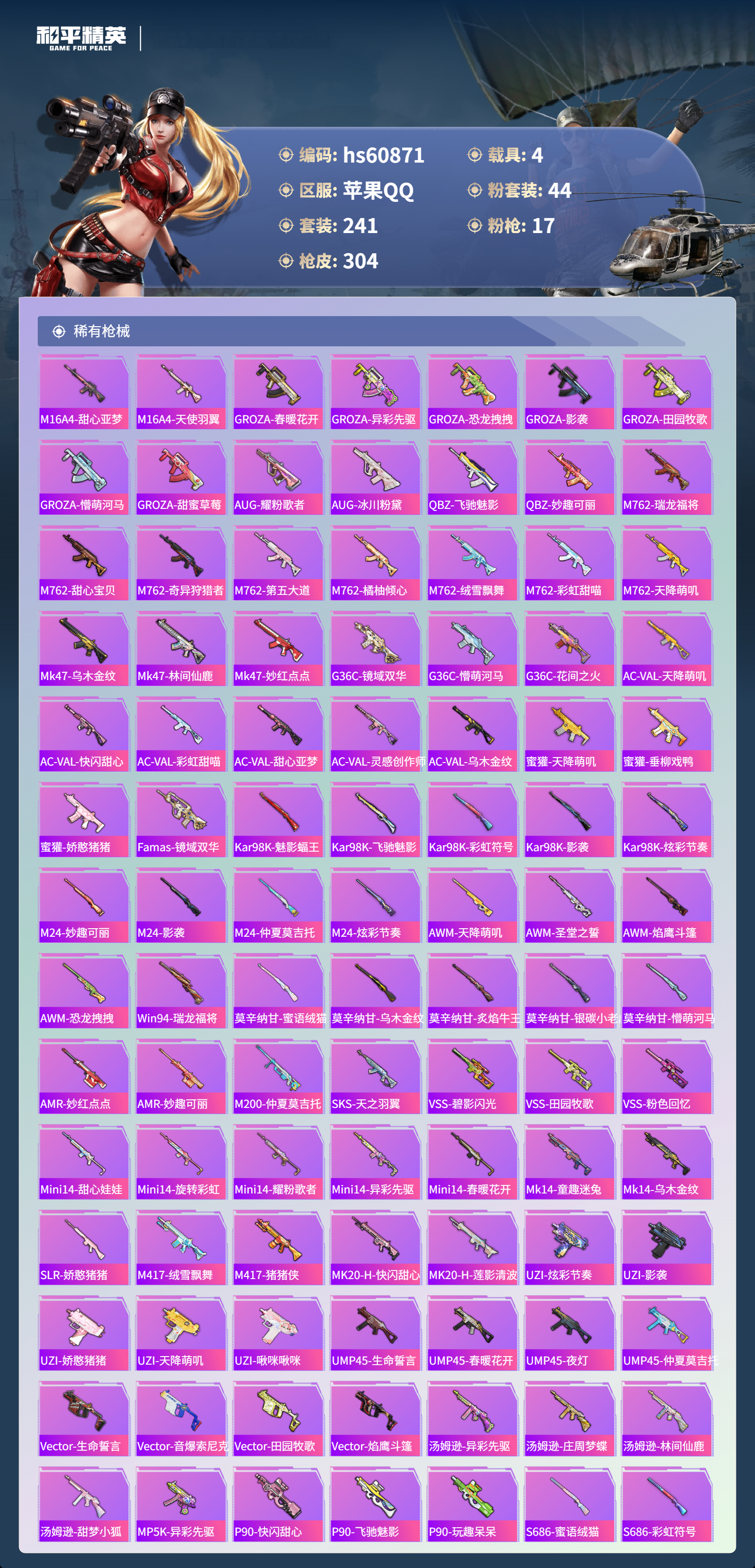 hs60871 苹果手Q-17王牌印记-1红装-44粉装-17特效枪-4载具-热力值-241套装-304枪皮-5卓越印记-2传奇印记